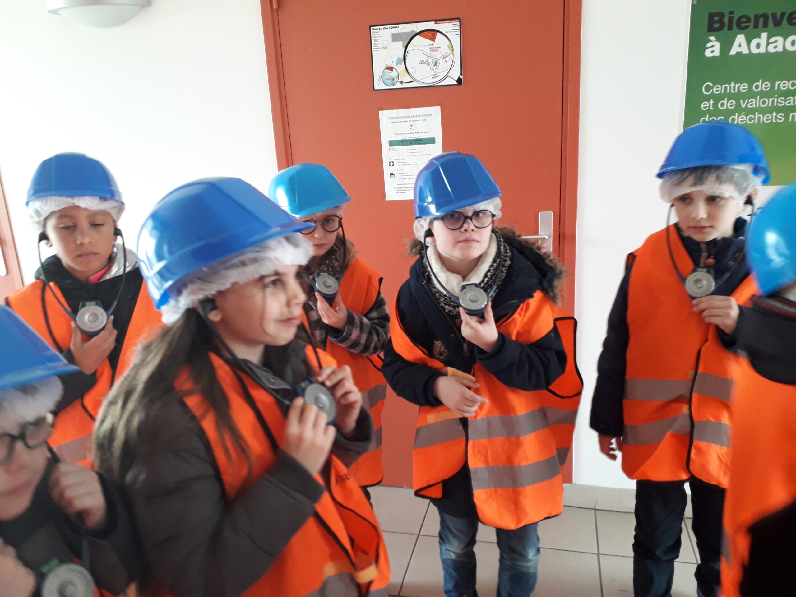 Munis d’une charlotte, d’un casque de chantier et d’écouteurs audio, nous avons suivi la visite d’un hall du centre de tri, celui des poubelles jaunes, avec Odile, notre guide.