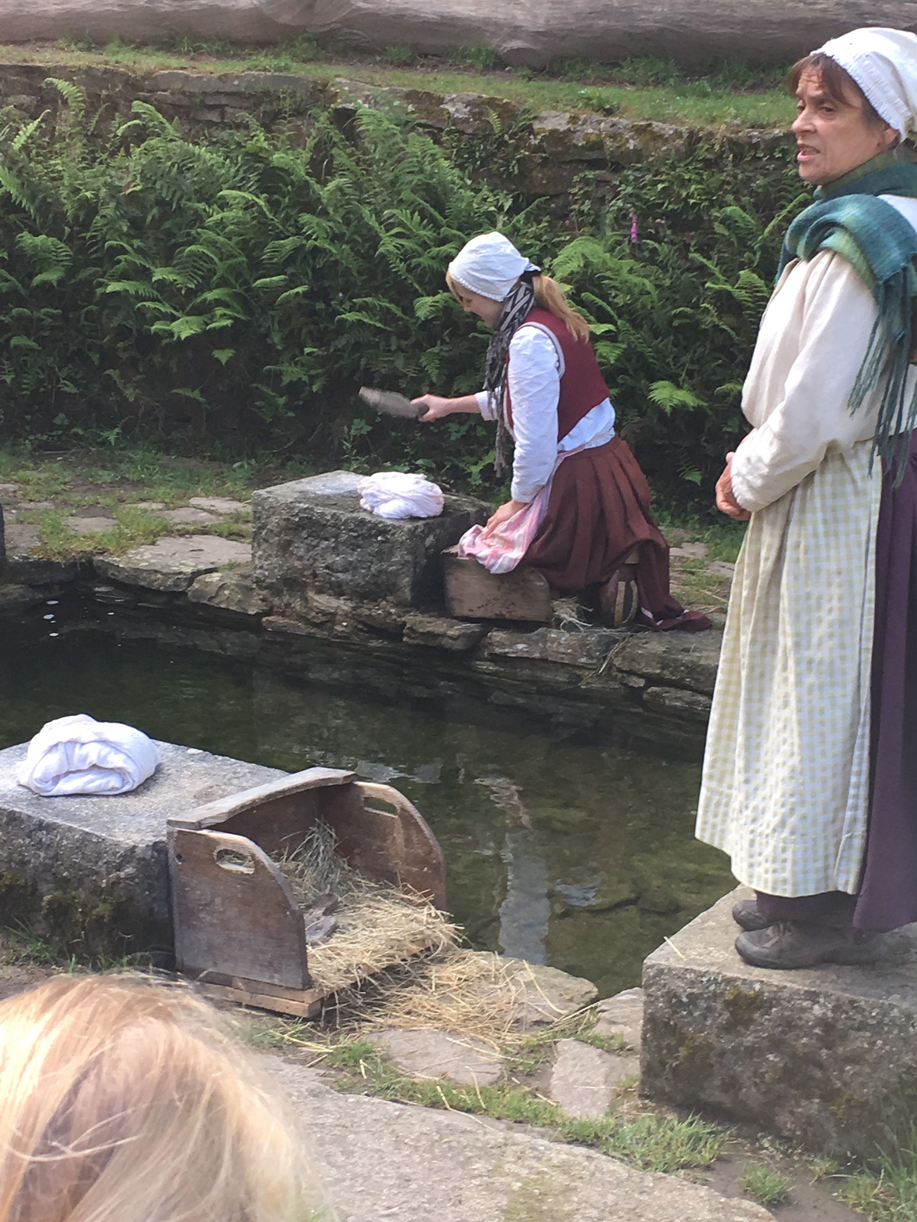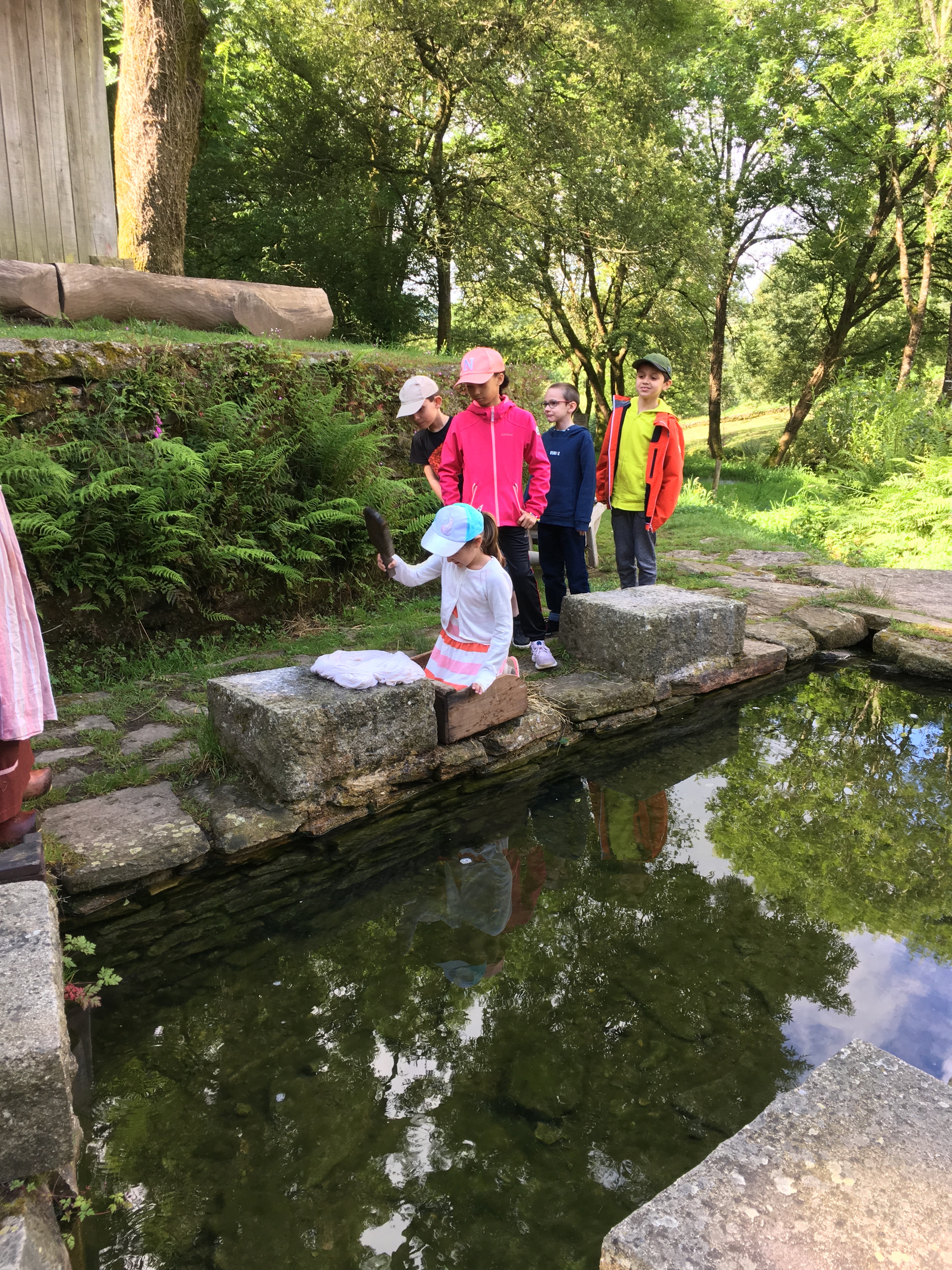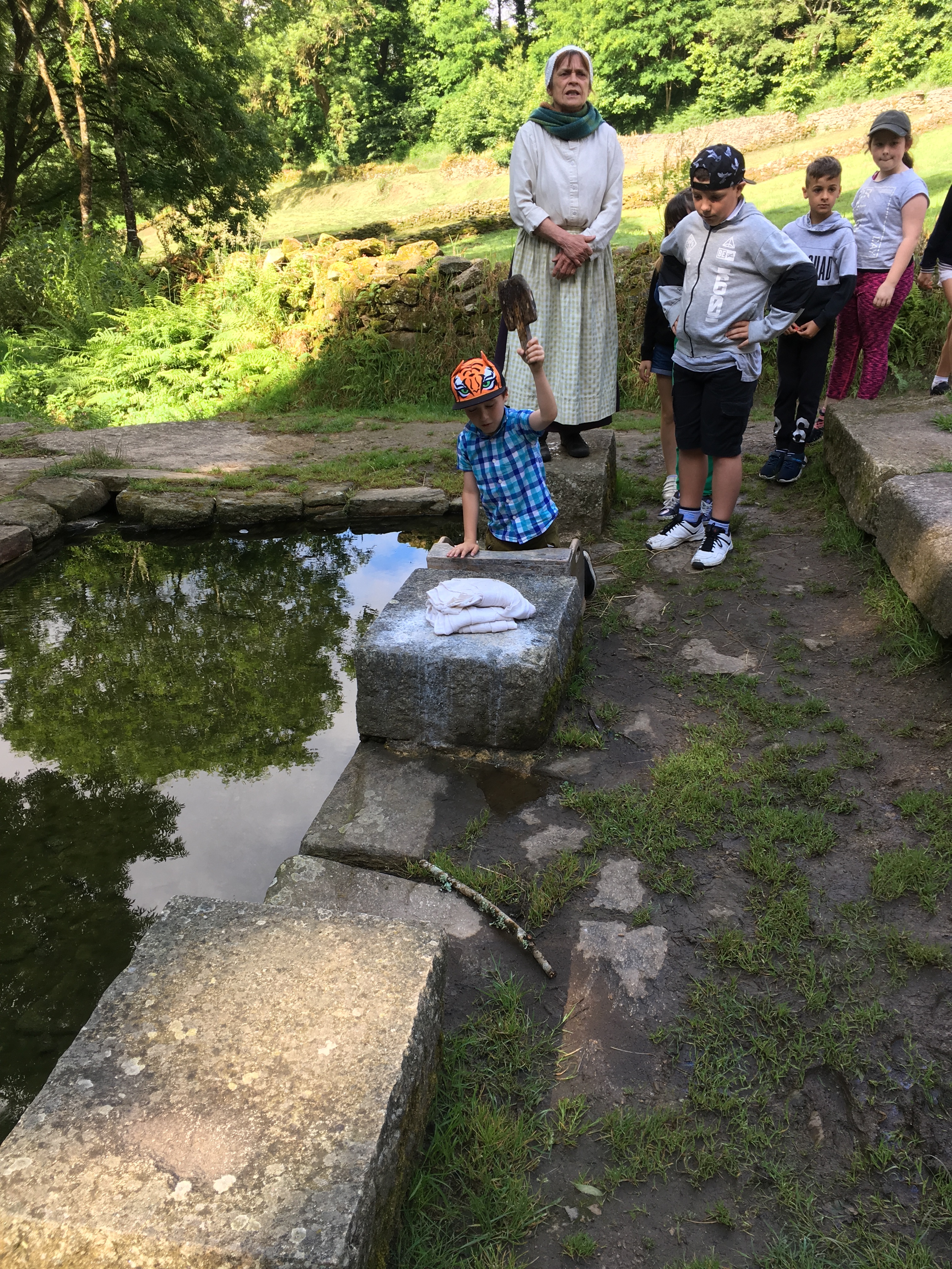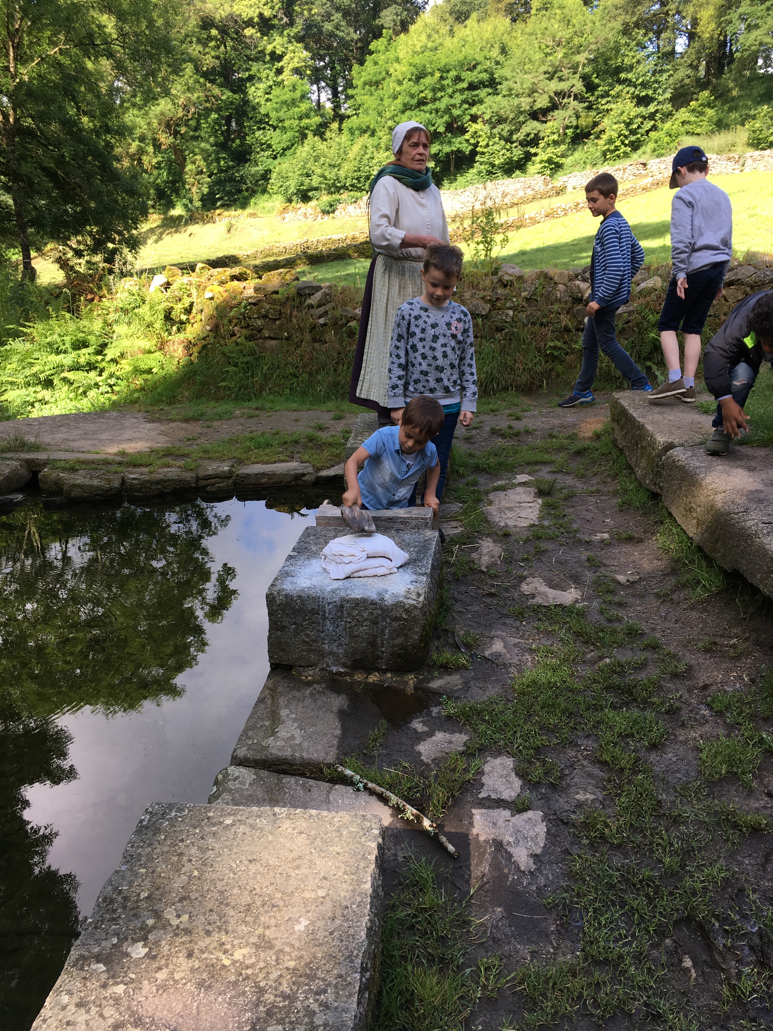 Nous avons été accueillis par « La Eugénie » qui nous a présenté, avec « La Rozenn », le travail des lavandières. Chacun a pu battre le linge bien installé dans un « carrosse ».