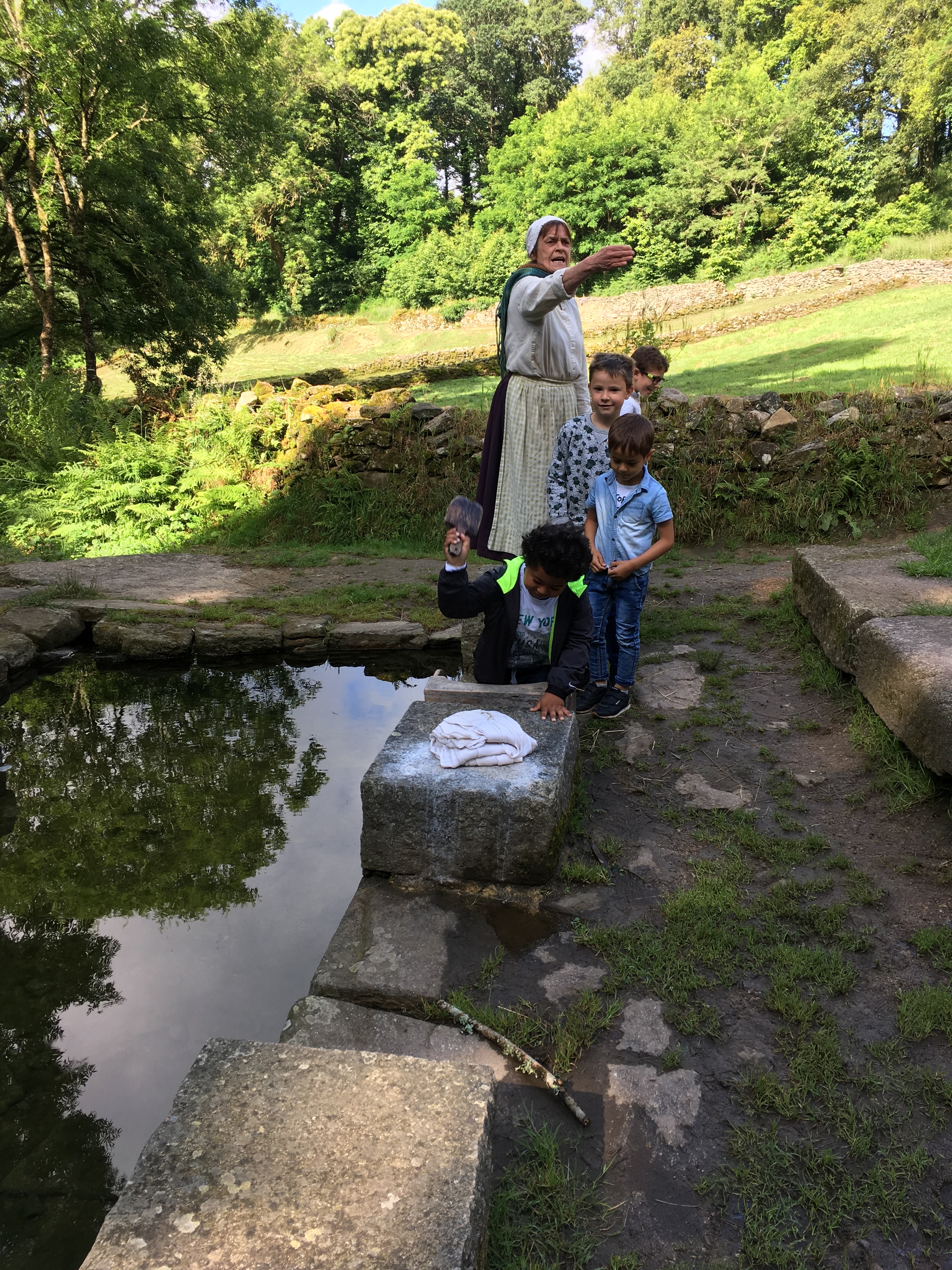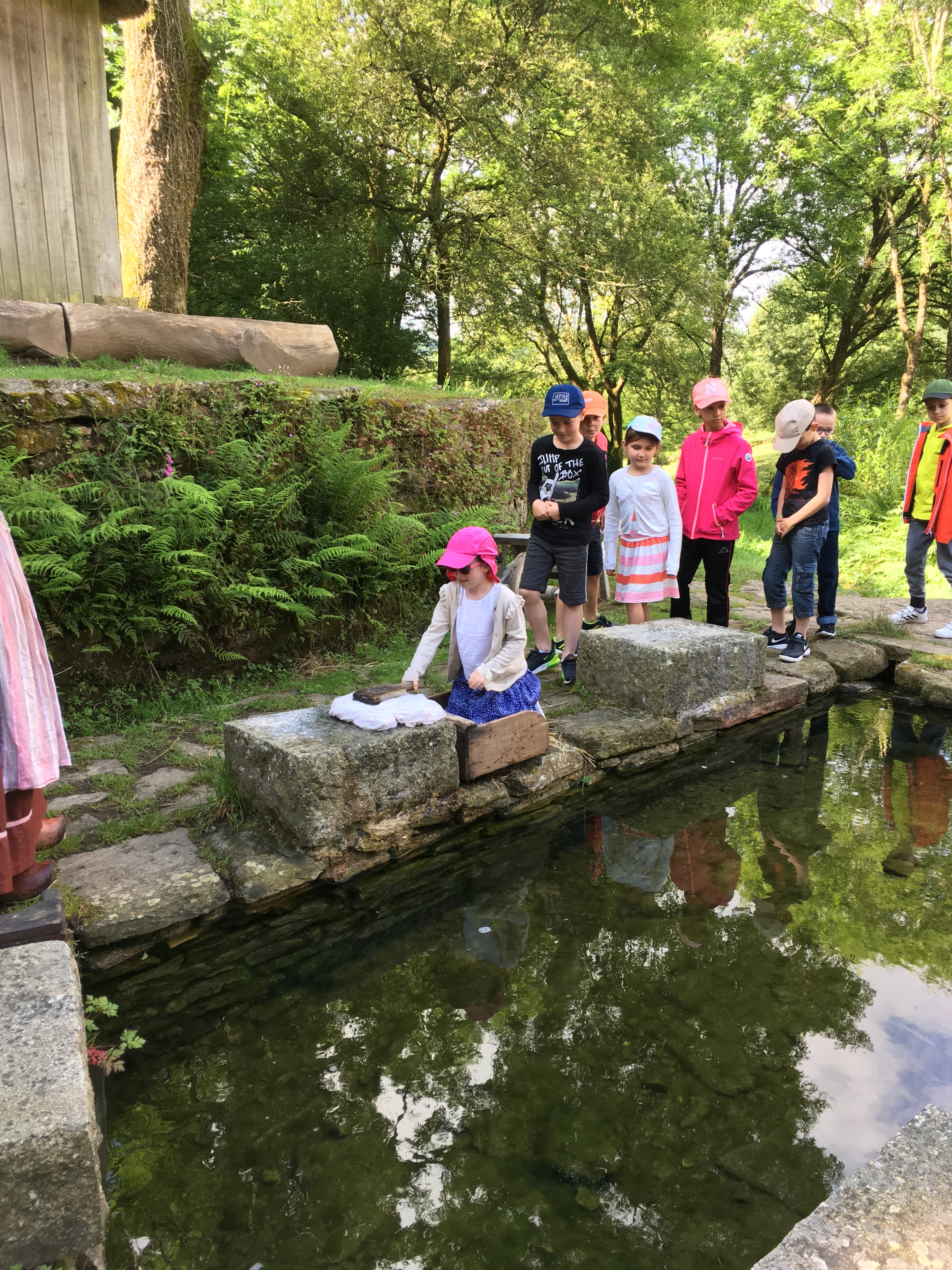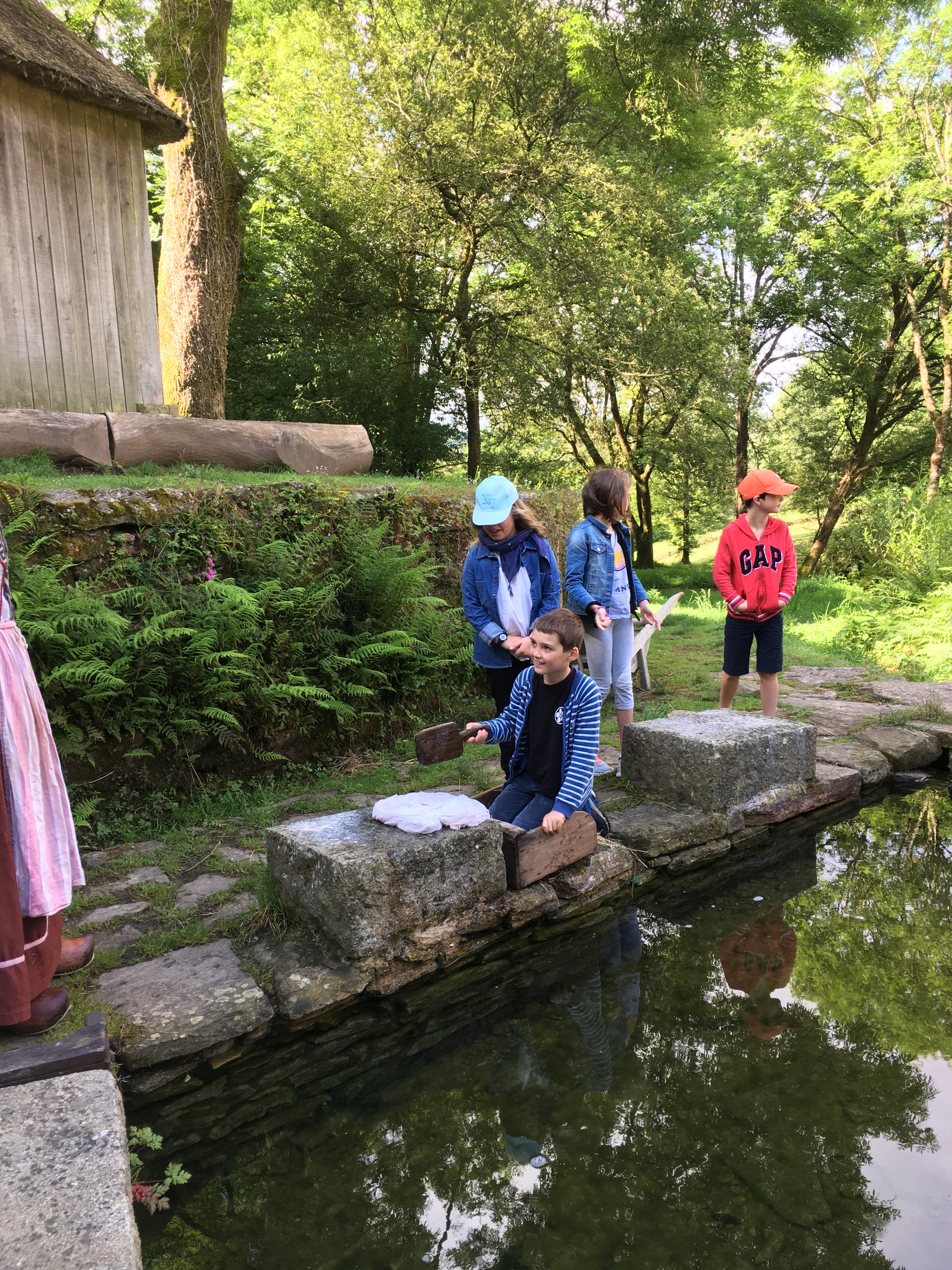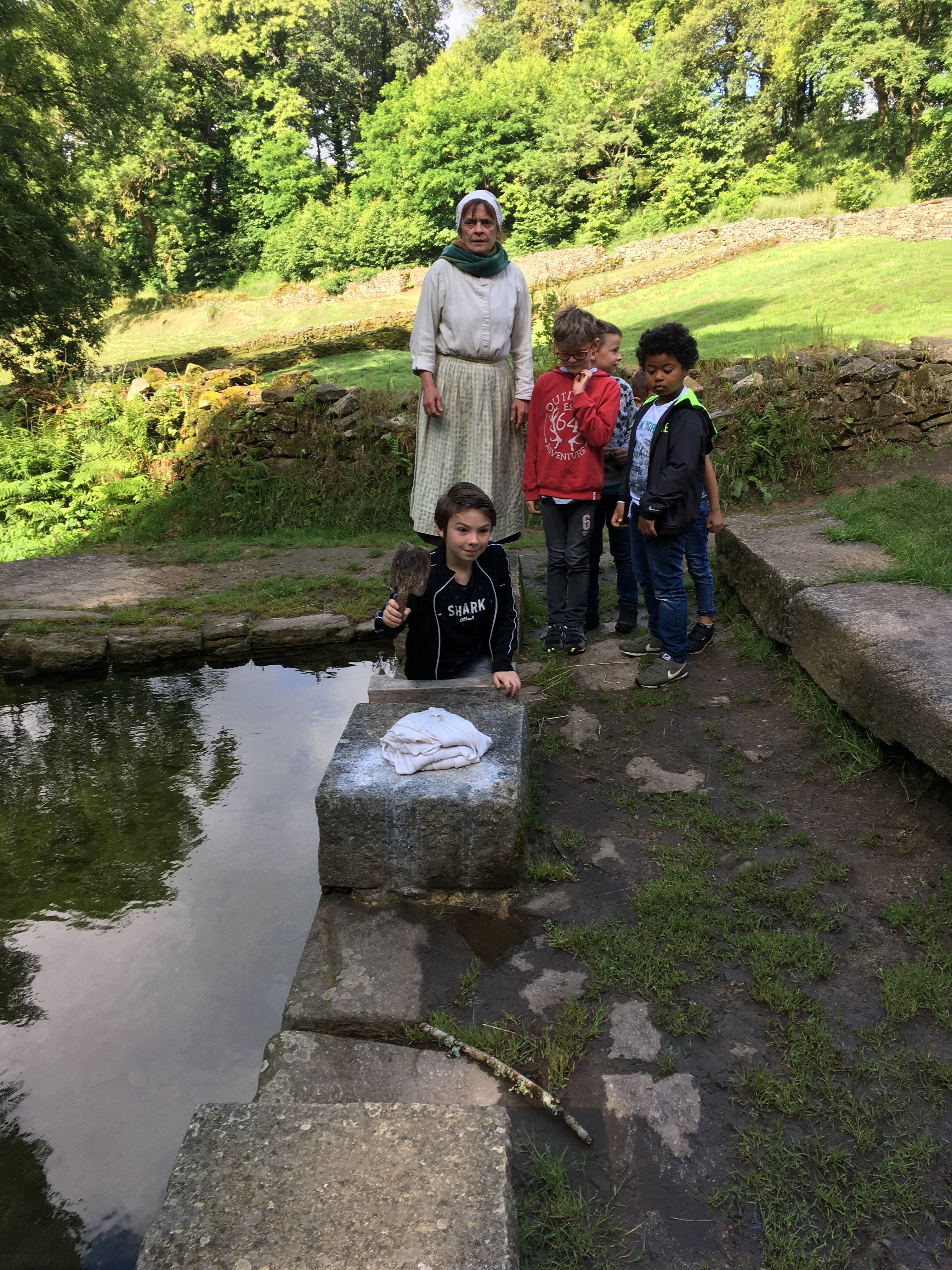 Nous avons été accueillis par « La Eugénie » qui nous a présenté, avec « La Rozenn », le travail des lavandières. Chacun a pu battre le linge bien installé dans un « carrosse ».