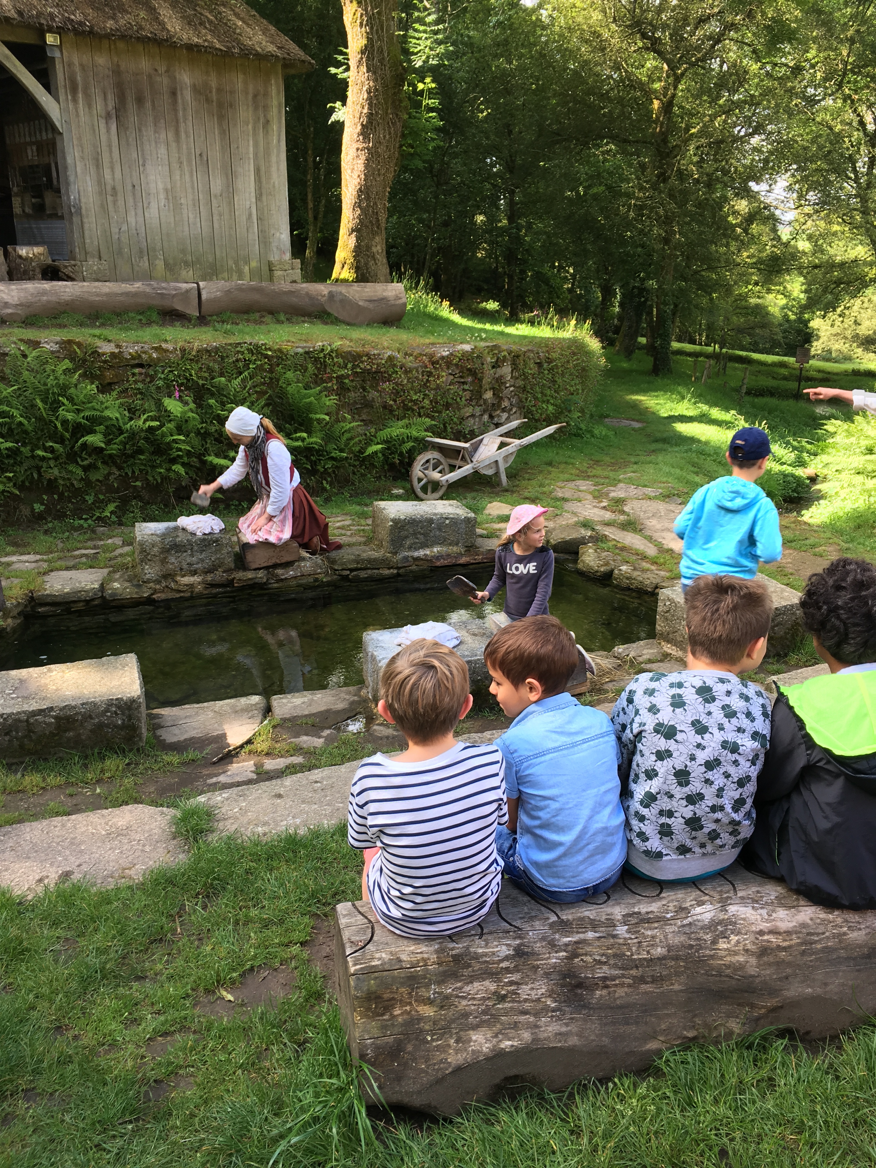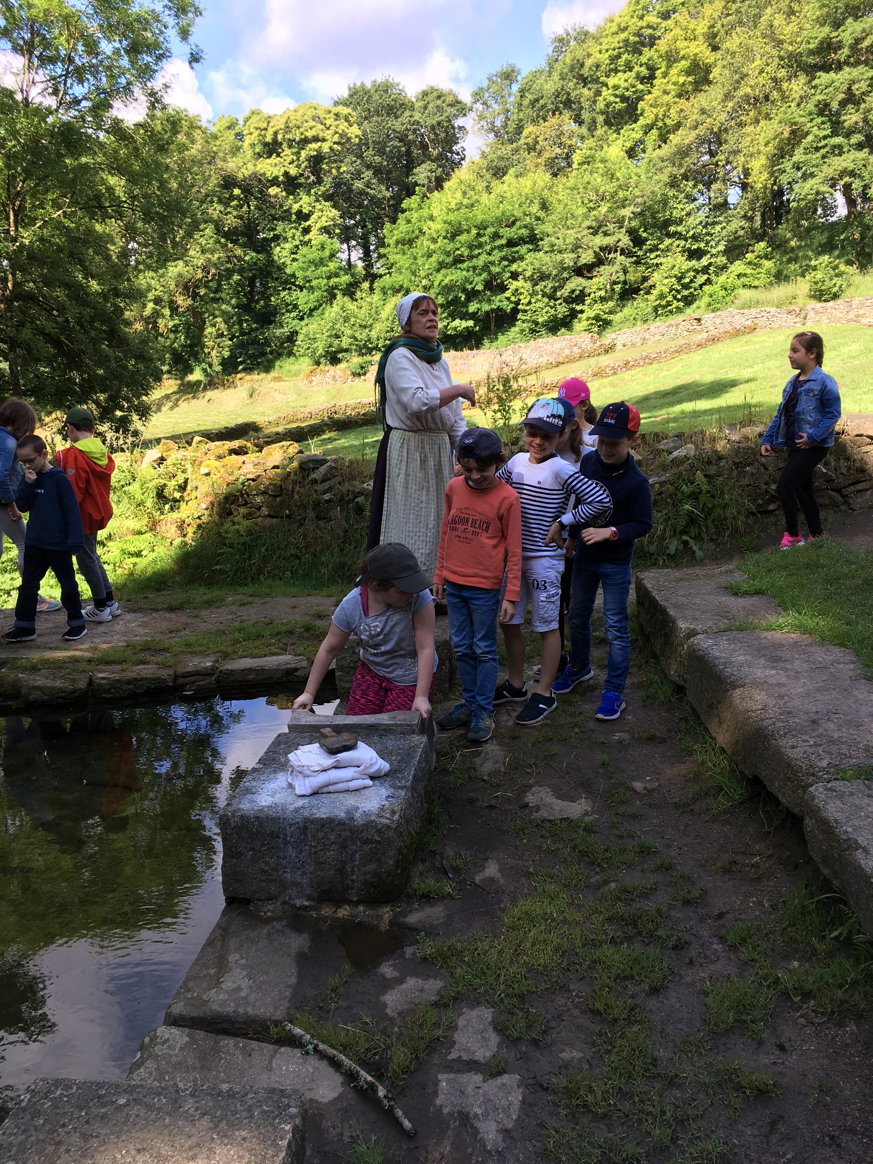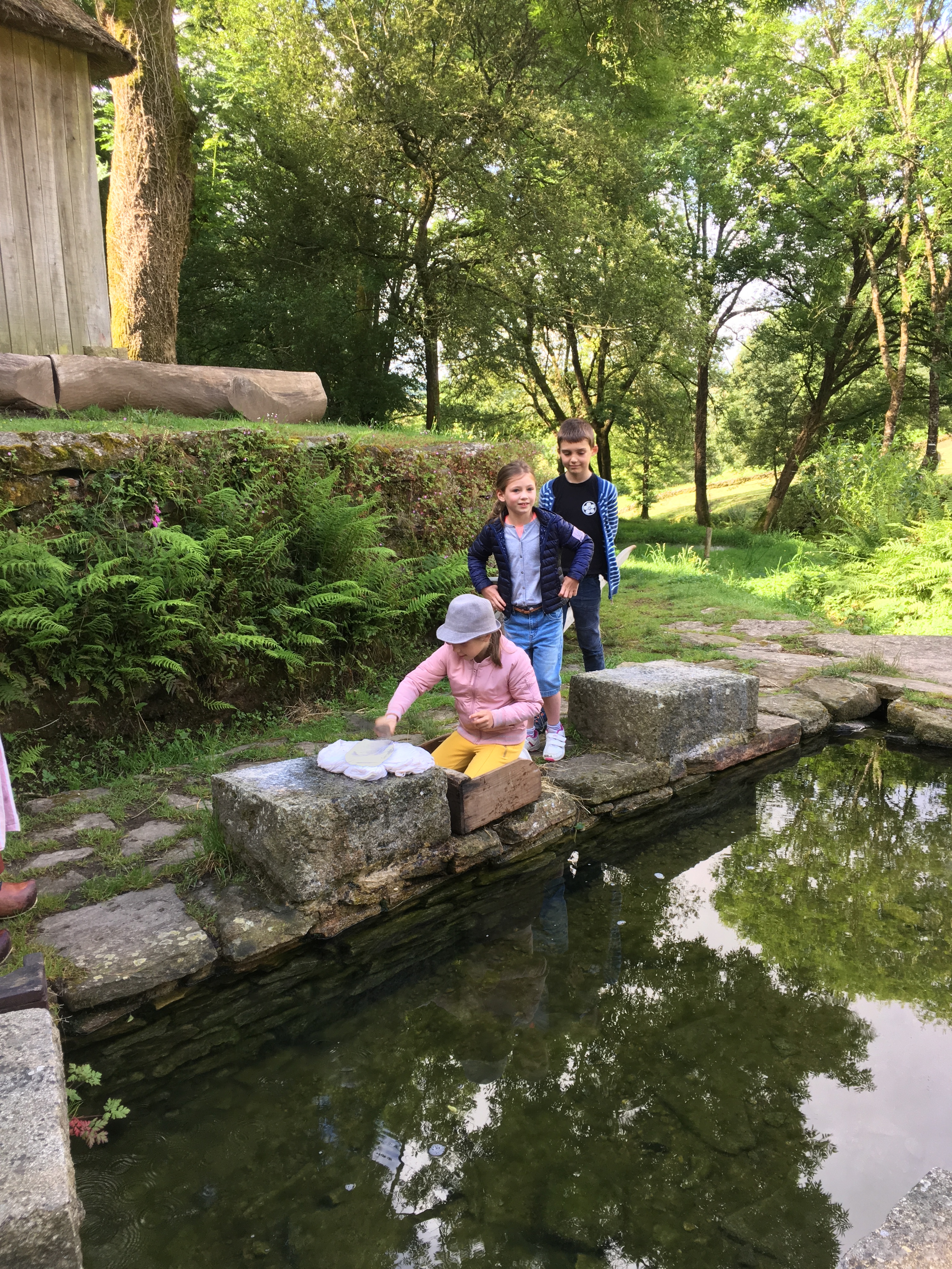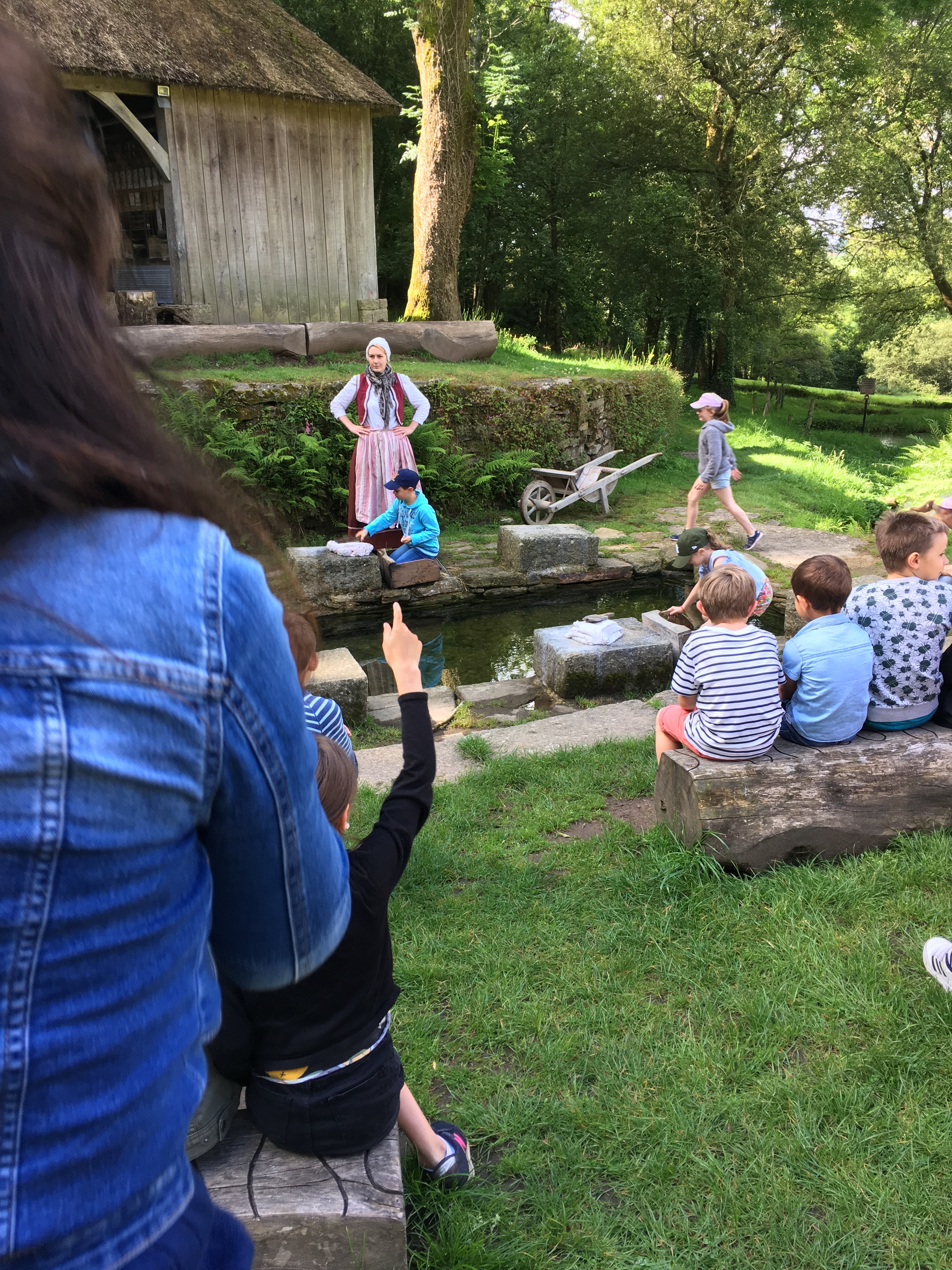 Nous avons été accueillis par « La Eugénie » qui nous a présenté, avec « La Rozenn », le travail des lavandières. Chacun a pu battre le linge bien installé dans un « carrosse ».