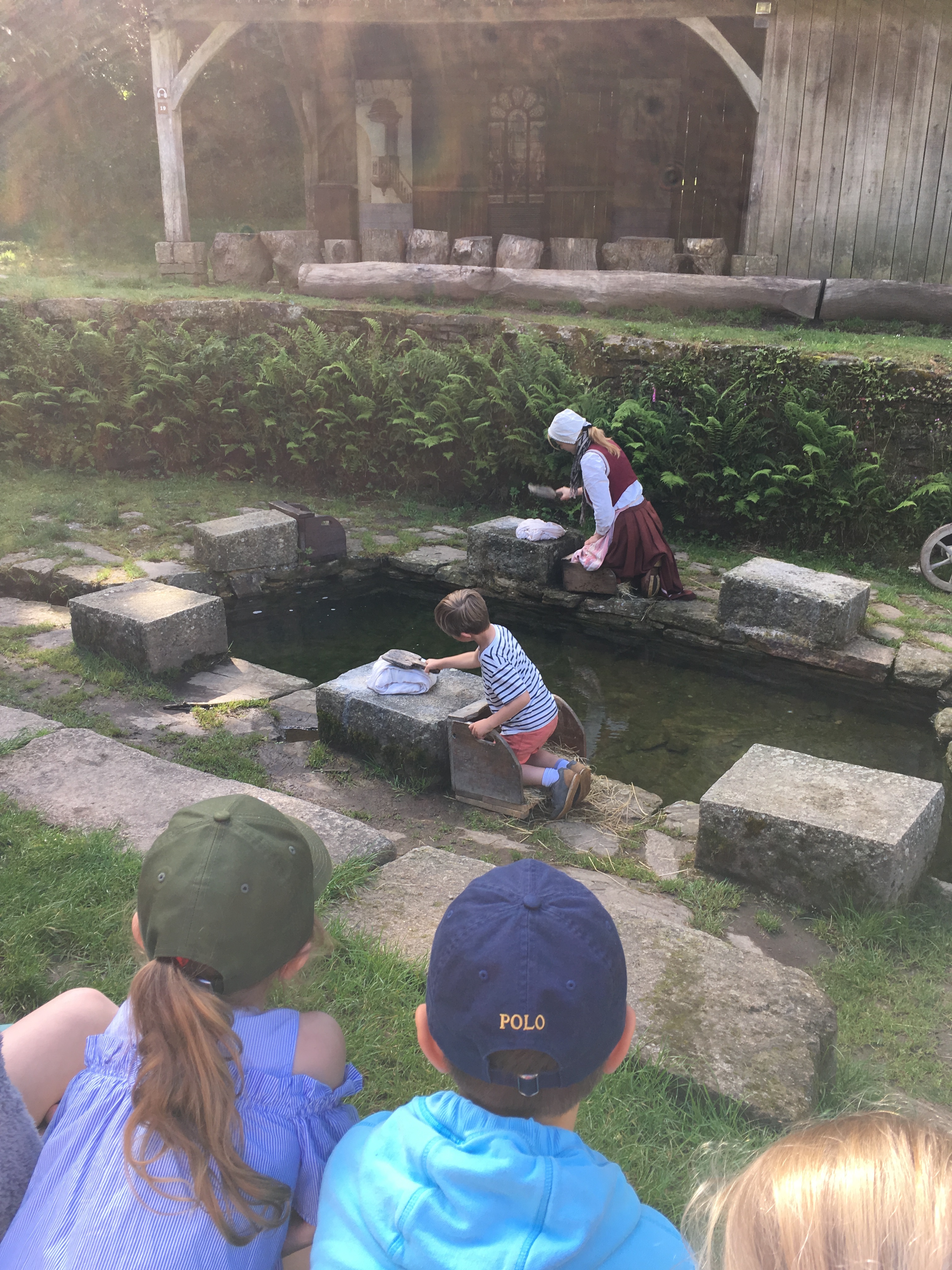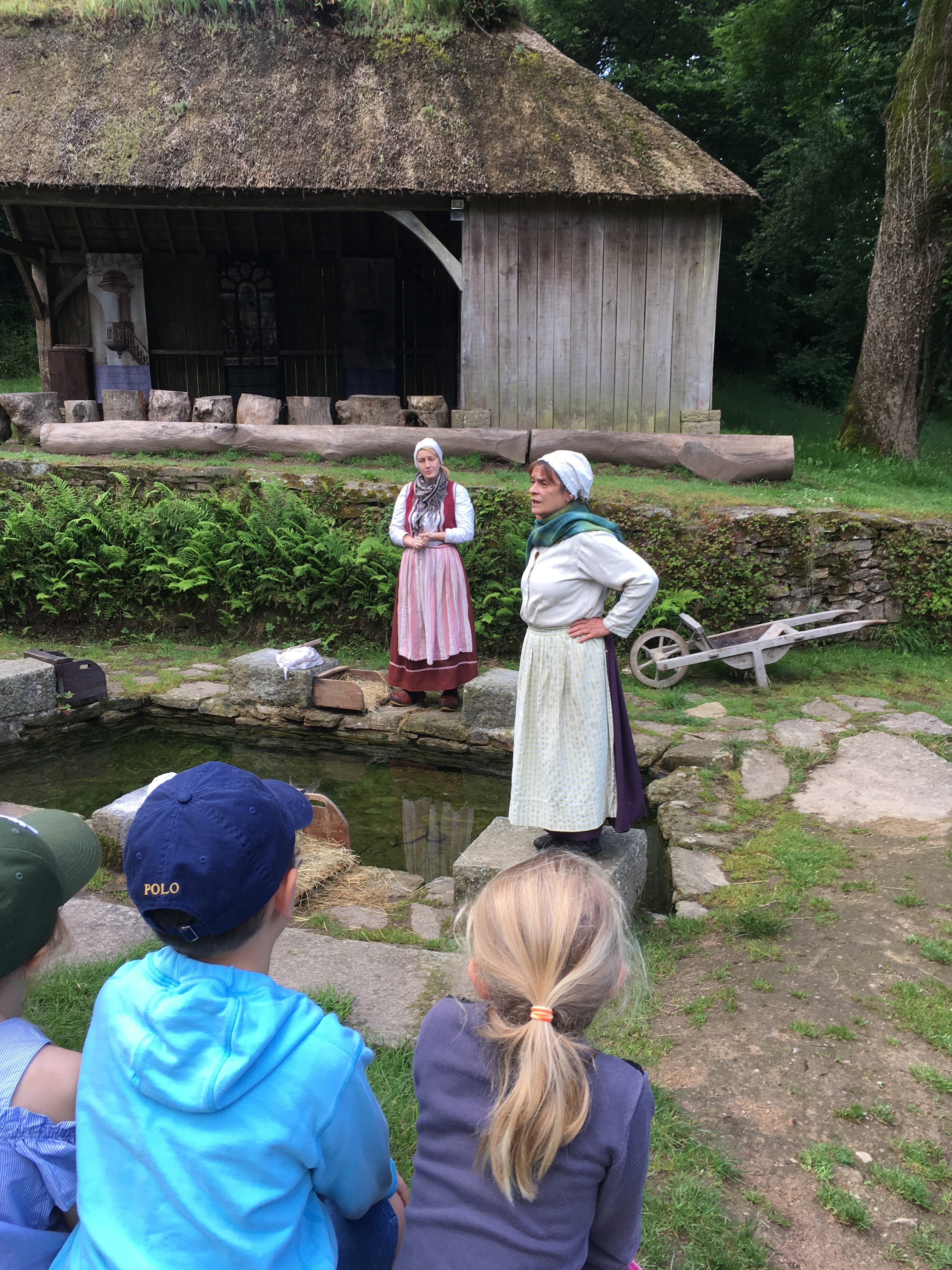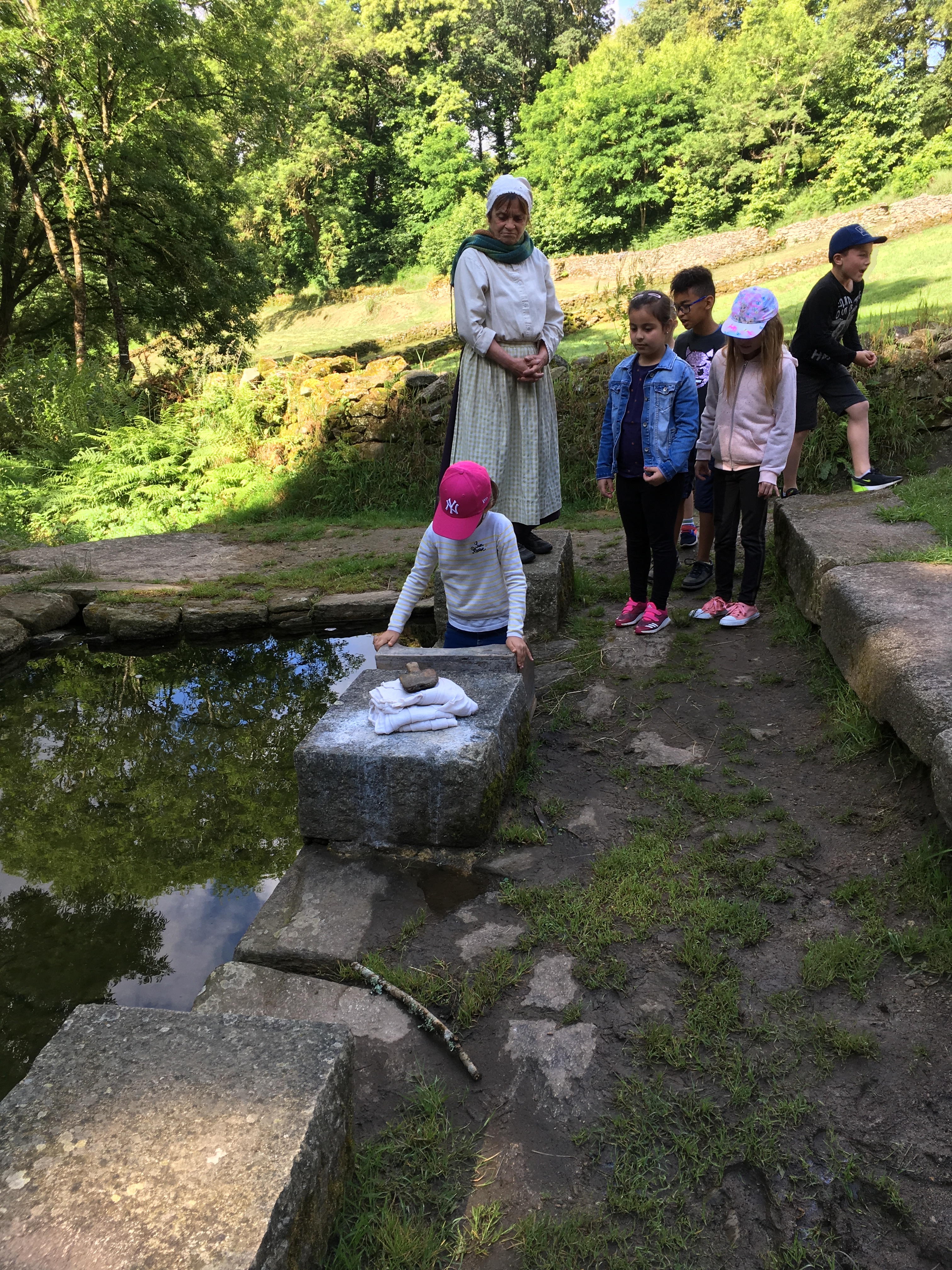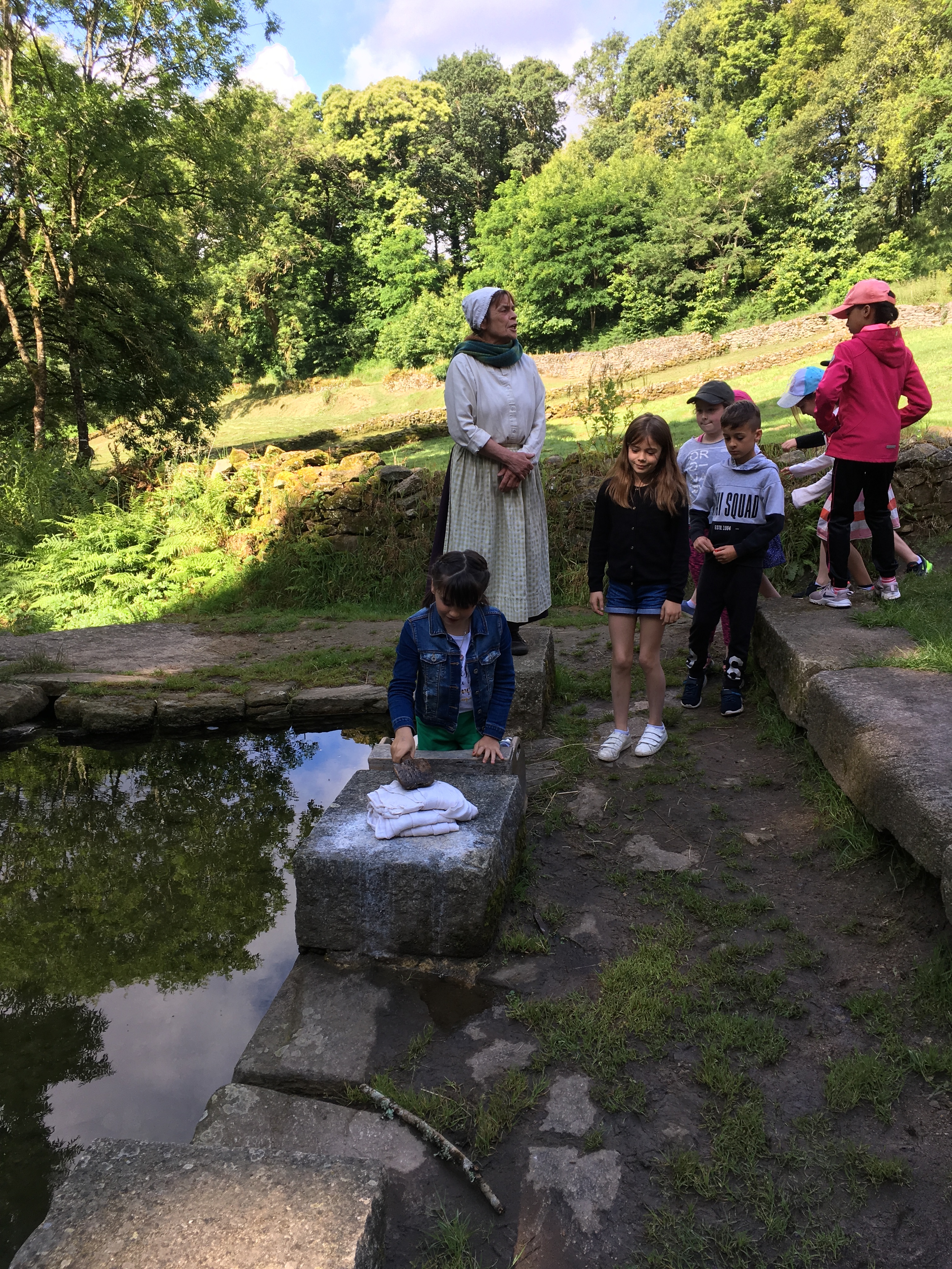 Nous avons été accueillis par « La Eugénie » qui nous a présenté, avec « La Rozenn », le travail des lavandières. Chacun a pu battre le linge bien installé dans un « carrosse ».