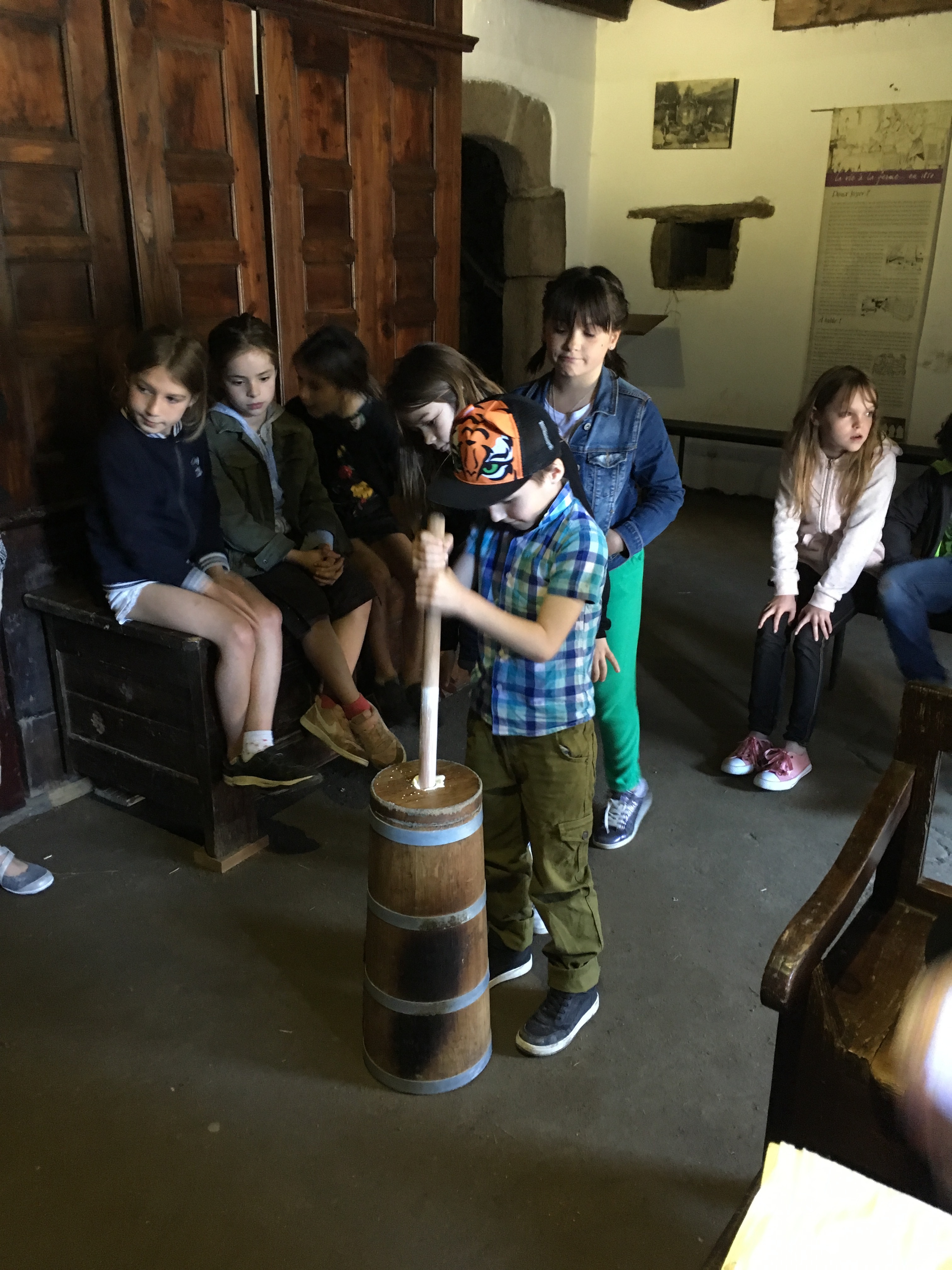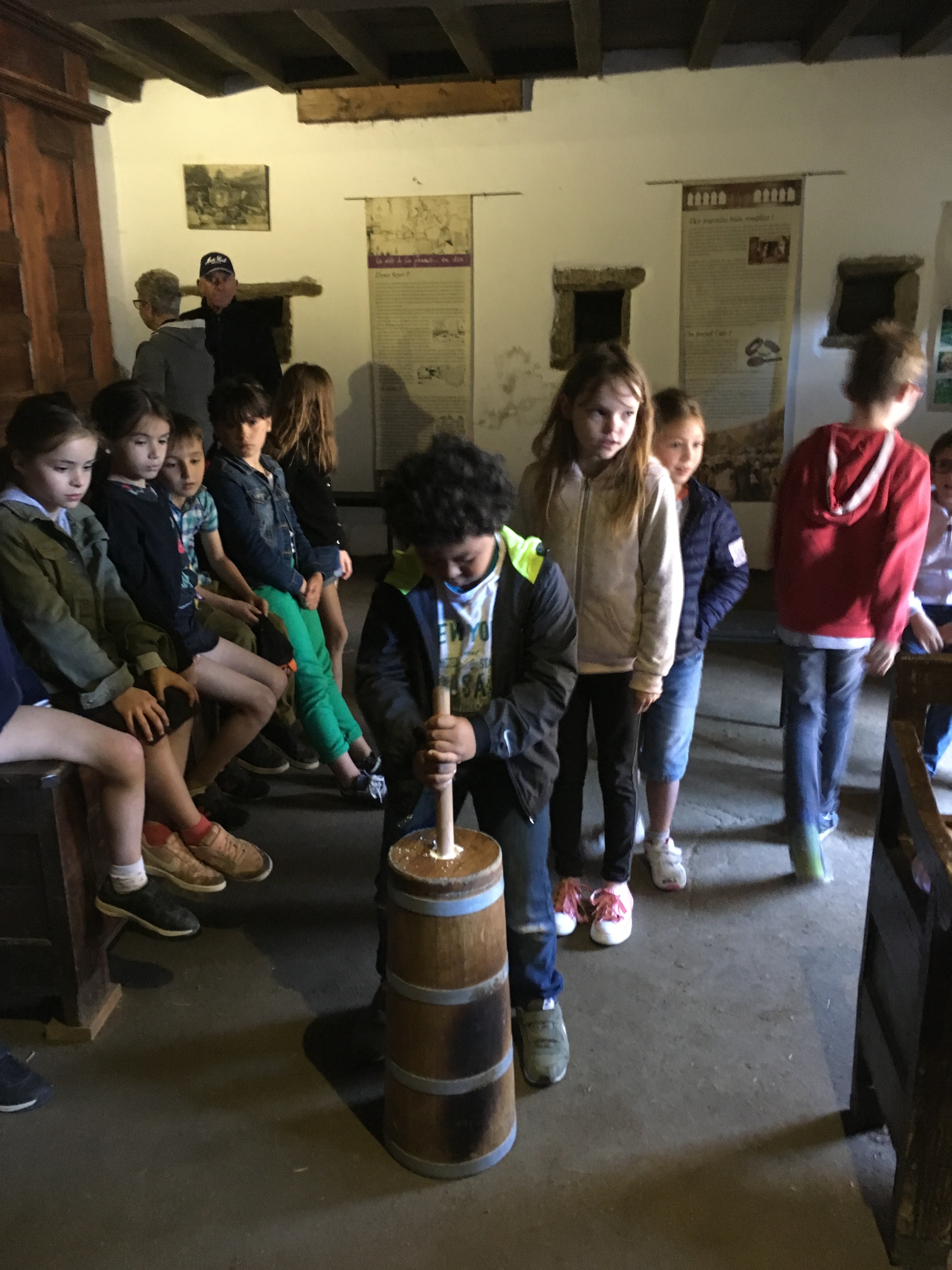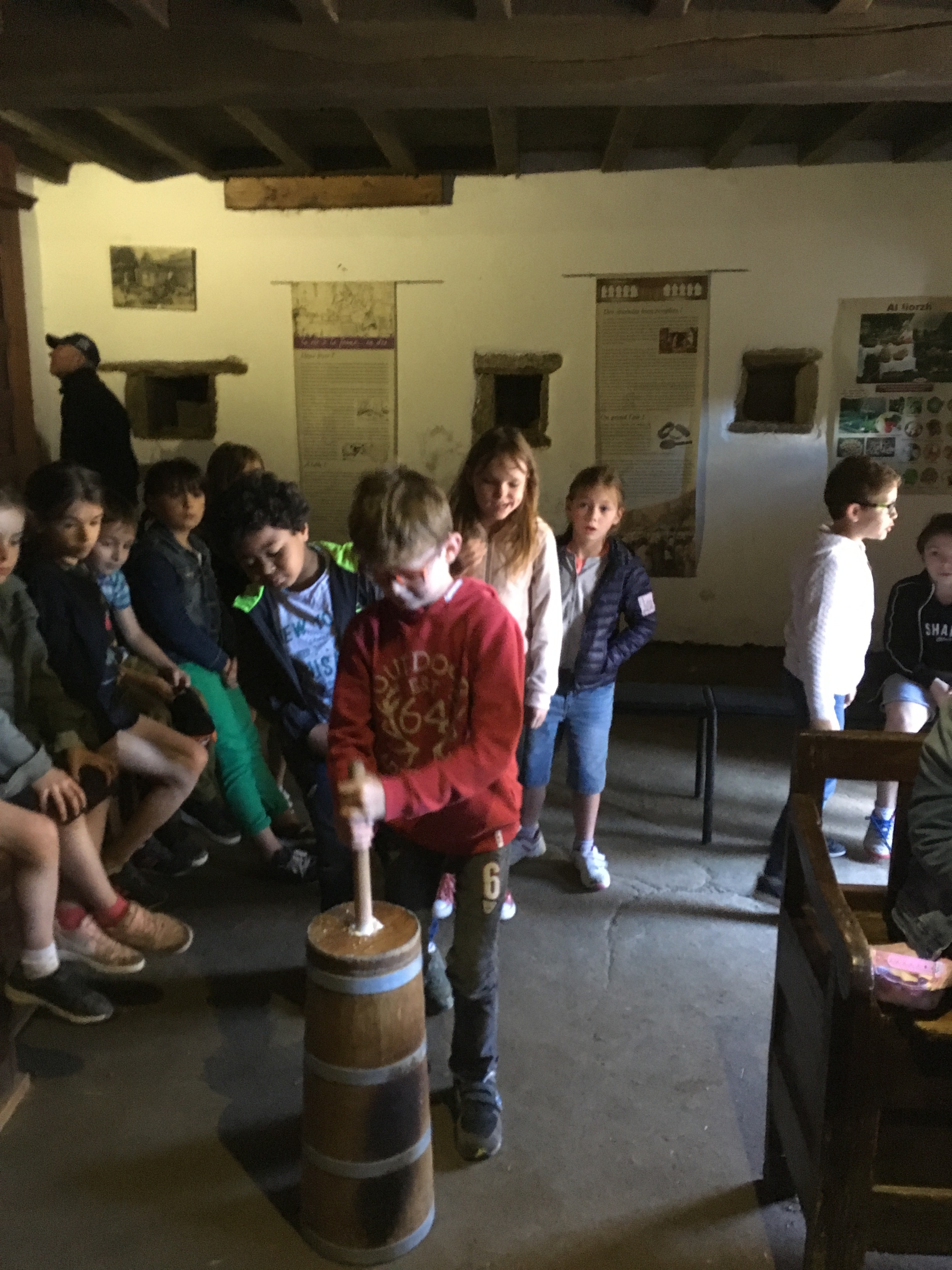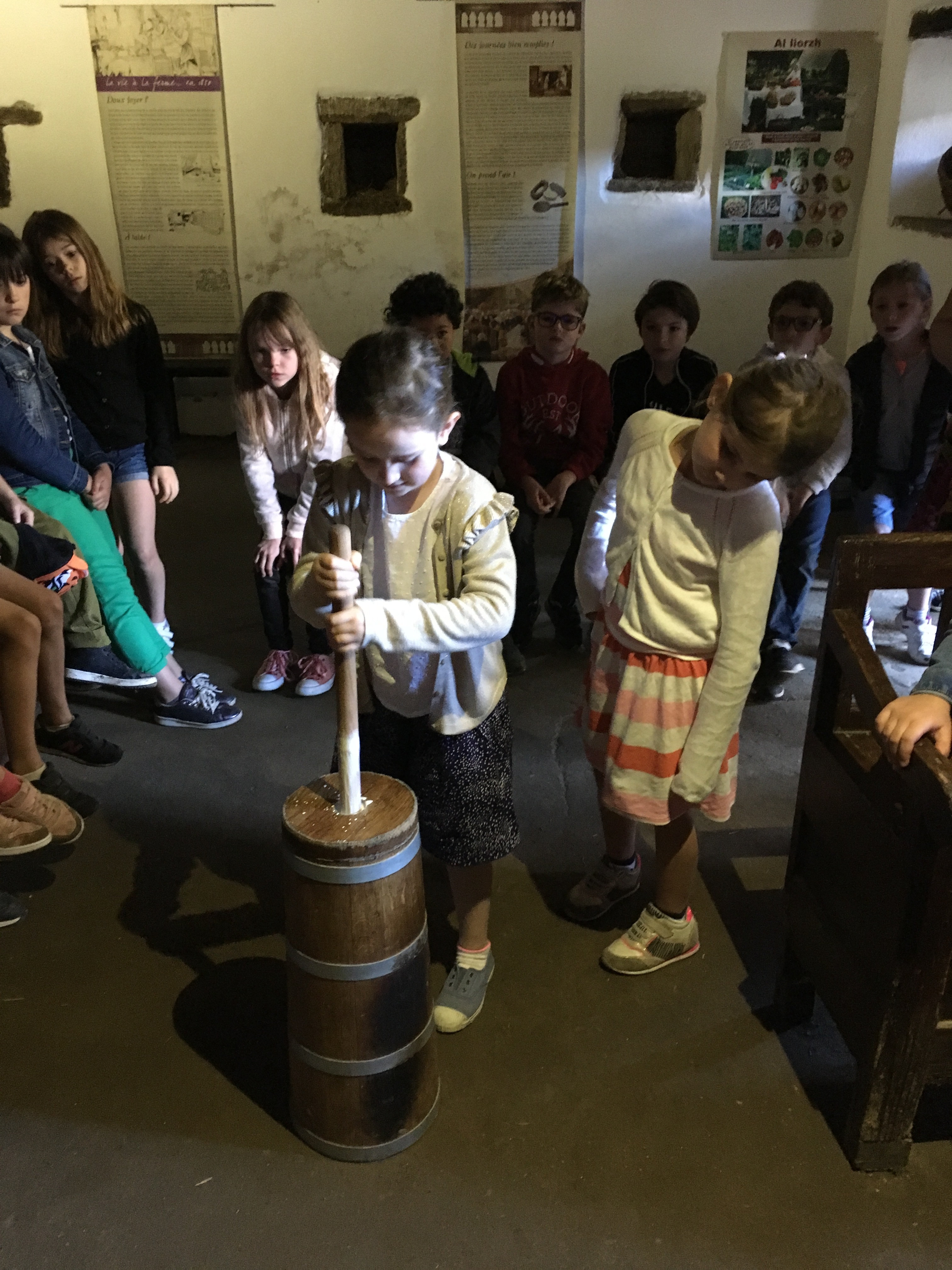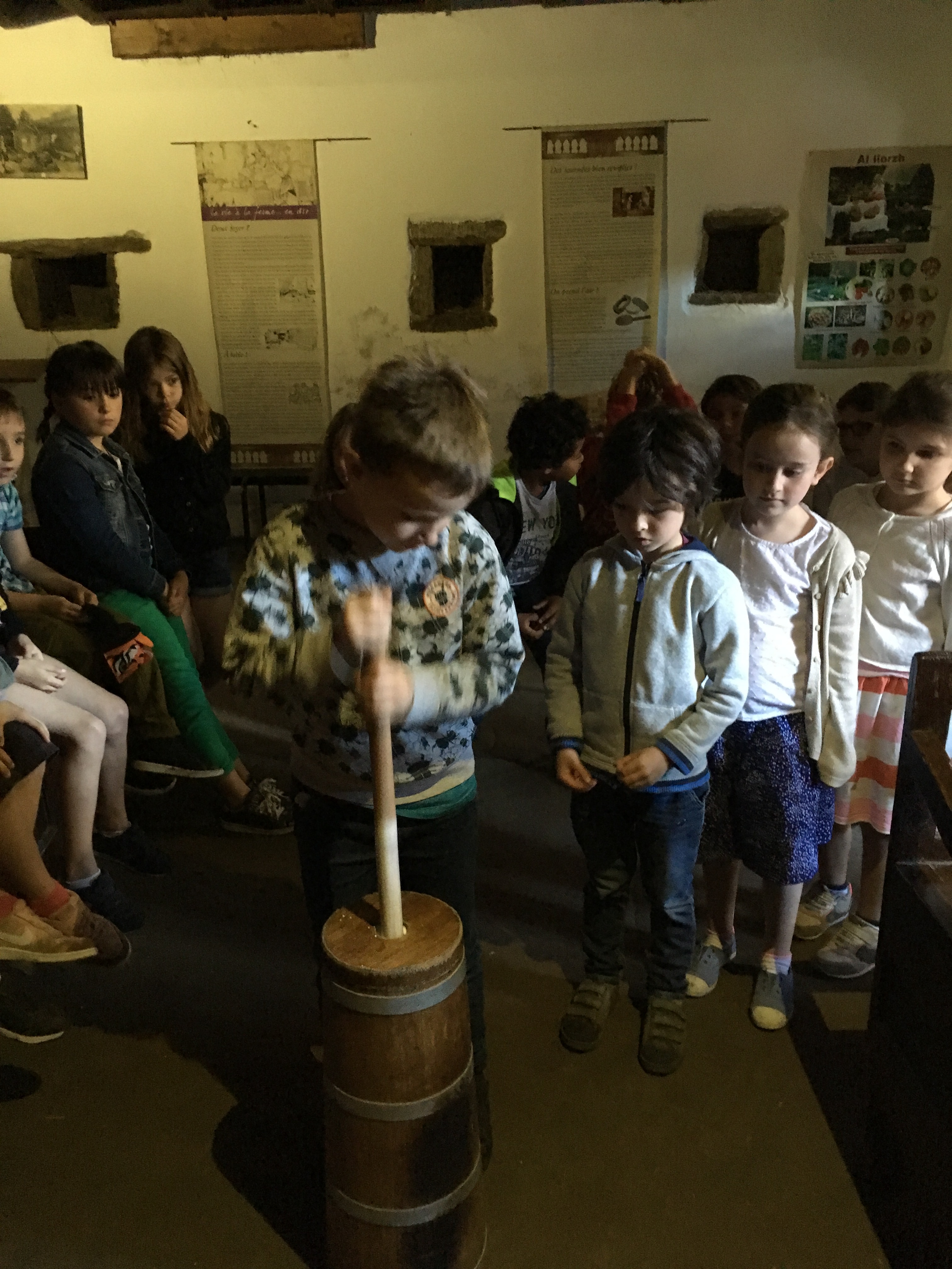 Puis les groupes ont été divisés, la classe de CP-CE1 et quelques CE2 sont partis découvrir la conception de la bouillie de blé noir et du beurre, chacun y a mis sa patte.