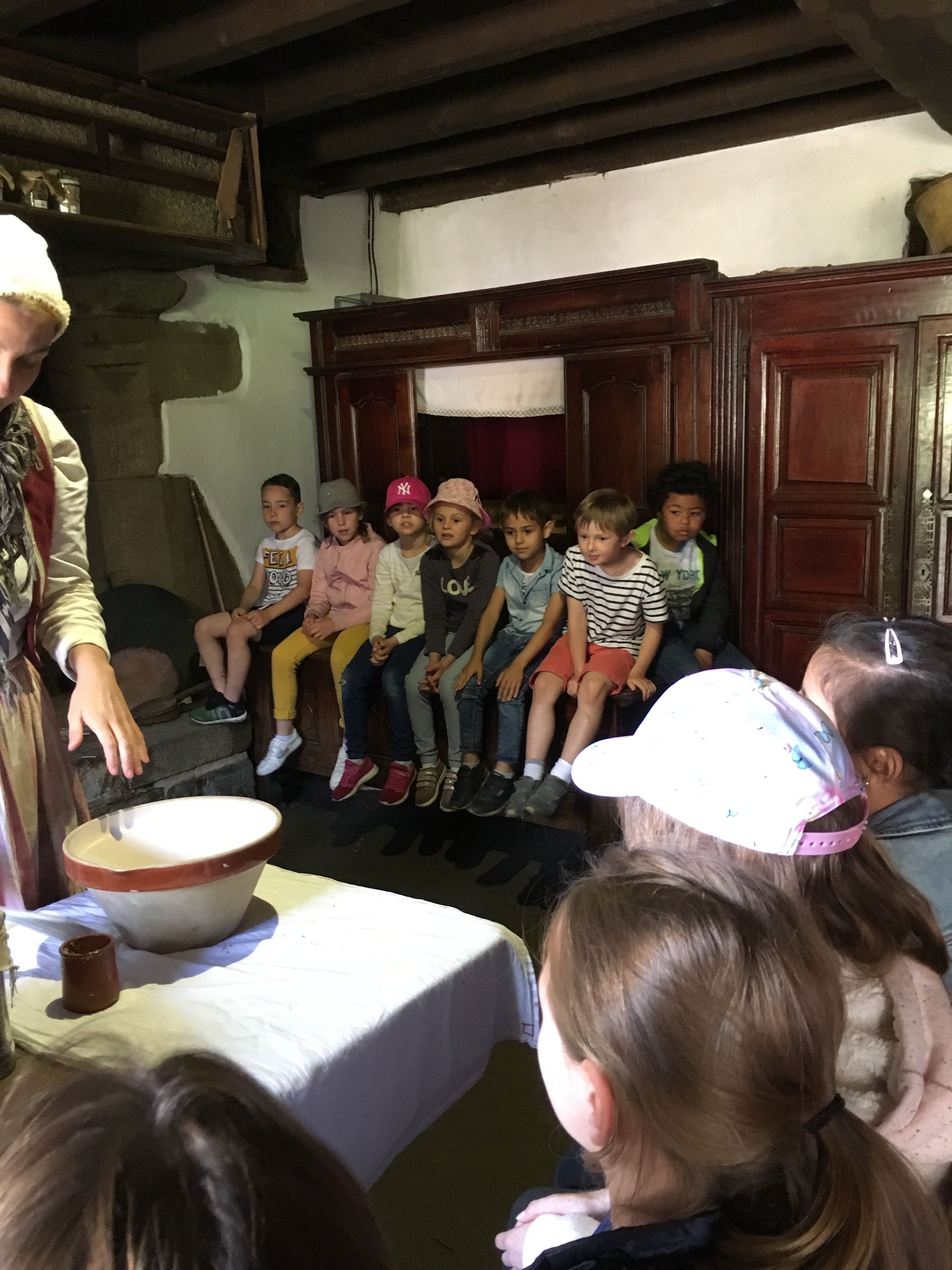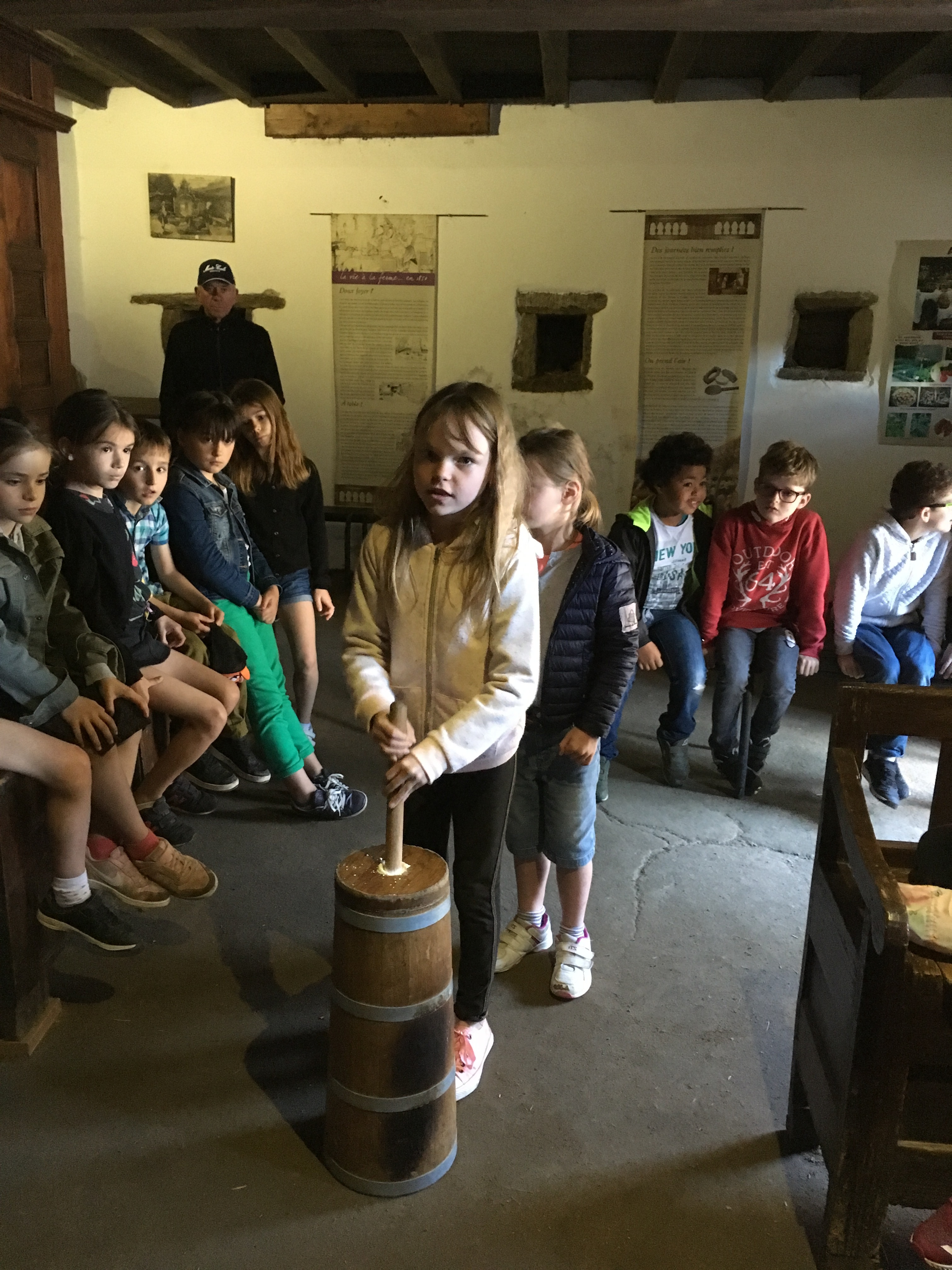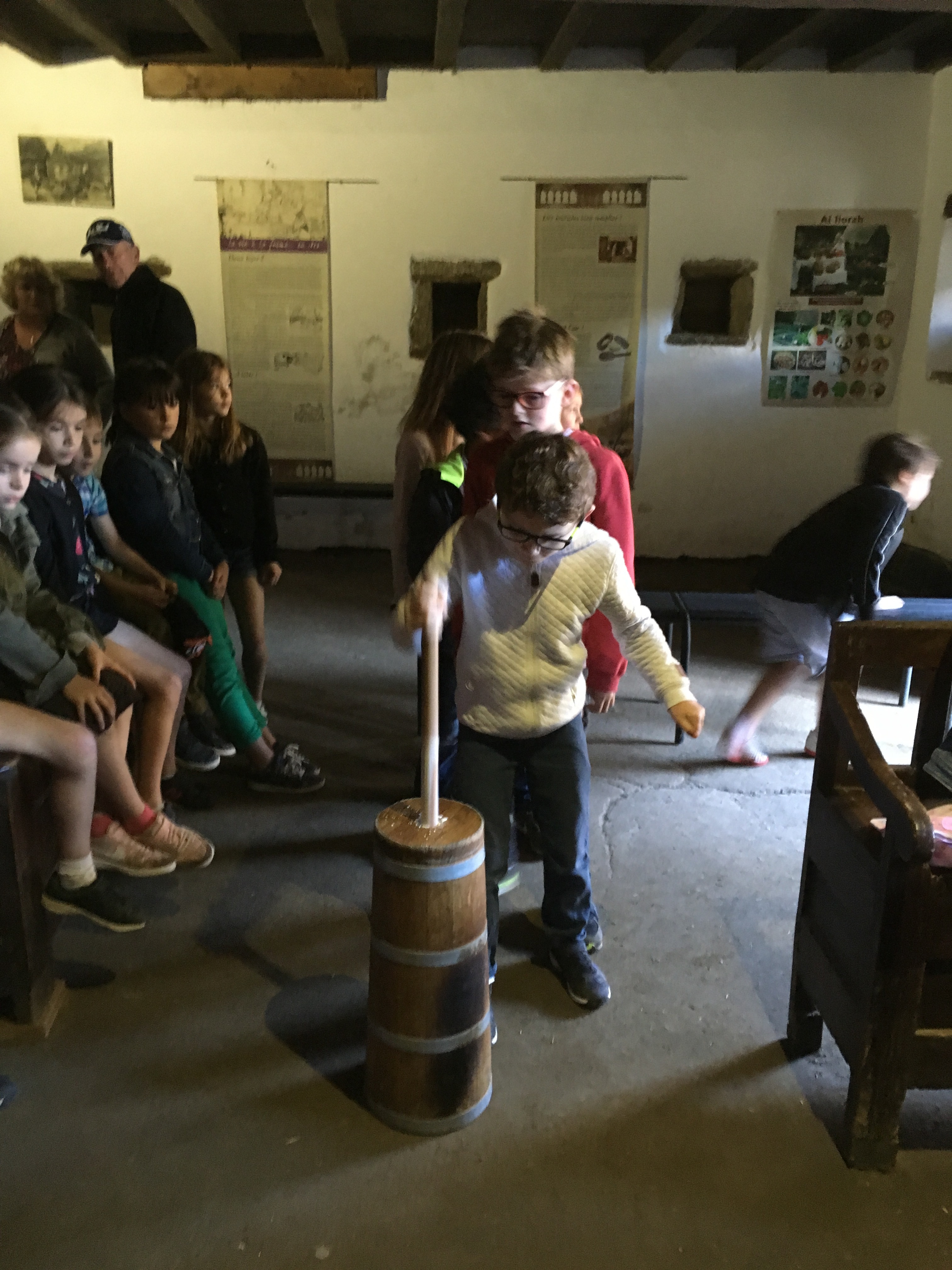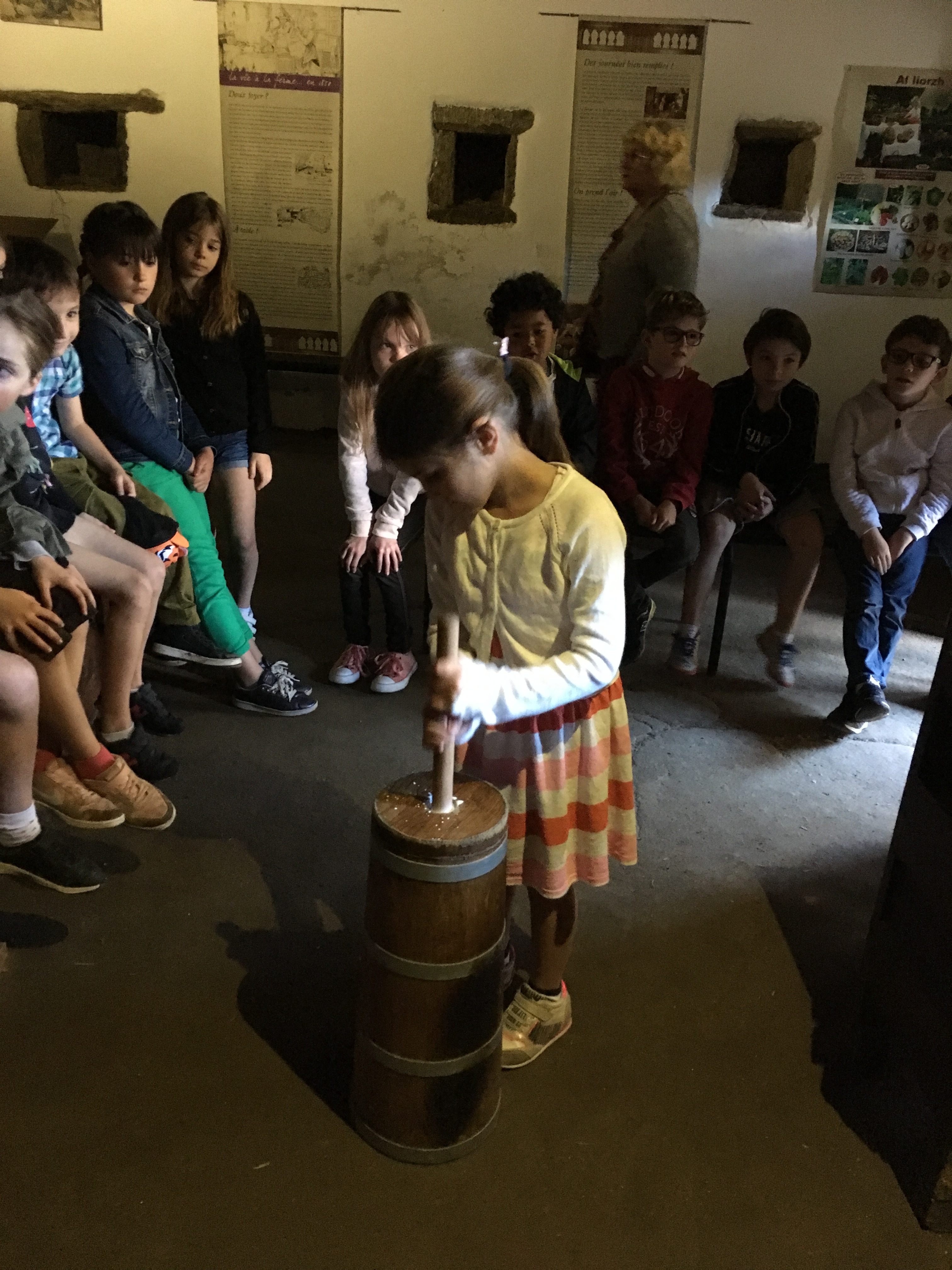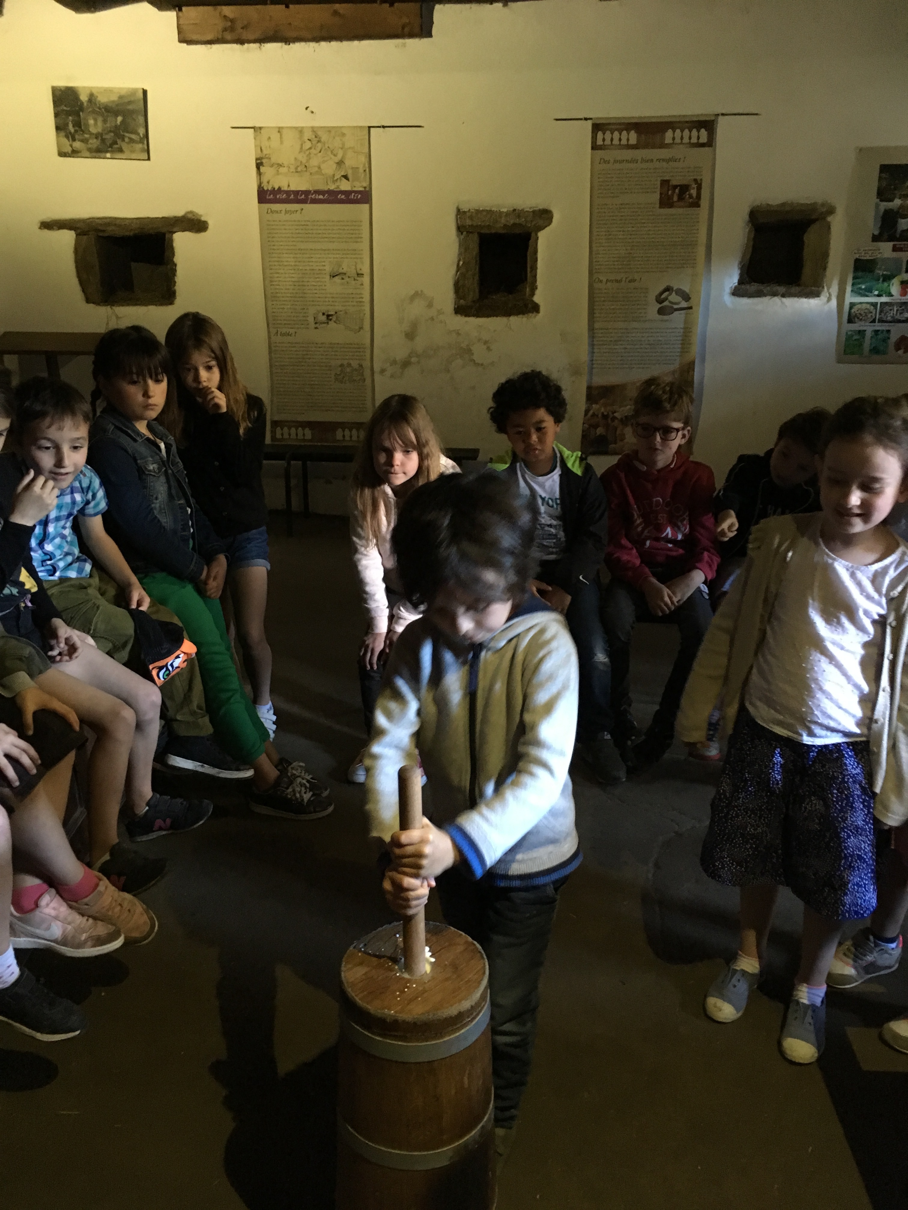Puis les groupes ont été divisés, la classe de CP-CE1 et quelques CE2 sont partis découvrir la conception de la bouillie de blé noir et du beurre, chacun y a mis sa patte.