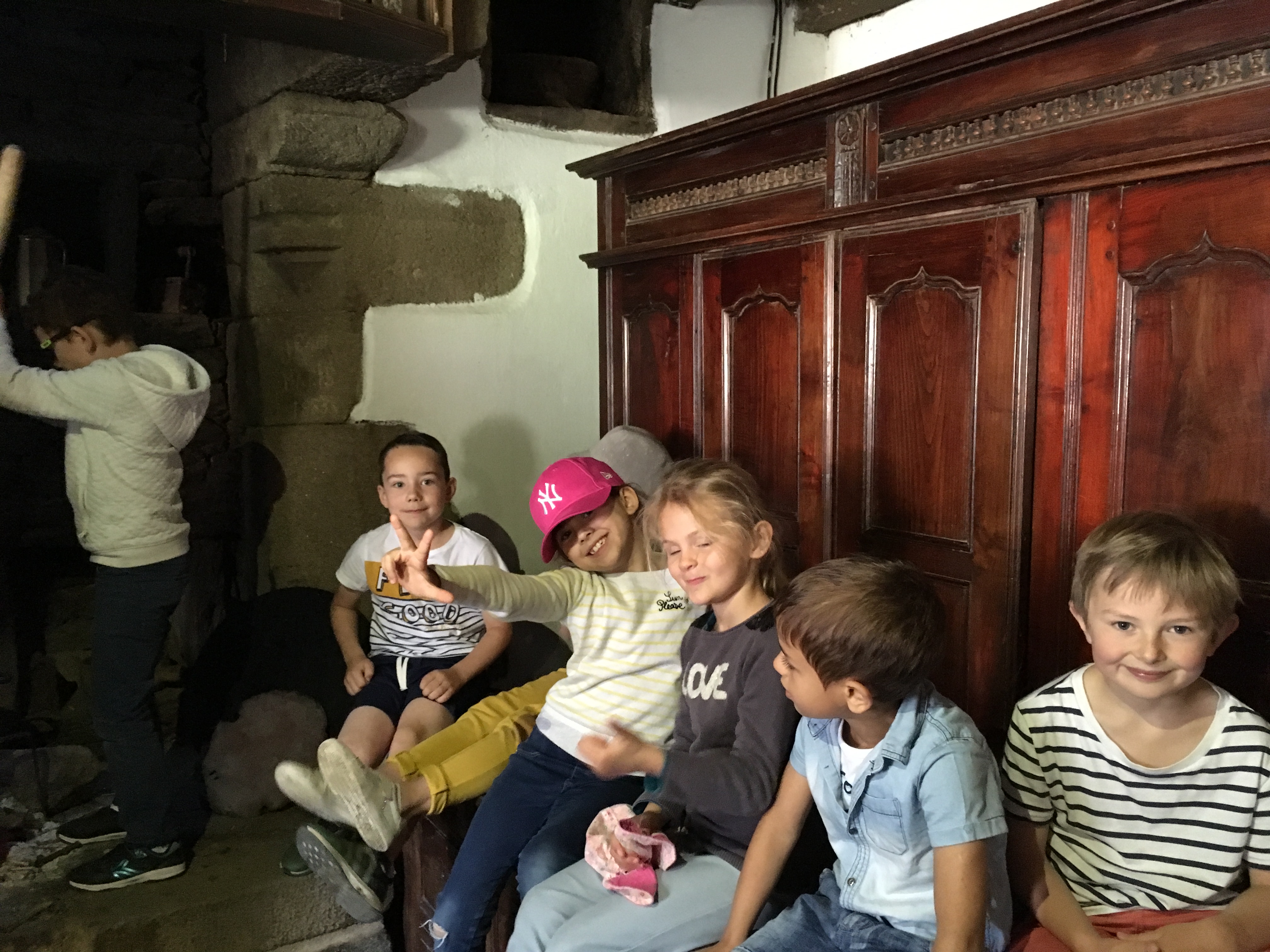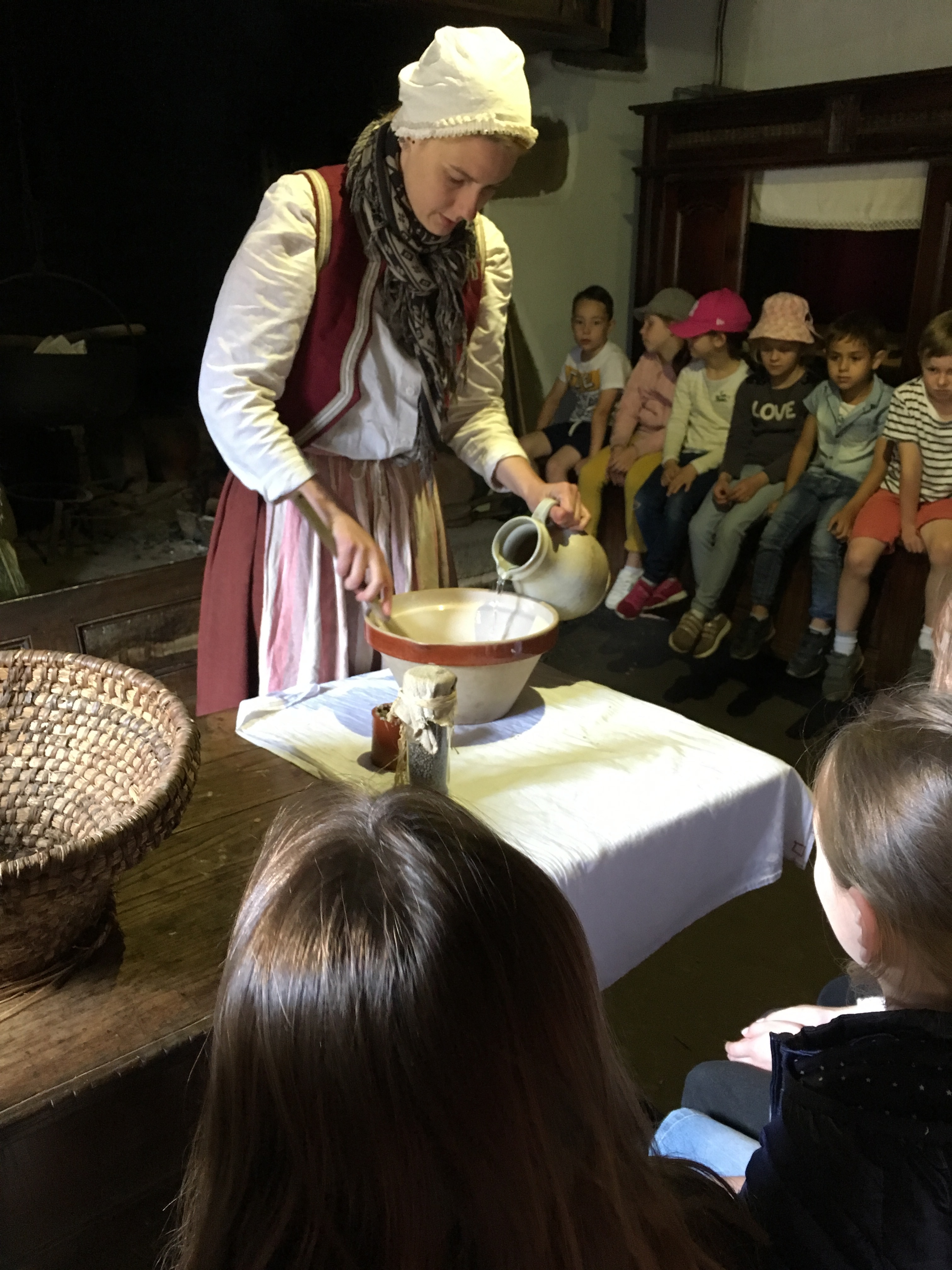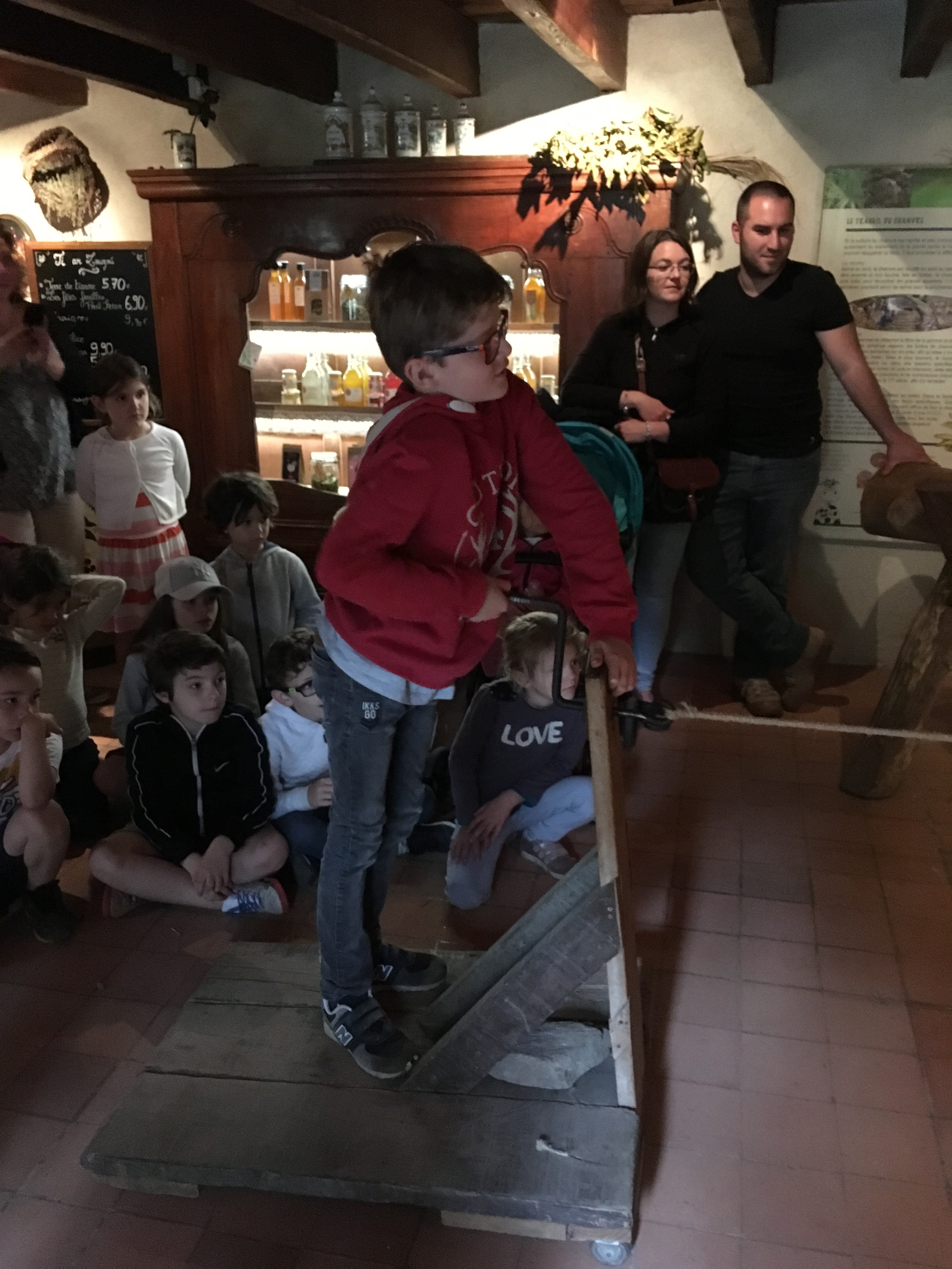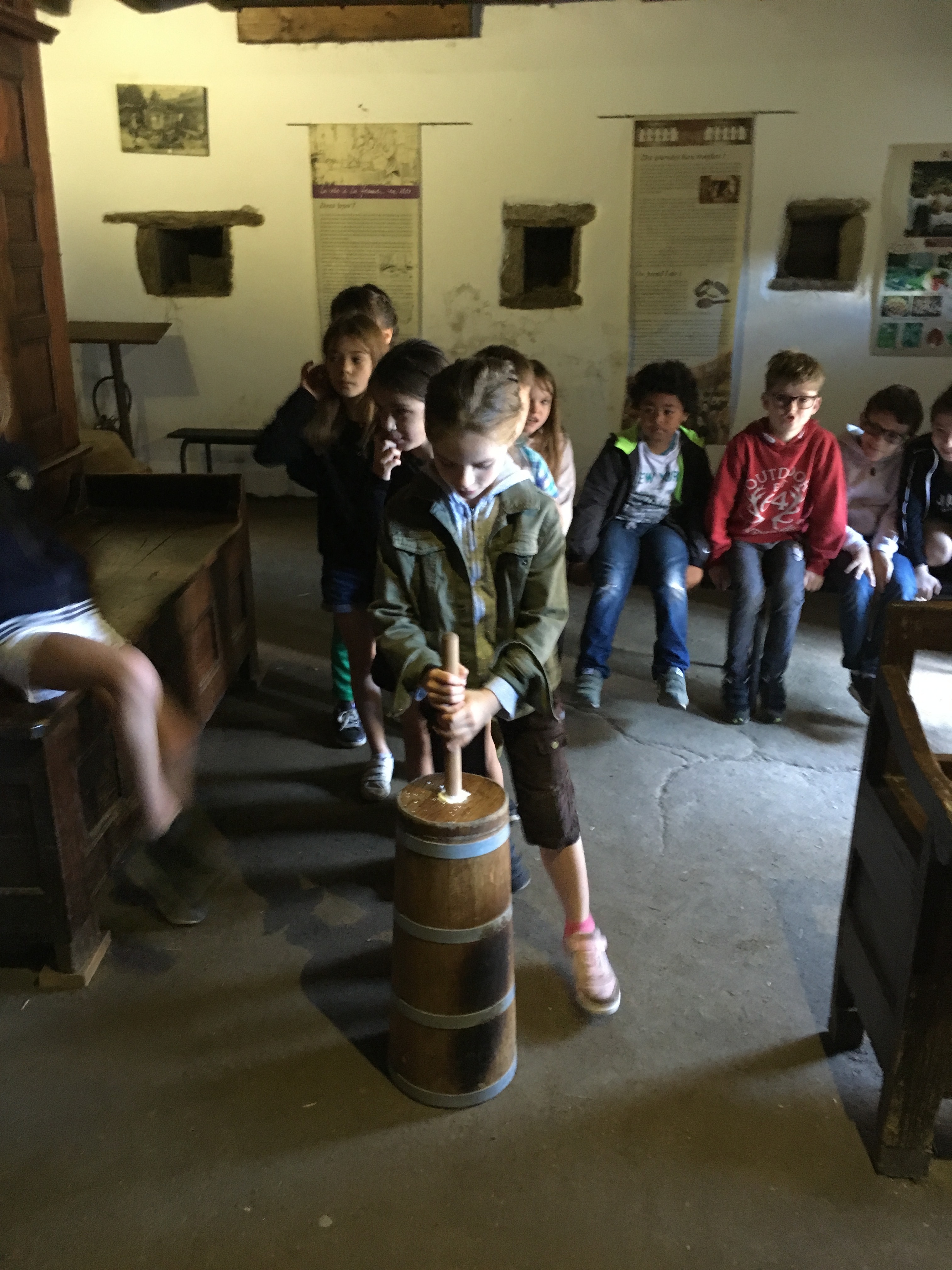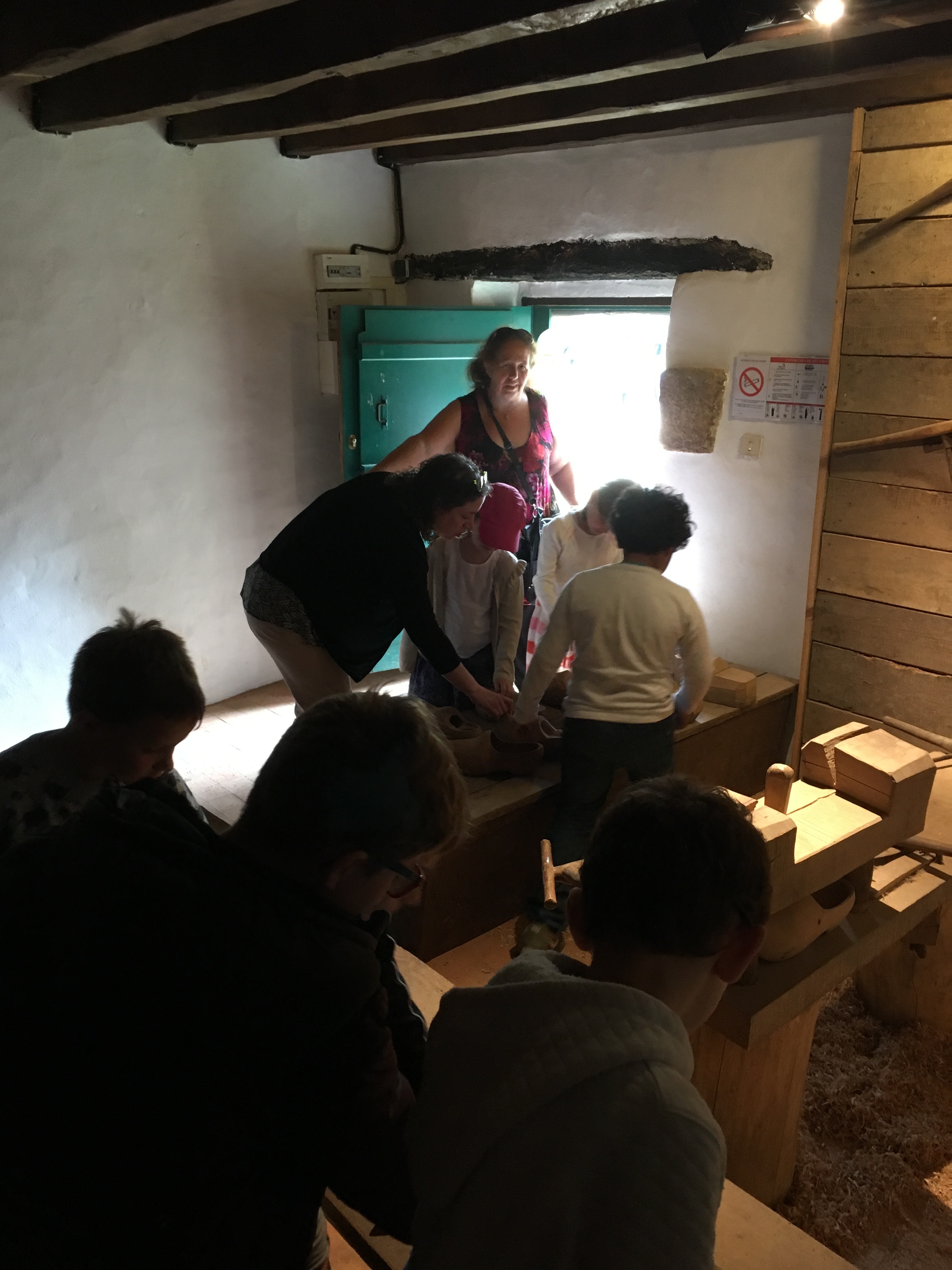 Puis les groupes ont été divisés, la classe de CP-CE1 et quelques CE2 sont partis découvrir la conception de la bouillie de blé noir et du beurre, chacun y a mis sa patte.