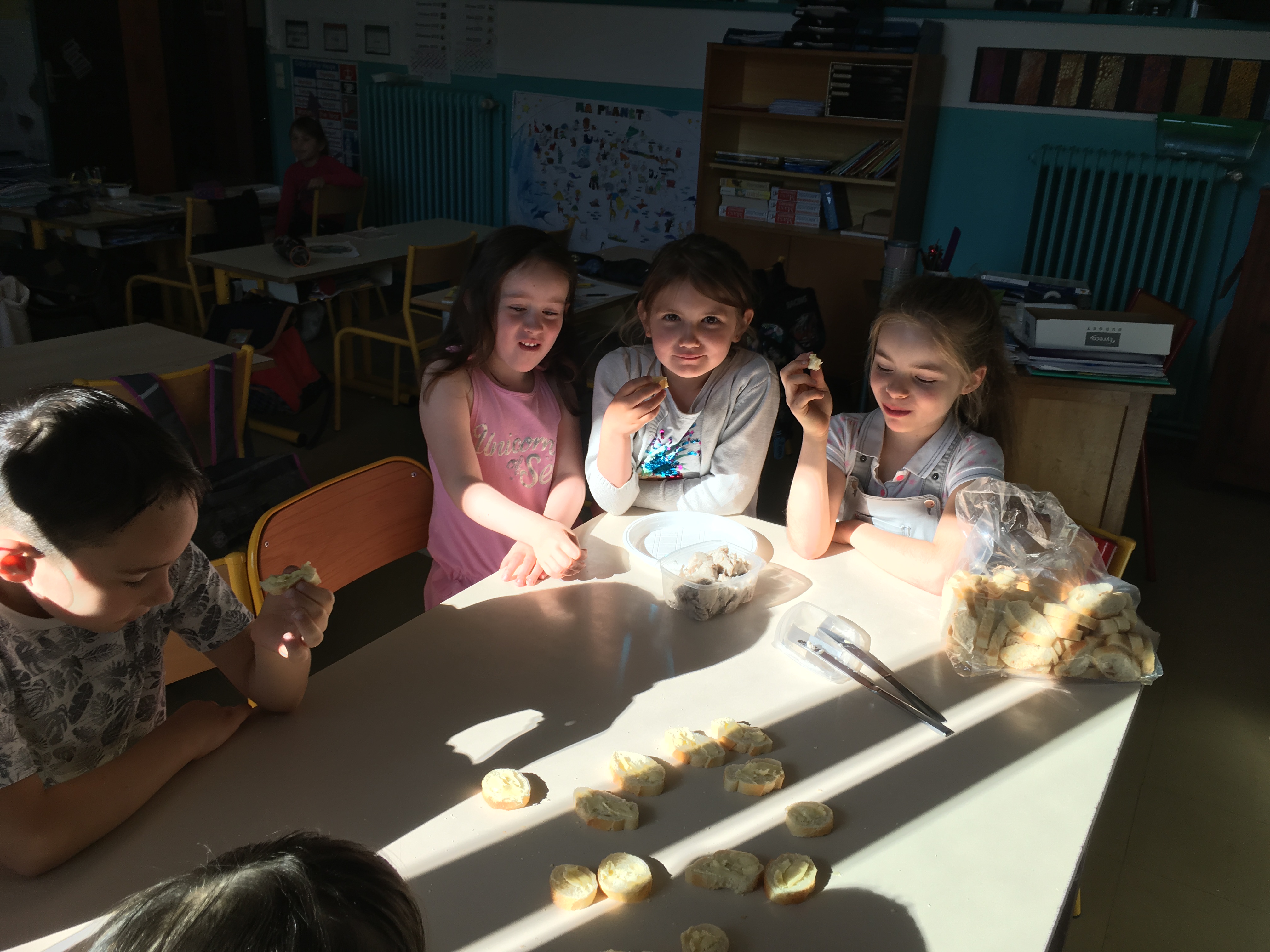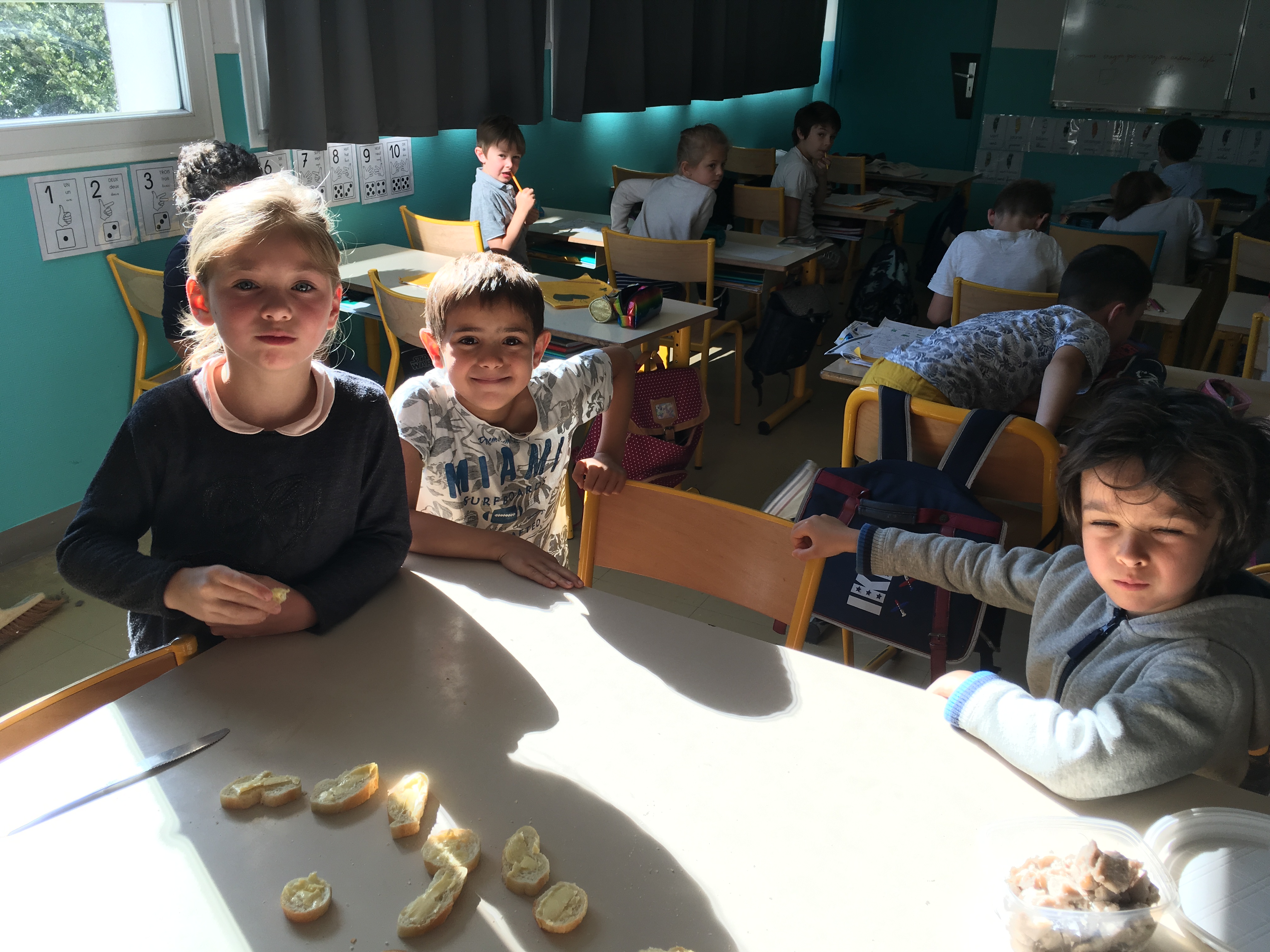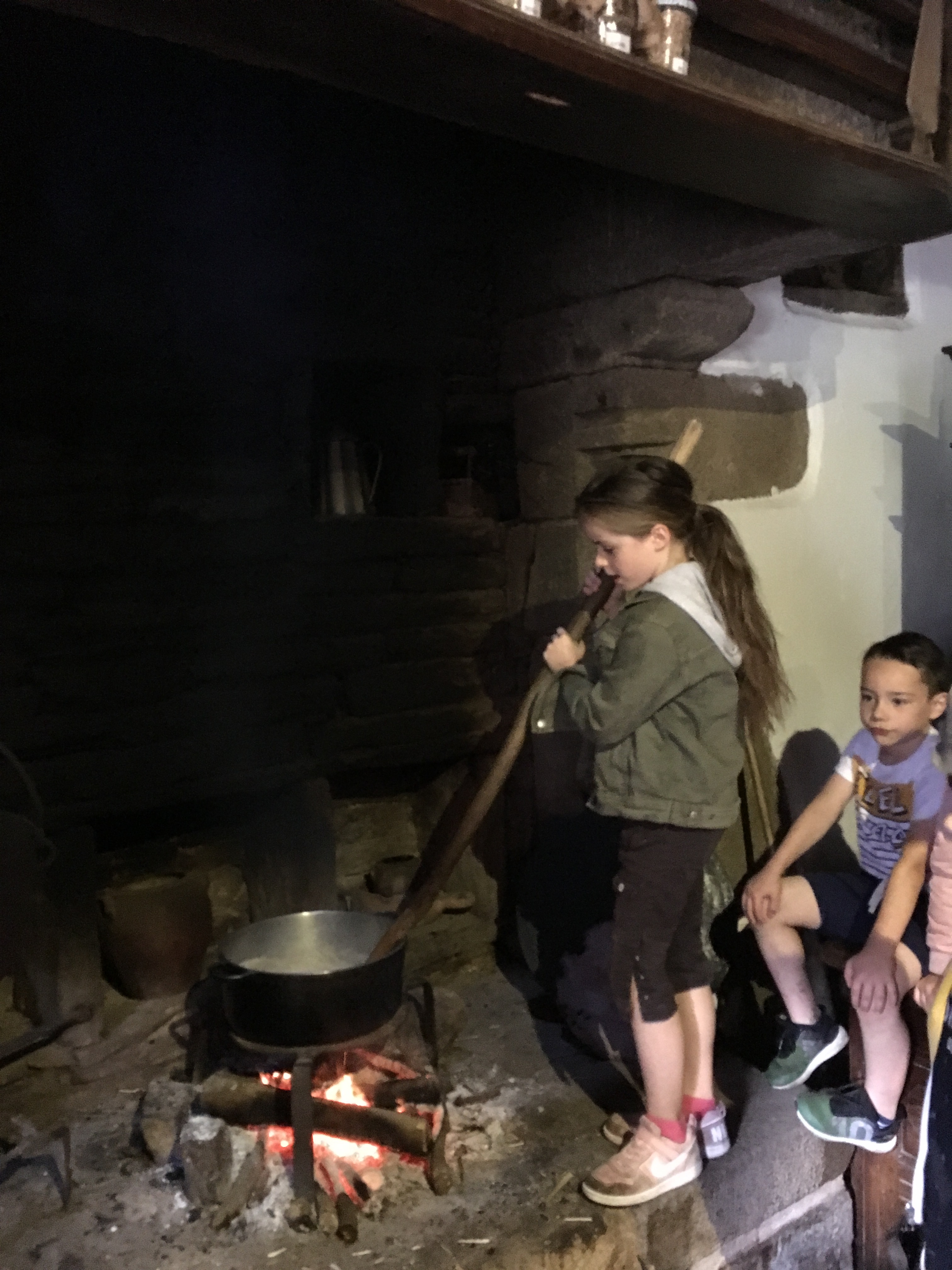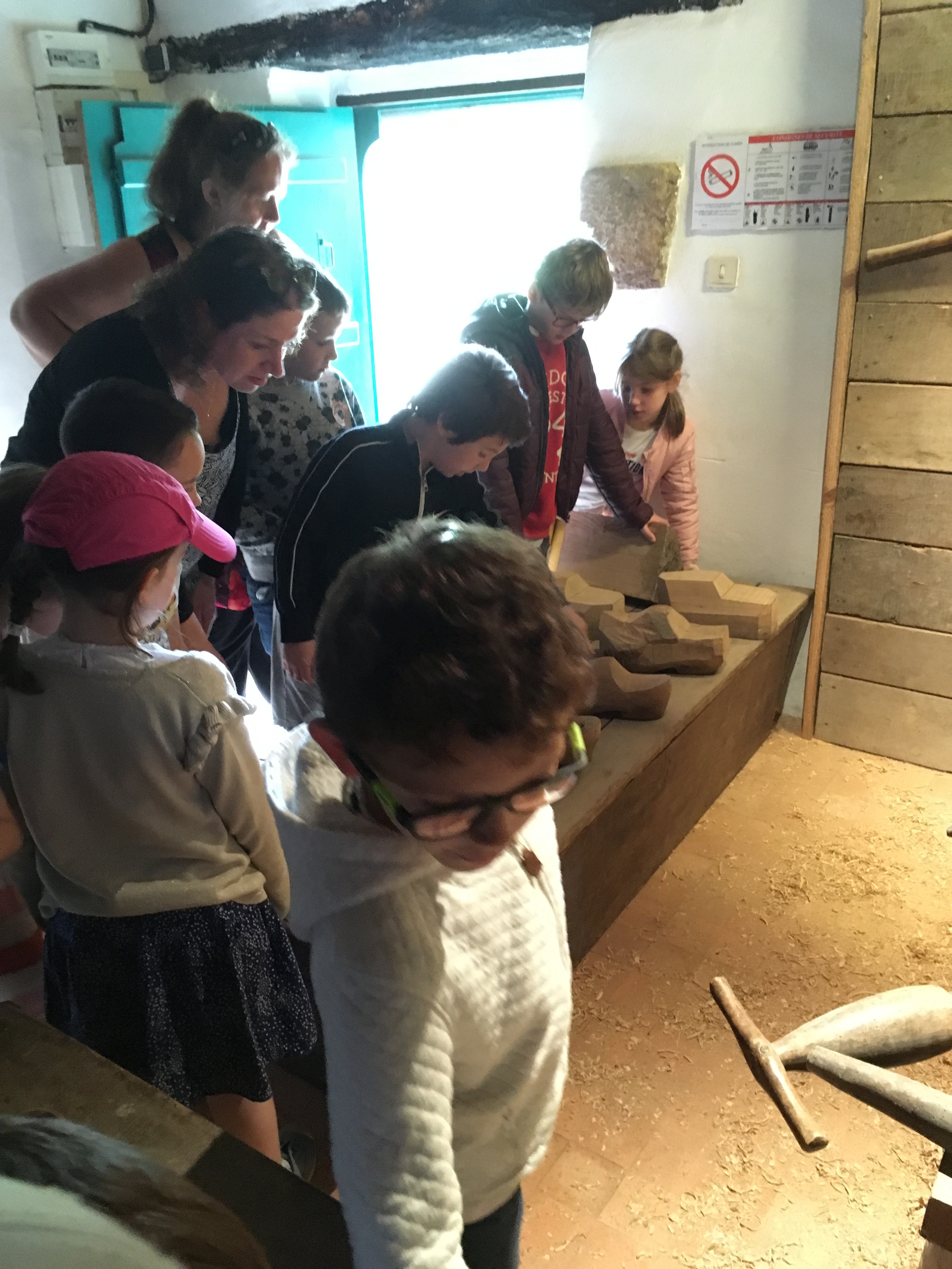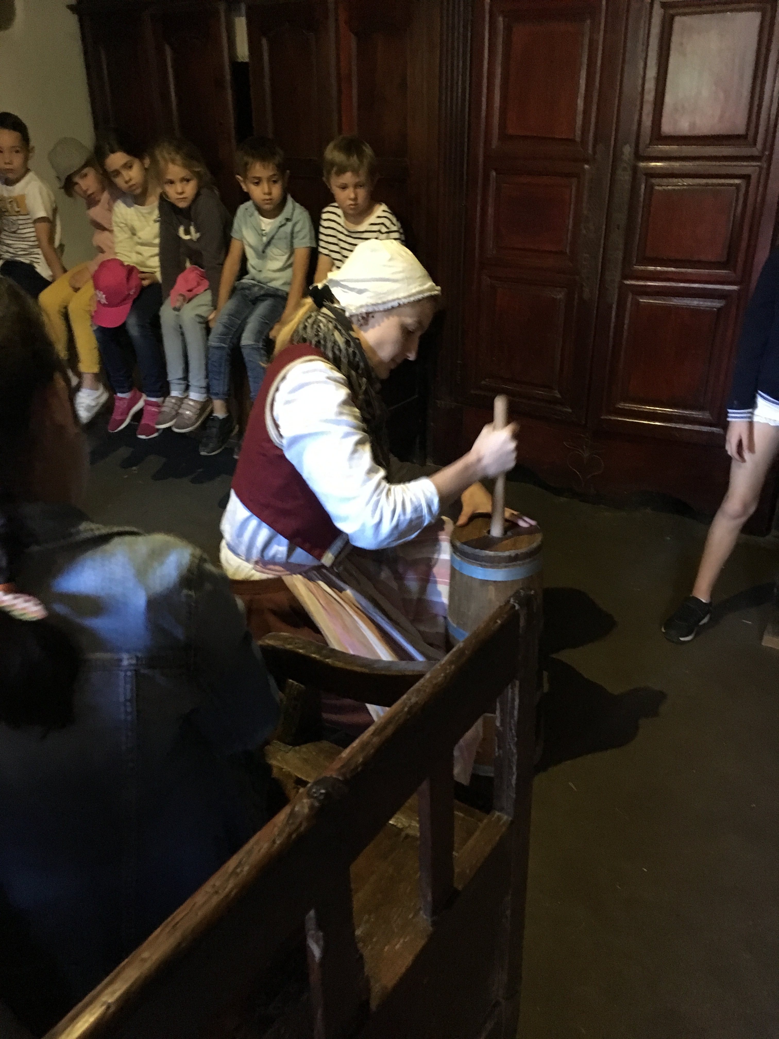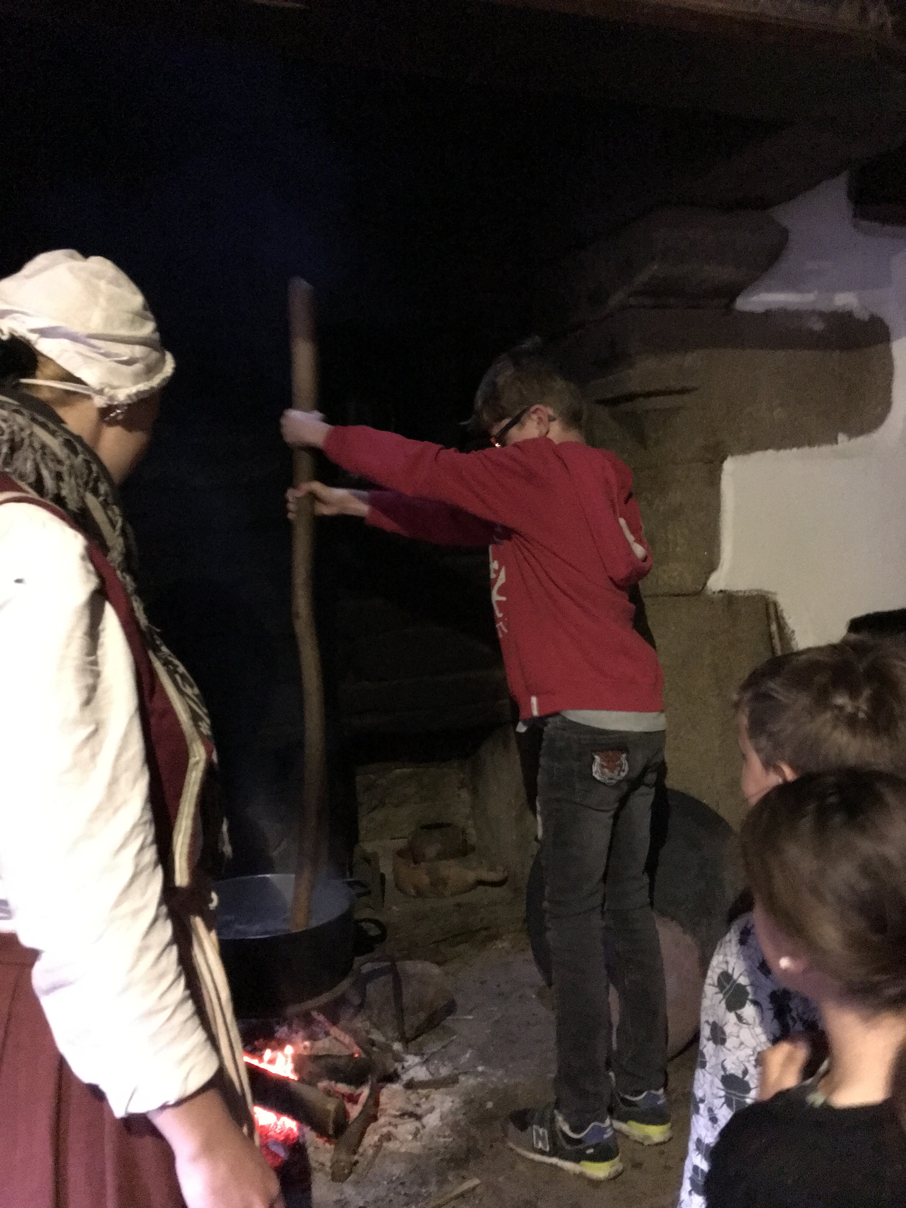 Puis les groupes ont été divisés, la classe de CP-CE1 et quelques CE2 sont partis découvrir la conception de la bouillie de blé noir et du beurre, chacun y a mis sa patte.
