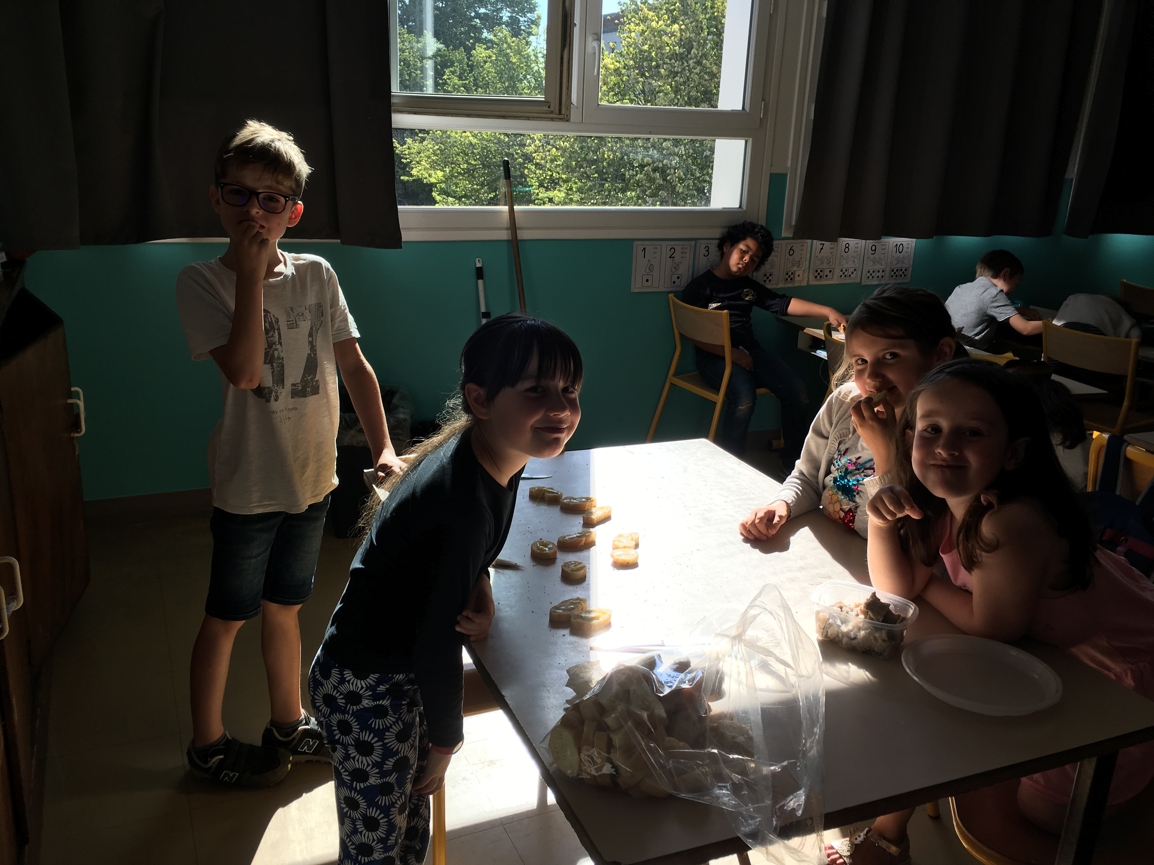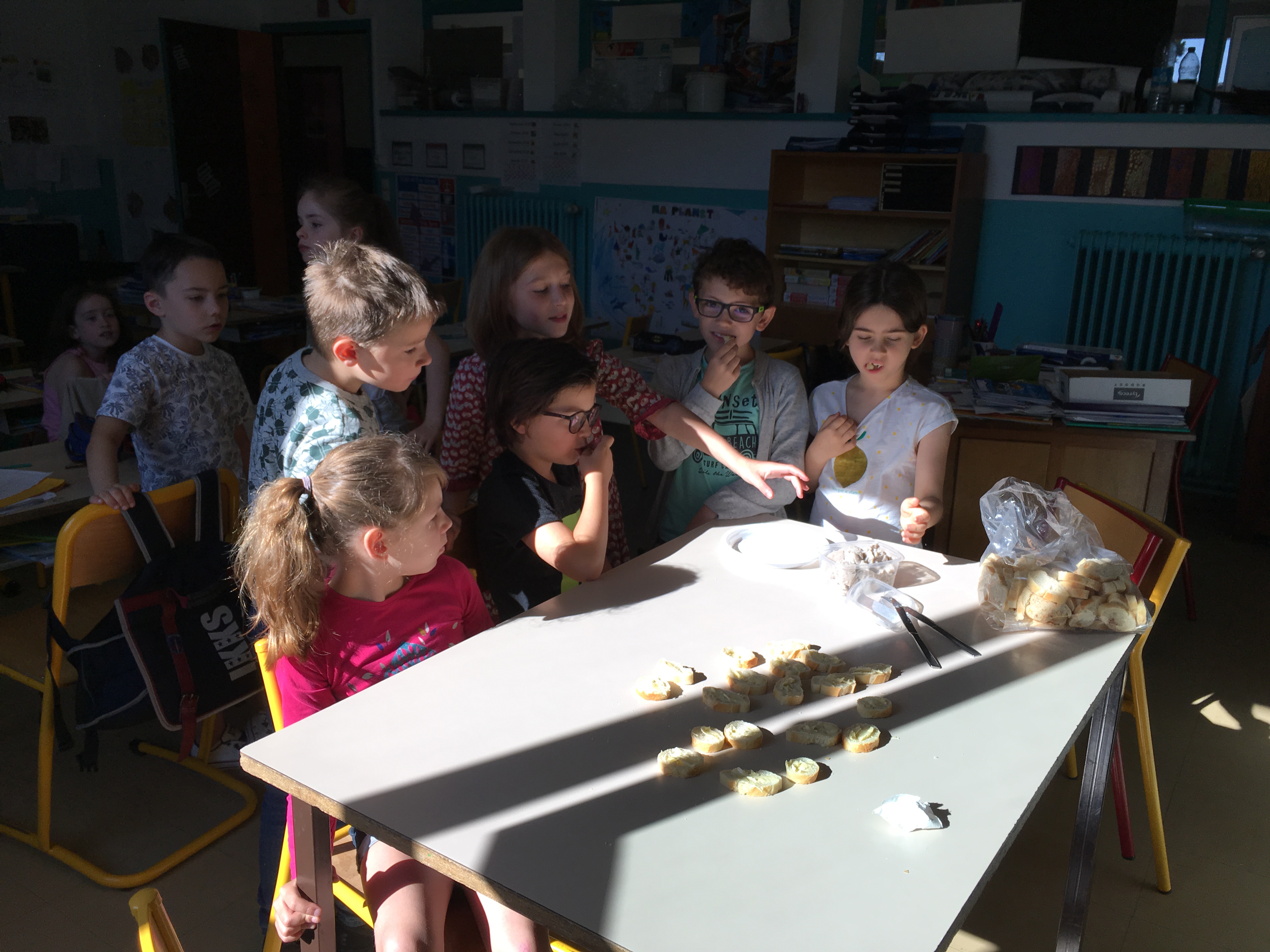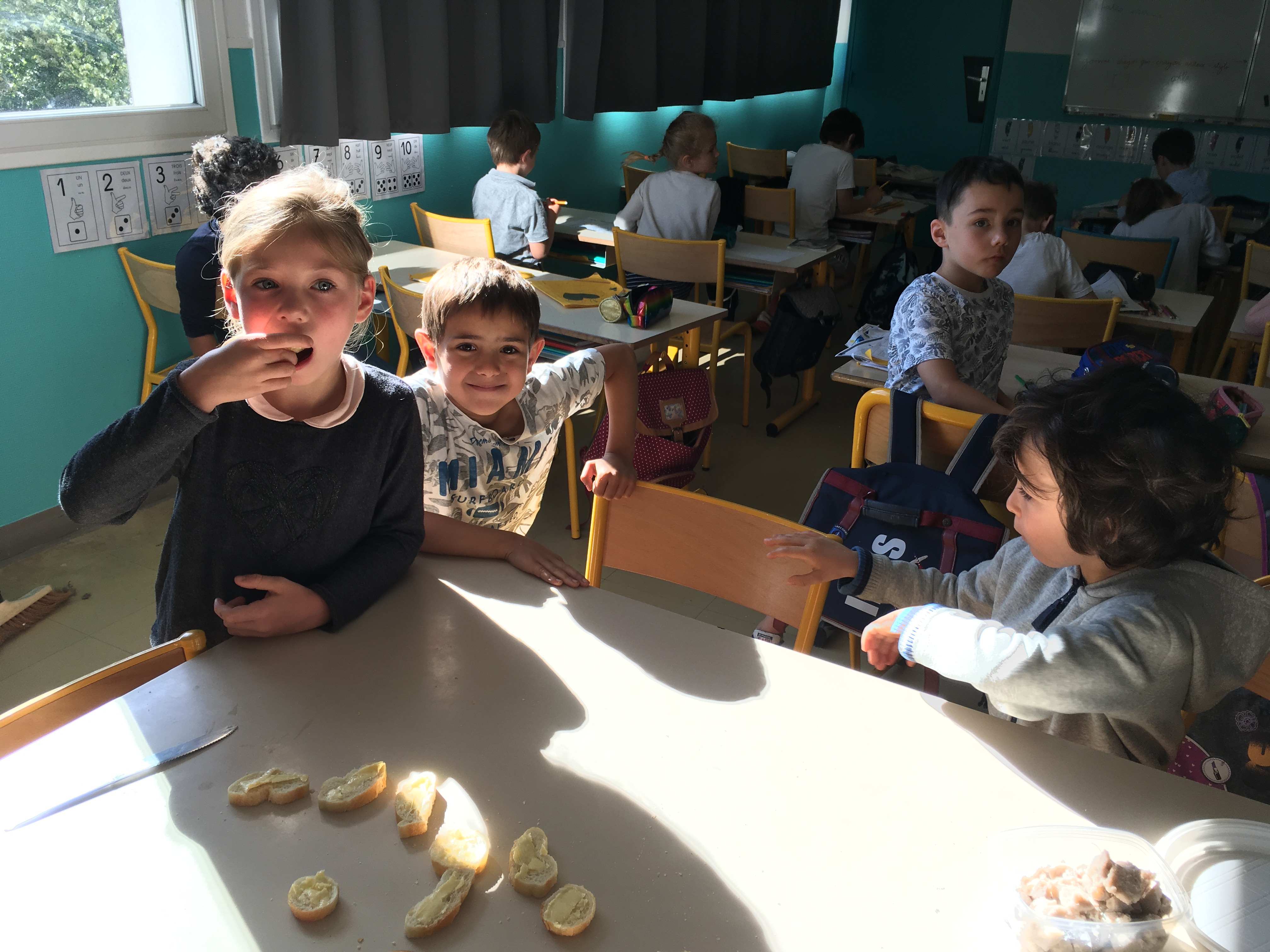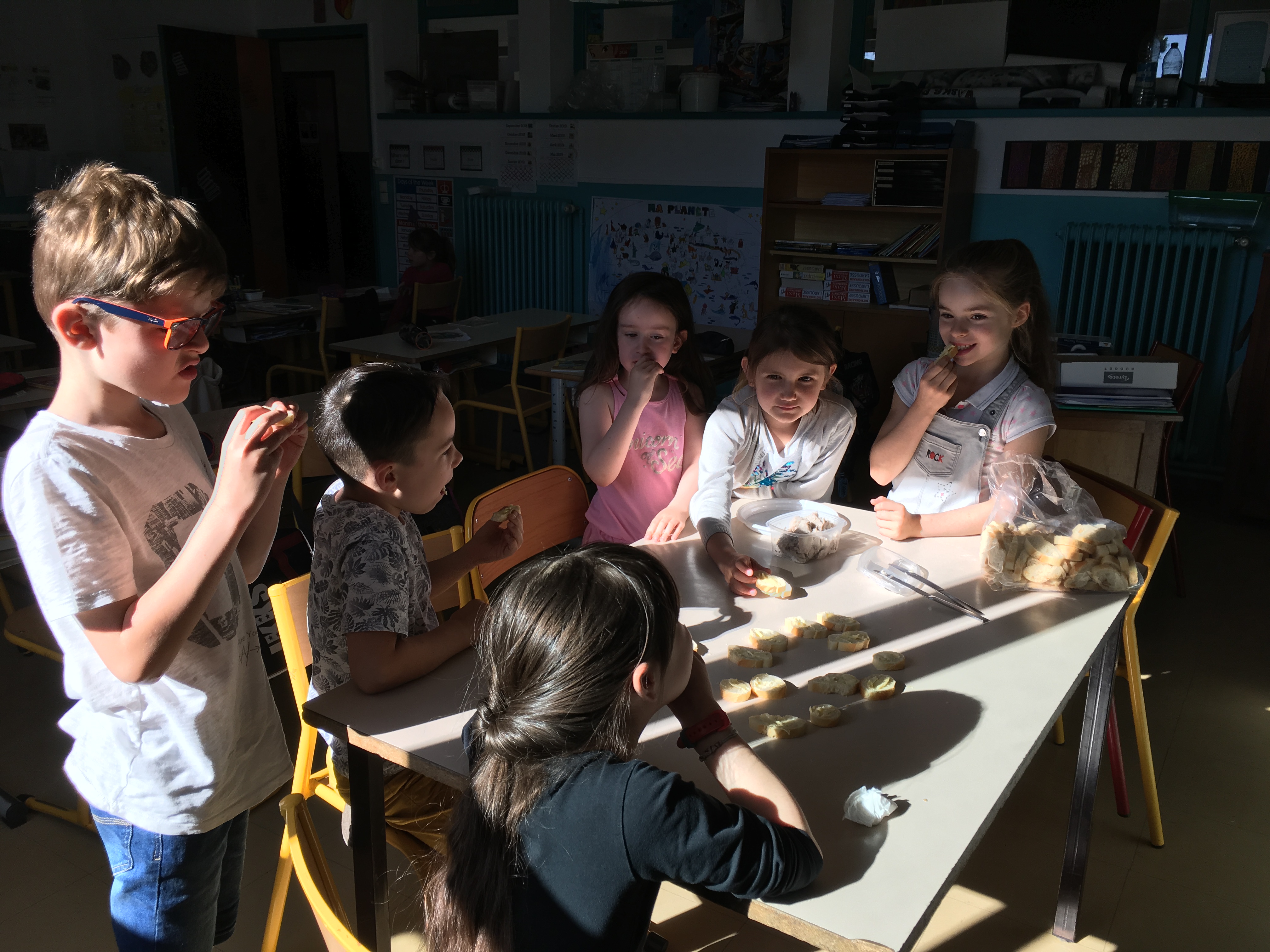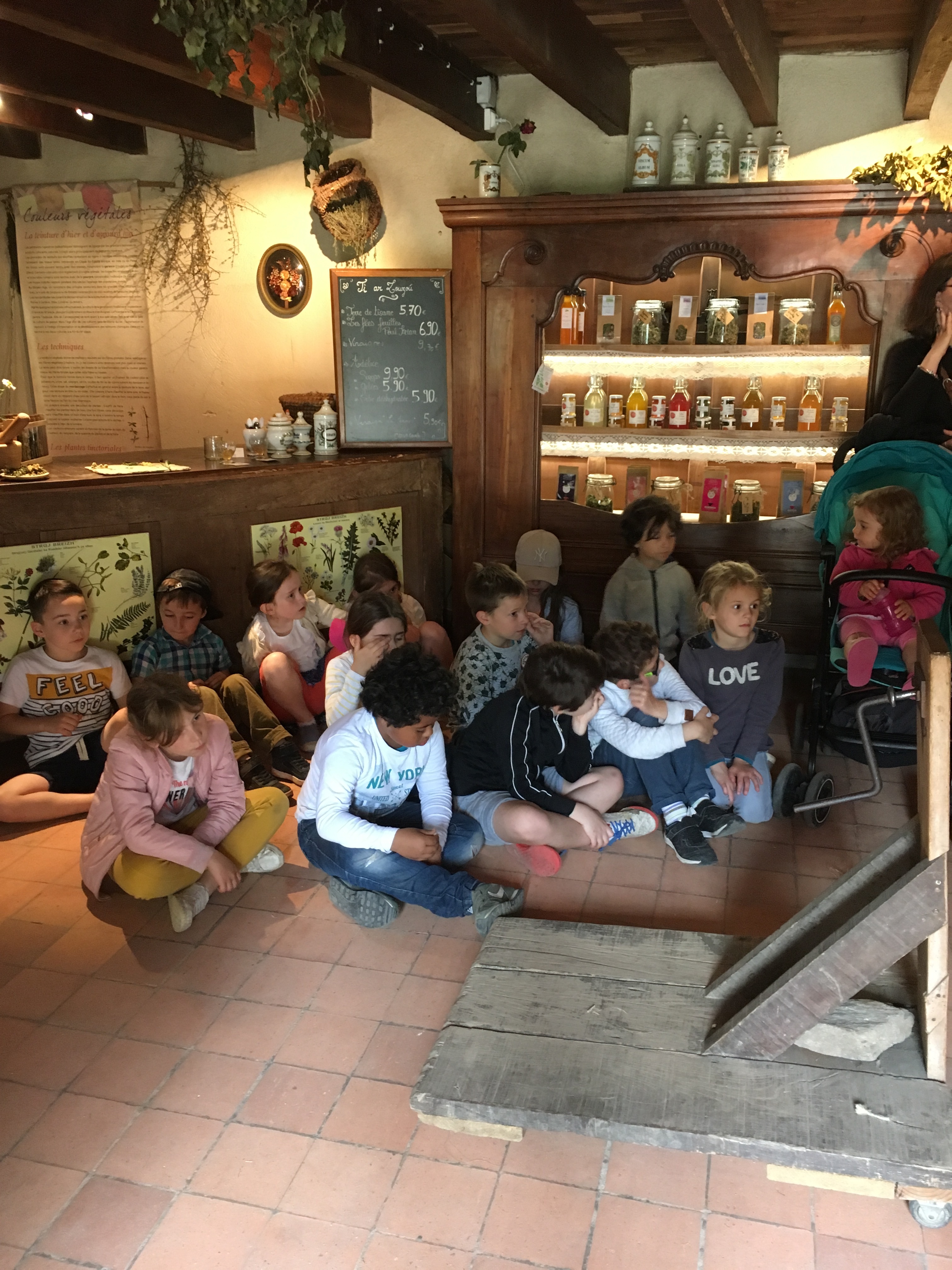 Puis les groupes ont été divisés, la classe de CP-CE1 et quelques CE2 sont partis découvrir la conception de la bouillie de blé noir et du beurre, chacun y a mis sa patte.