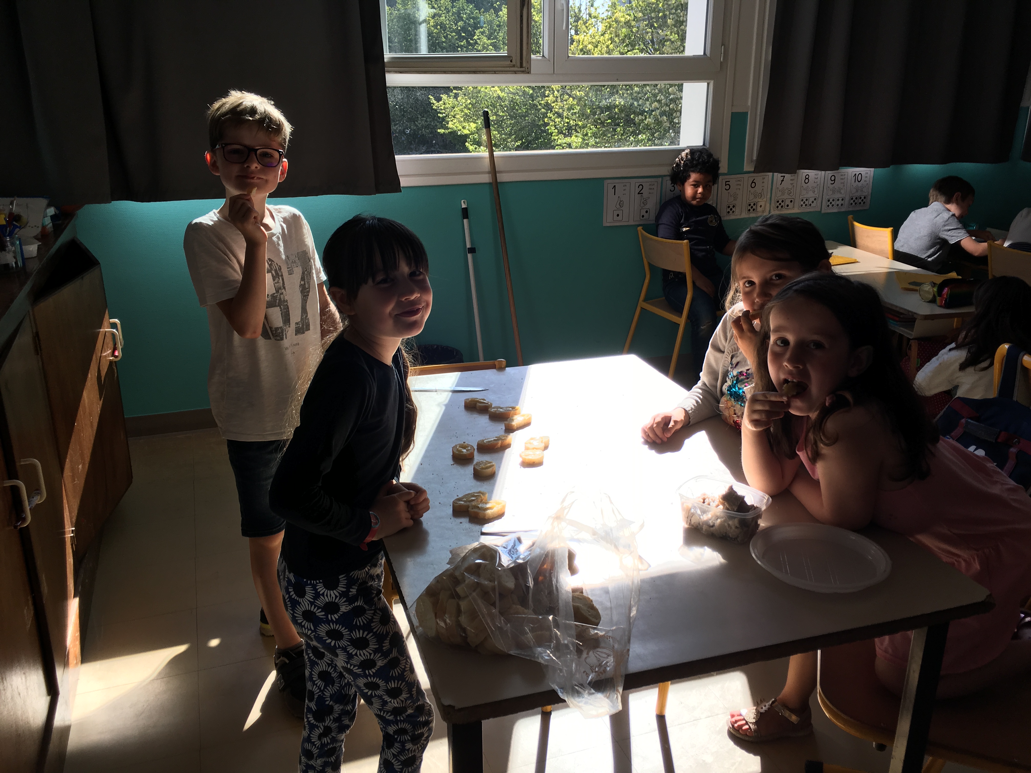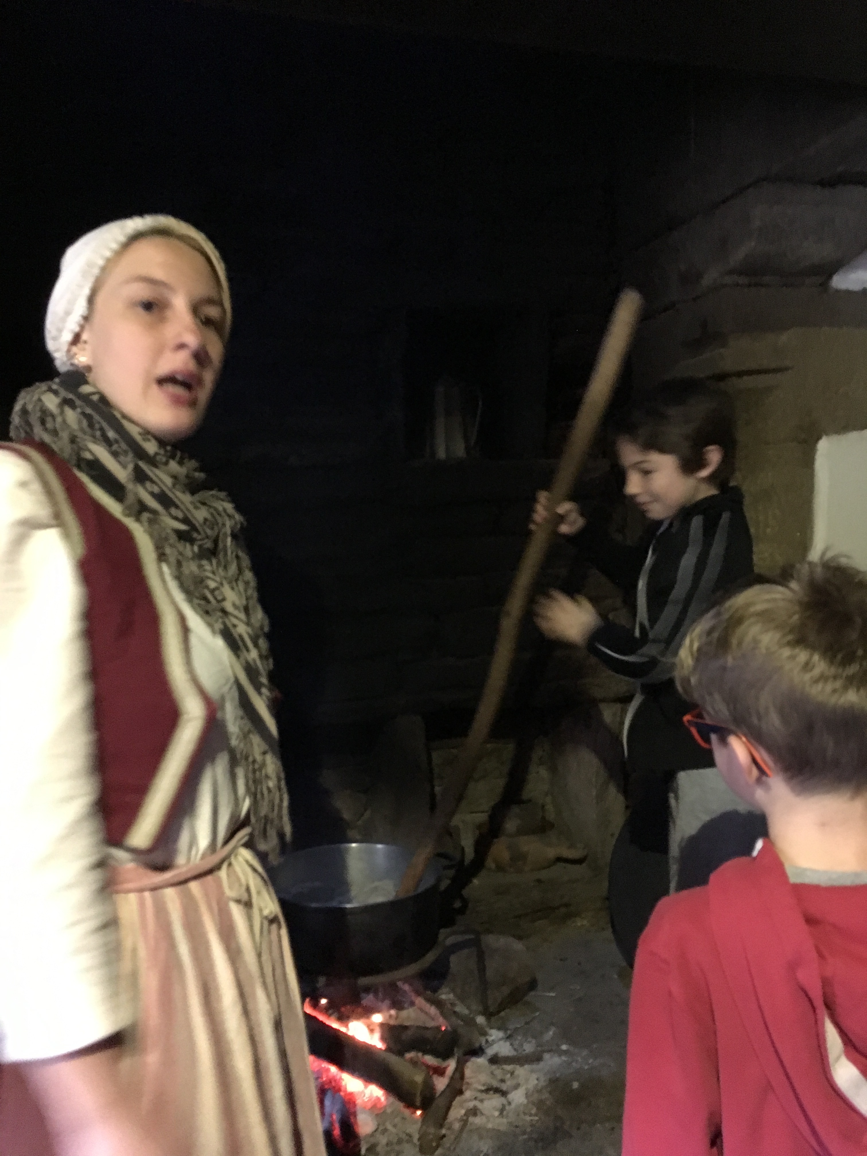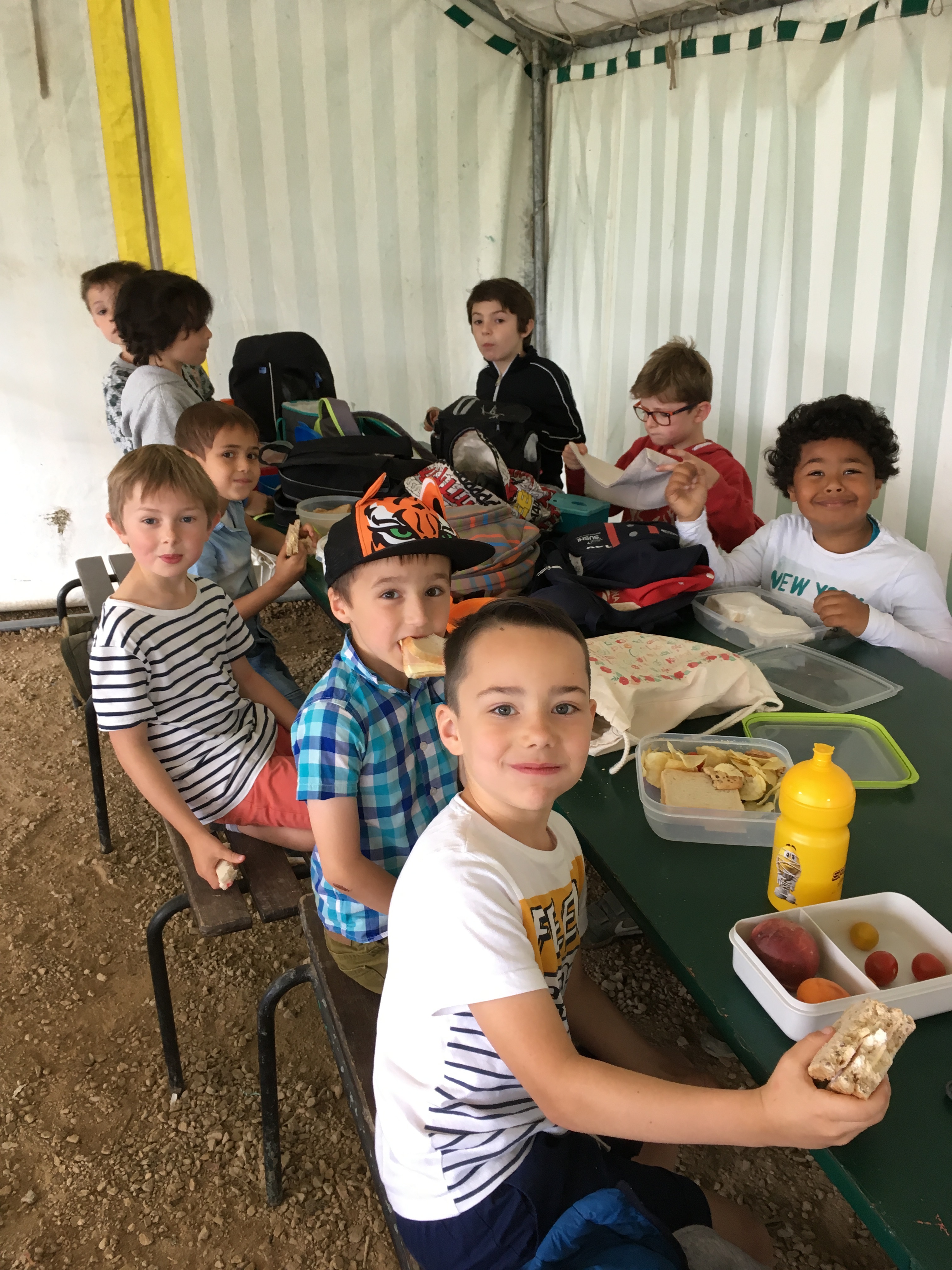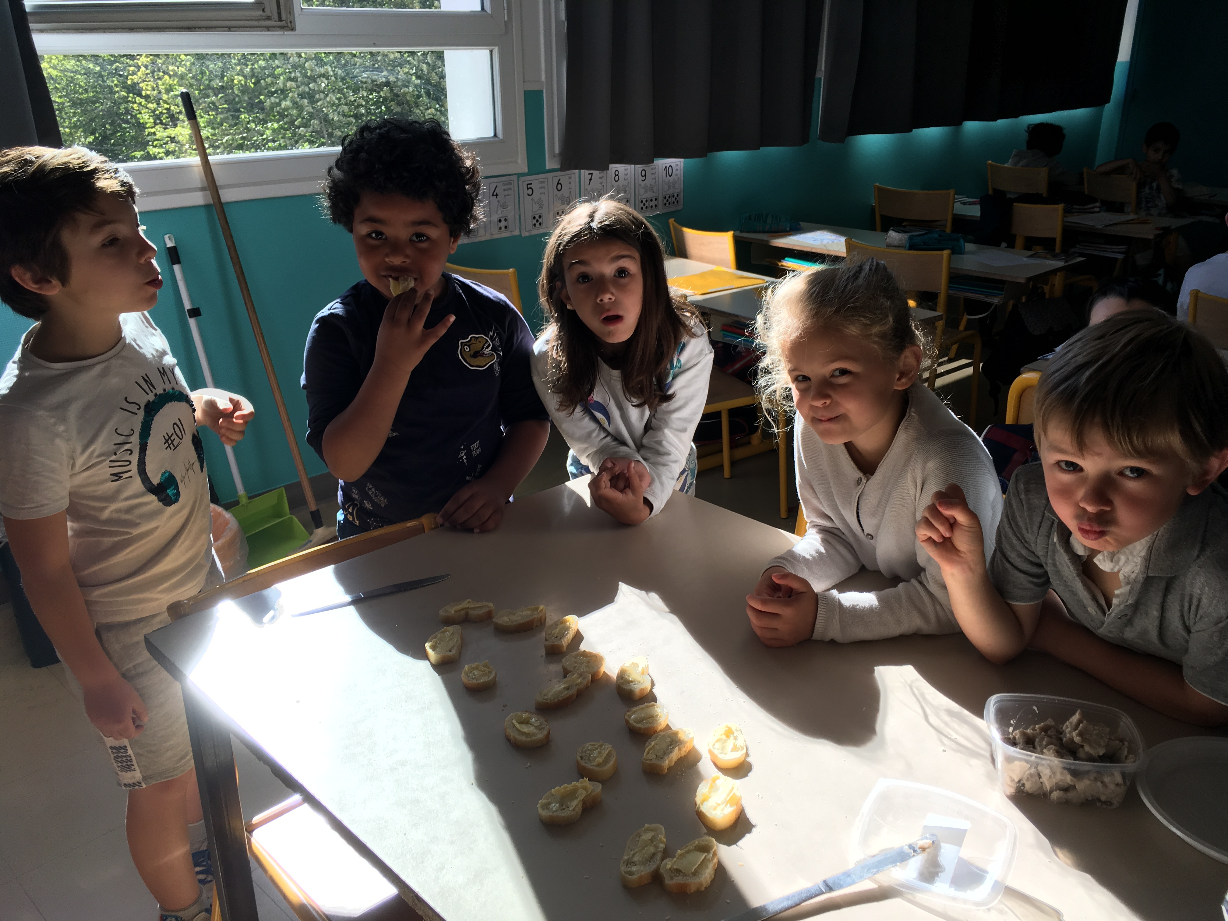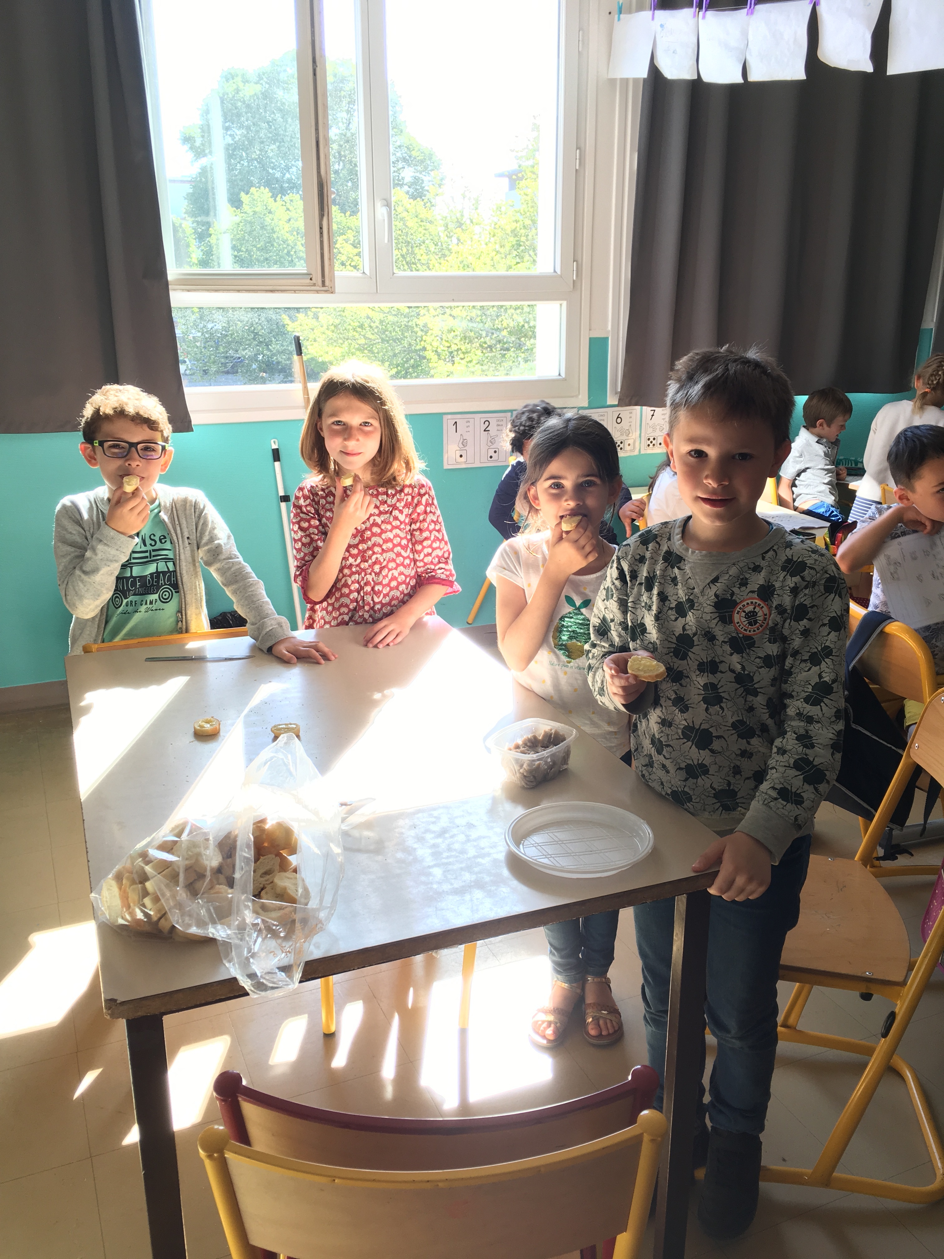 Puis les groupes ont été divisés, la classe de CP-CE1 et quelques CE2 sont partis découvrir la conception de la bouillie de blé noir et du beurre, chacun y a mis sa patte.