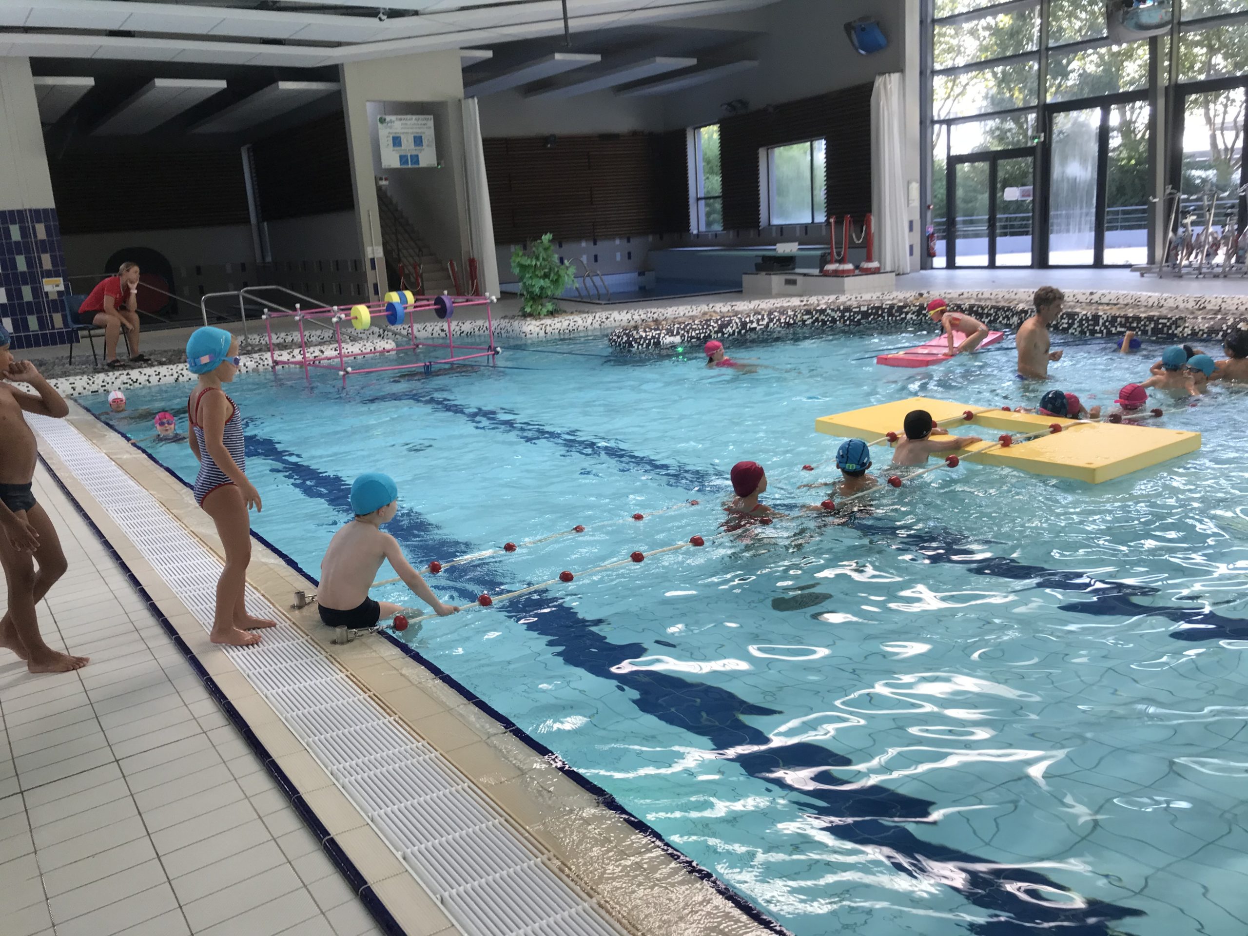 Les enfants apprennent à se familiariser avec le milieu : à rentrer dans l’eau (de face, de dos), à se déplacer, à s’équilibrer et à s’immerger.