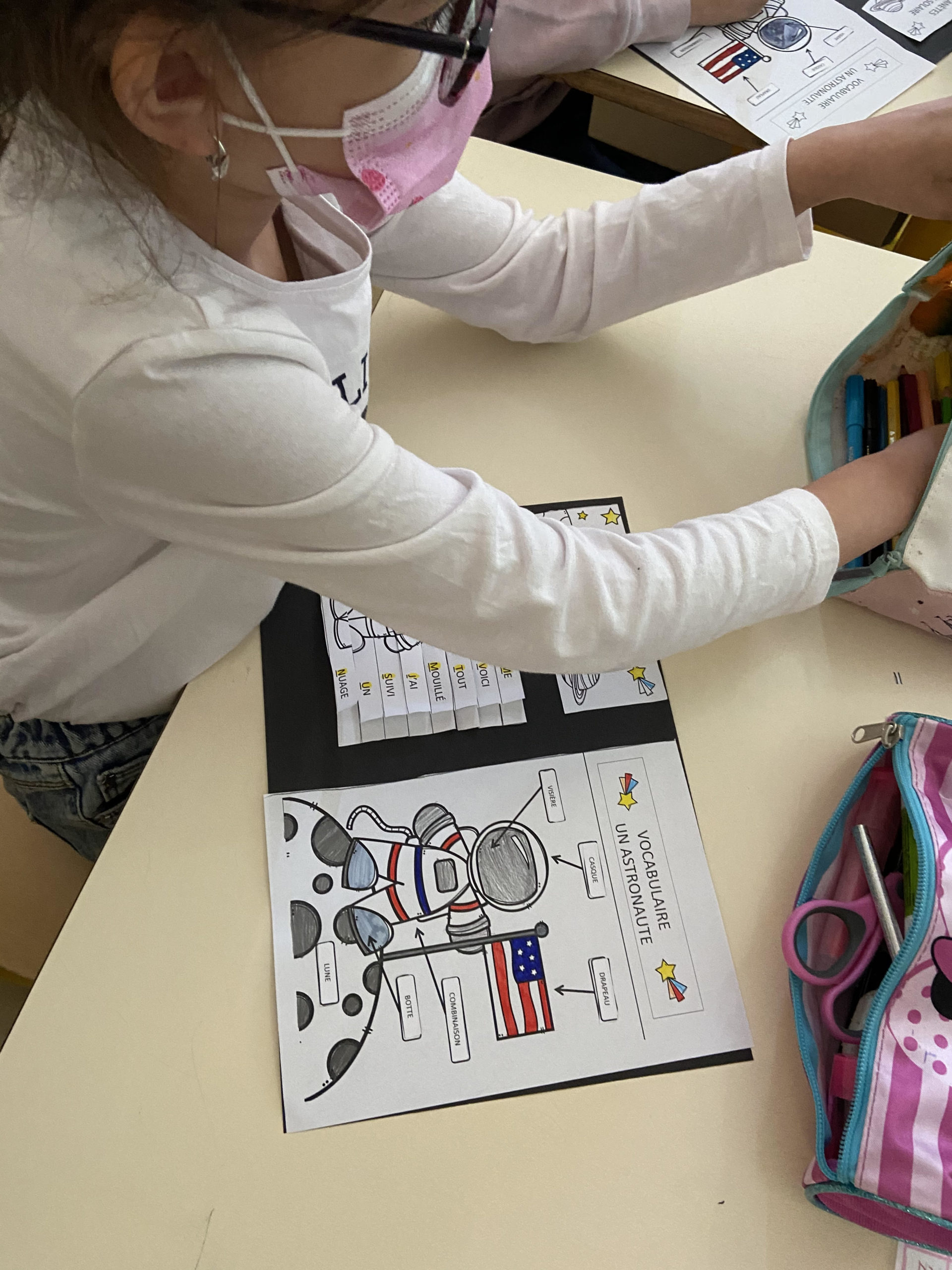 Nous avons travaillé sur le décollage de la fusée, son équipage, la vie quotidienne à bord de l’I.S.S et fabriqué notre système solaire. Nous suivons régulièrement les nouvelles données par Thomas Pesquet.