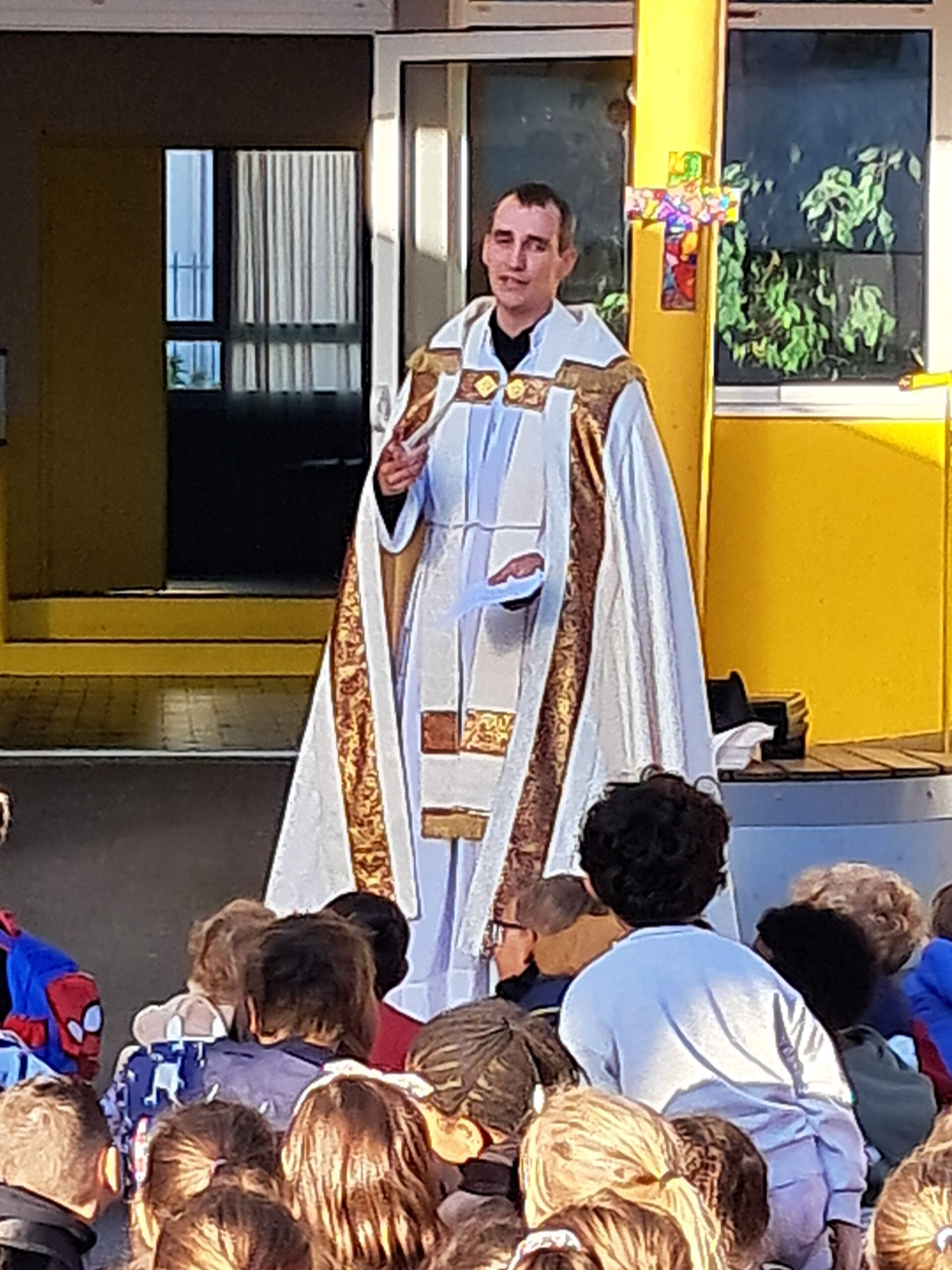 Mardi 17 septembre nous avons fait la bénédiction des cartables. Tous les élèves de l’école, les enseignants et le personnel sont sortis dans la cour avec leurs sacs et le père Jean-Hugues Petit les a bénis.