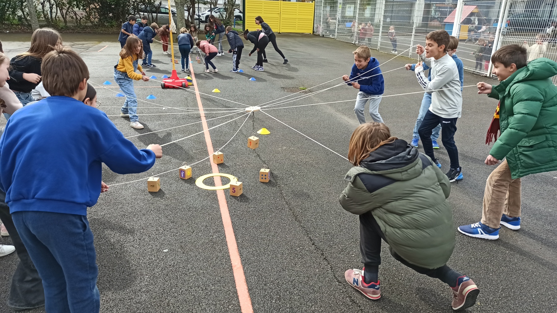 Dans un premier temps nous avons coopéré afin de former la « tour des nombres ». Nous avons formé un cercle et chaque joueur a reçu en fonction du nombre de participants, des cordes en main. Nous devions tendre en commun les cordes, la plaque devait être positionnée juste au-dessus des blocs en bois pour essayer de les accrocher avec le crochet au bout de la chaînette et de l’empiler.