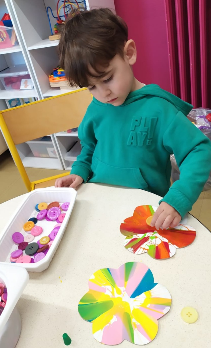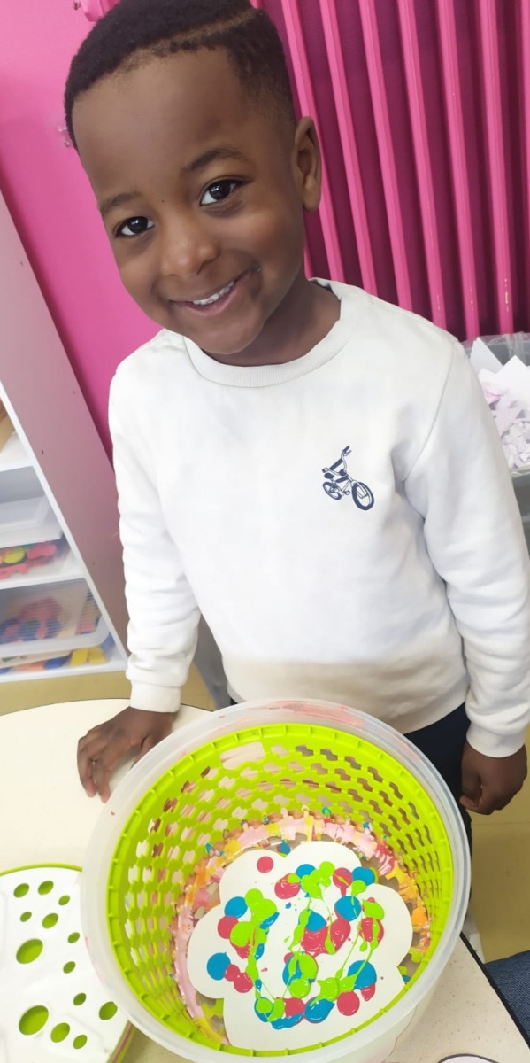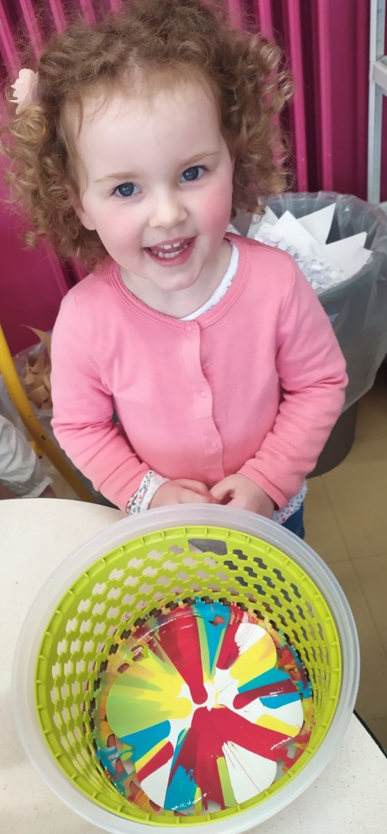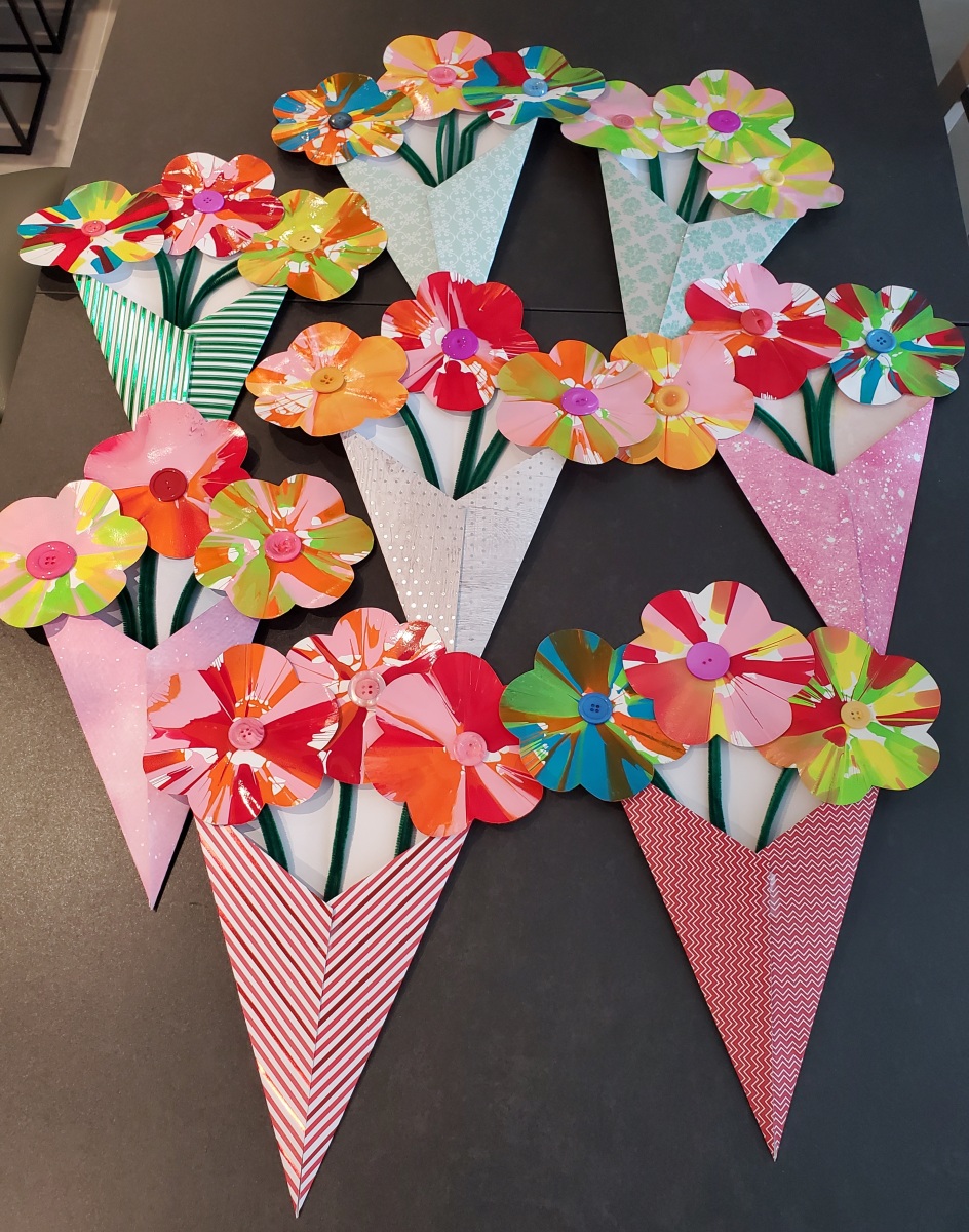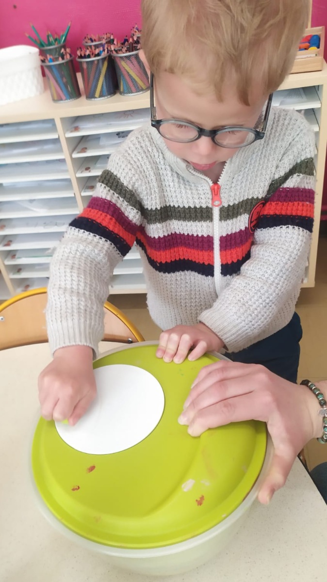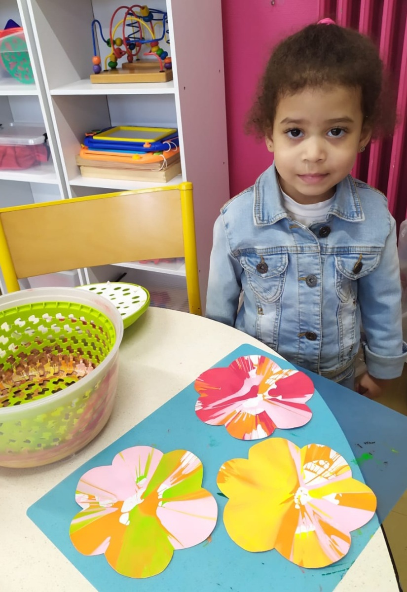 Les enfants de PS ont réalisé des fleurs en utilisant une essoreuse à salade et de la peinture.