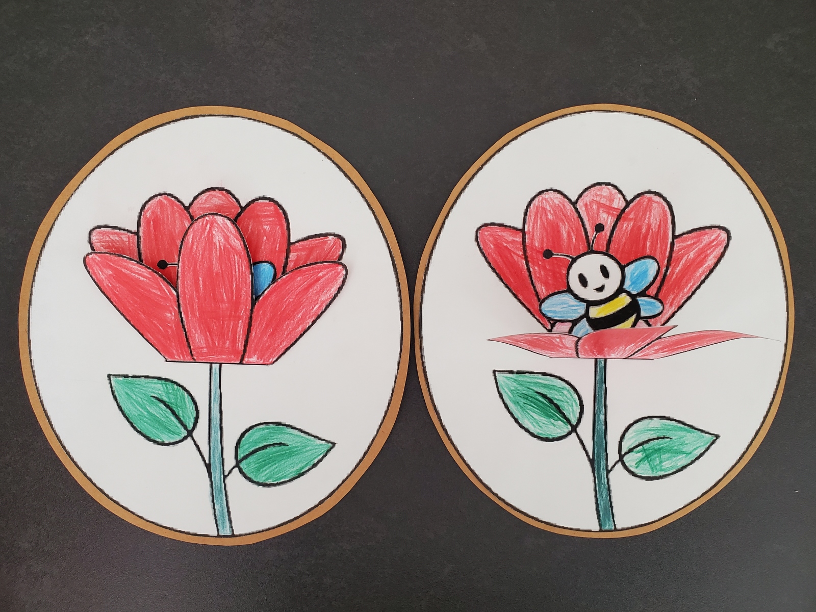 Les enfants de MS ont colorié une fleur qui, en s’ouvrant, laisse découvrir une abeille qui butine.