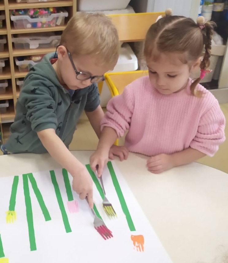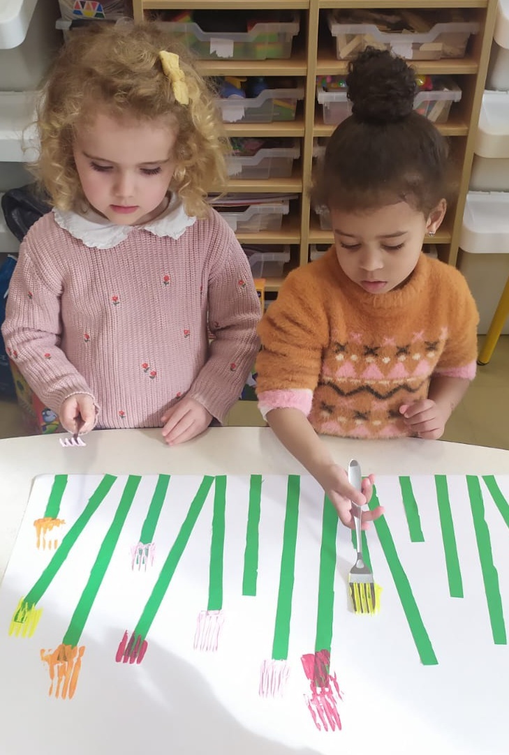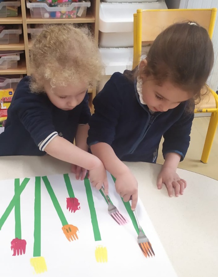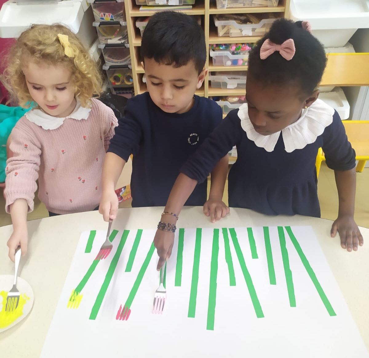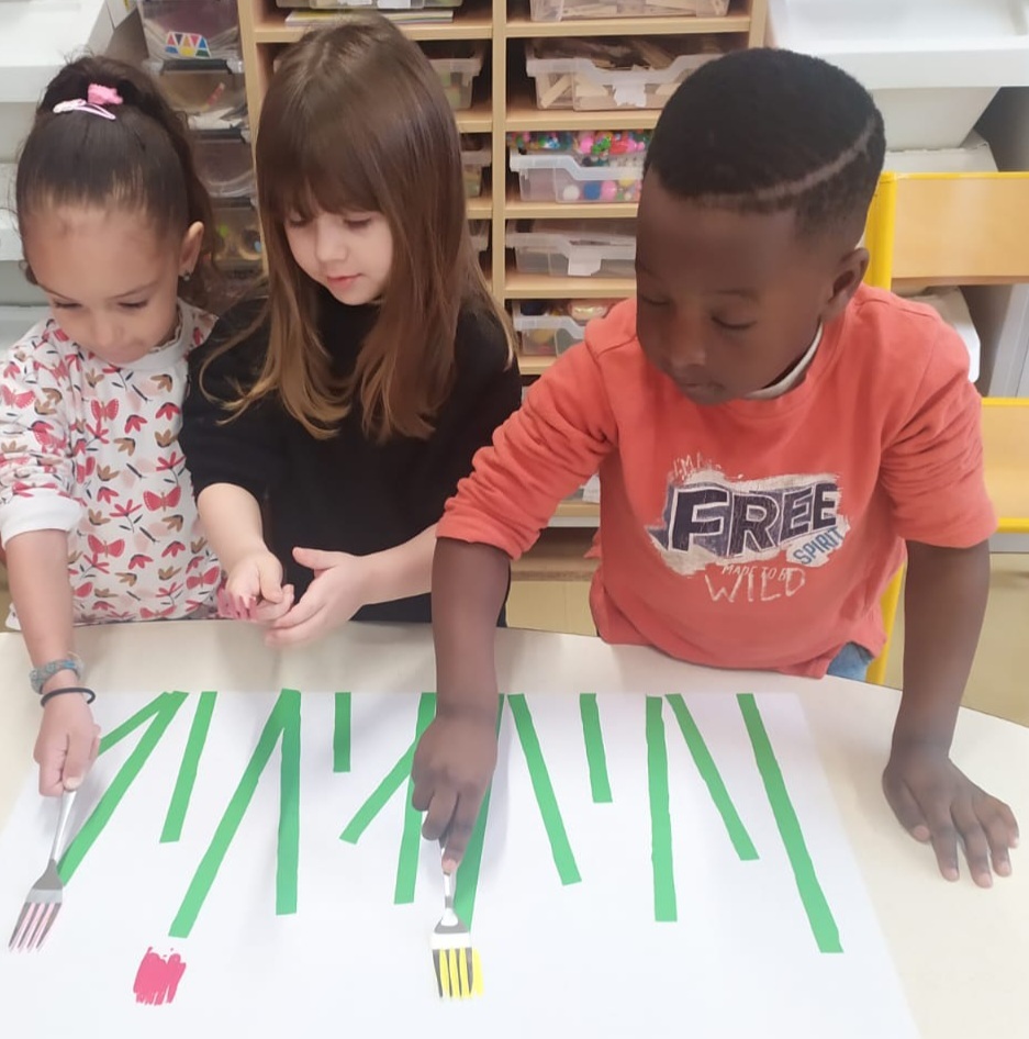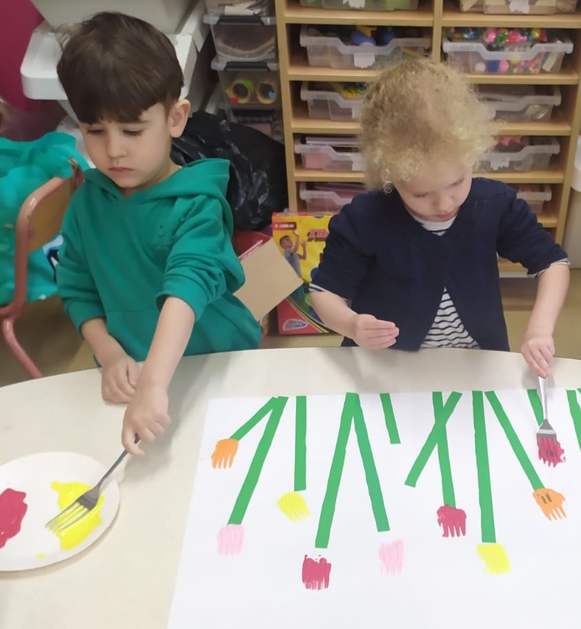 Les enfants de PS ont réalisé les pétales des fleurs en trempant une fourchette dans la peinture.