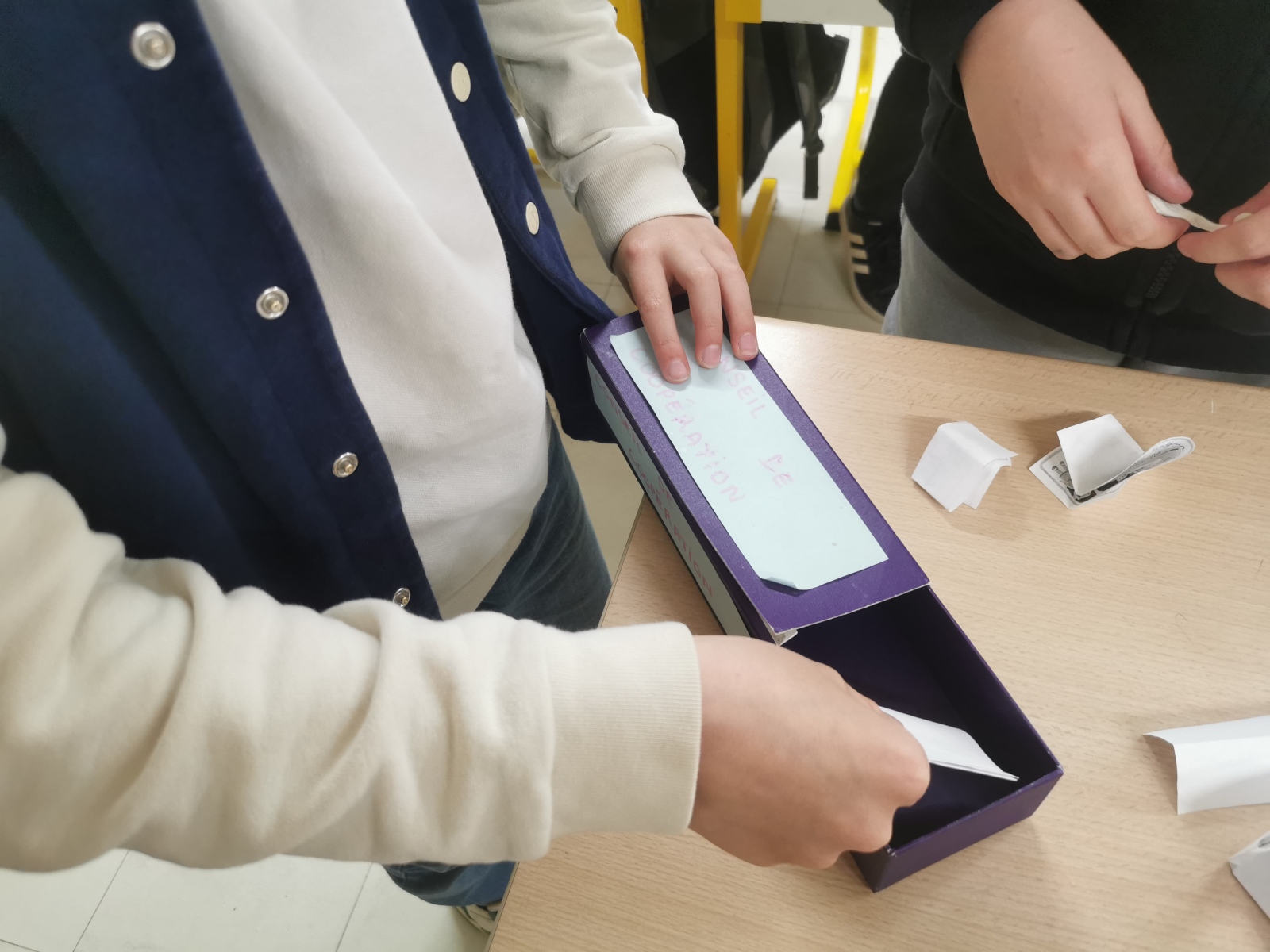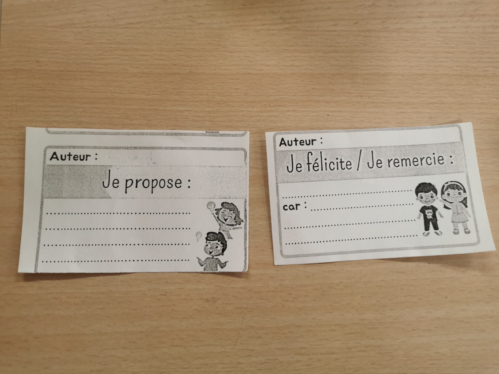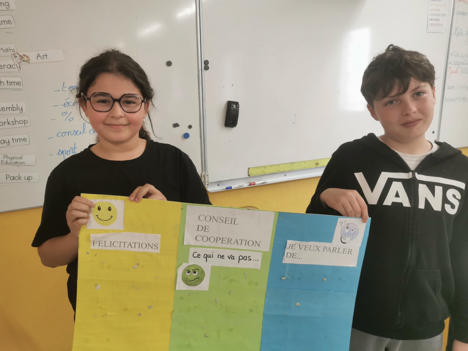 Le vendredi, 2 enfants sont désignés pour diriger le conseil de coopération. Les enfants s’expriment sur les mots de la boîte et nous échangeons tous ensemble afin de féliciter un élève qui a fait beaucoup d’efforts dans son comportement ou pour régler un différend ou encore mettre en place des projets dans la classe.