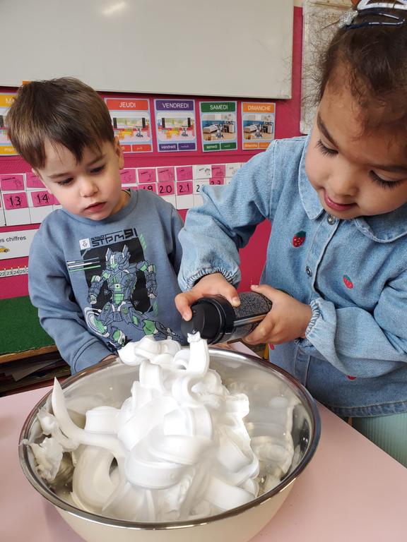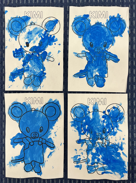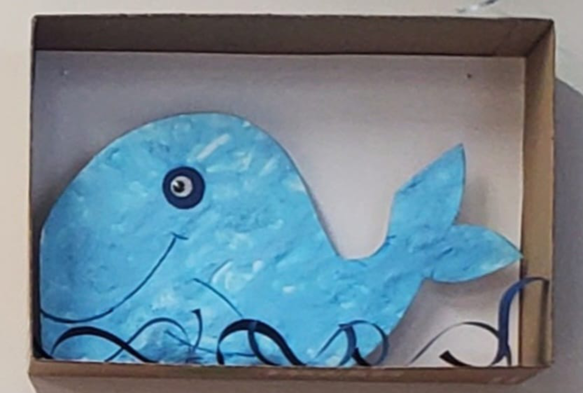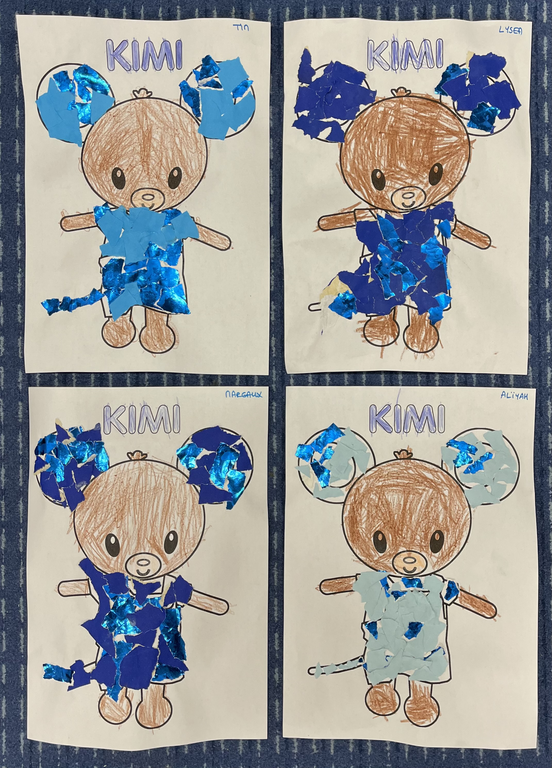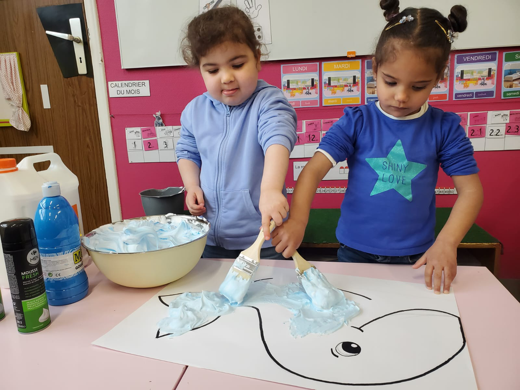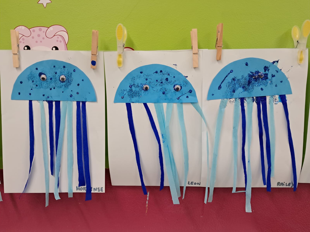 En arts visuels une baleine (mousse à raser, colle, peinture), des méduses, la mascotte Kimi (déchirer et coller, peindre).