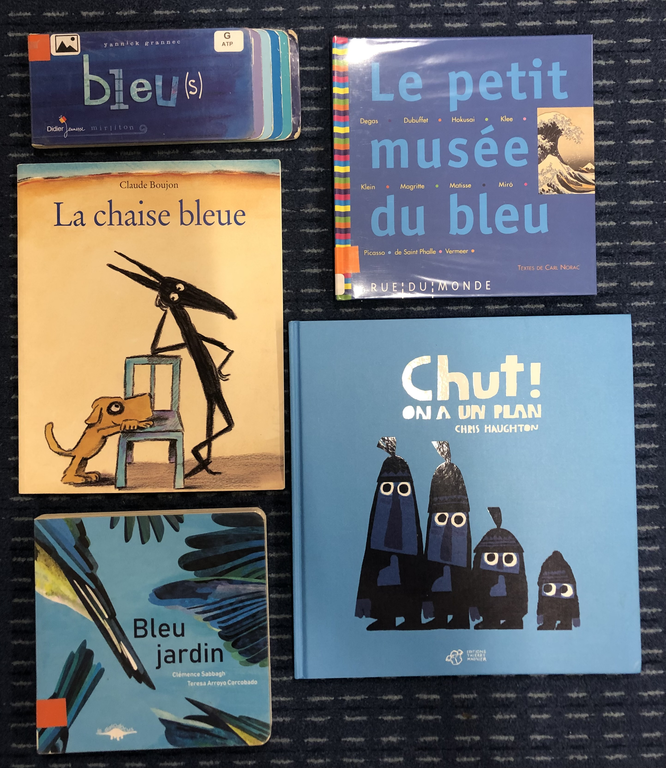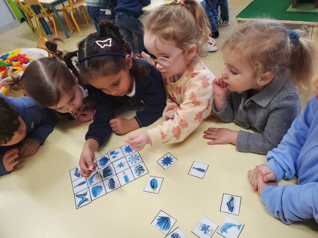 Des lectures, des tris d’objets bleus parmi d’autres couleurs, des lotos et mémorys, des colliers de perles bleues.