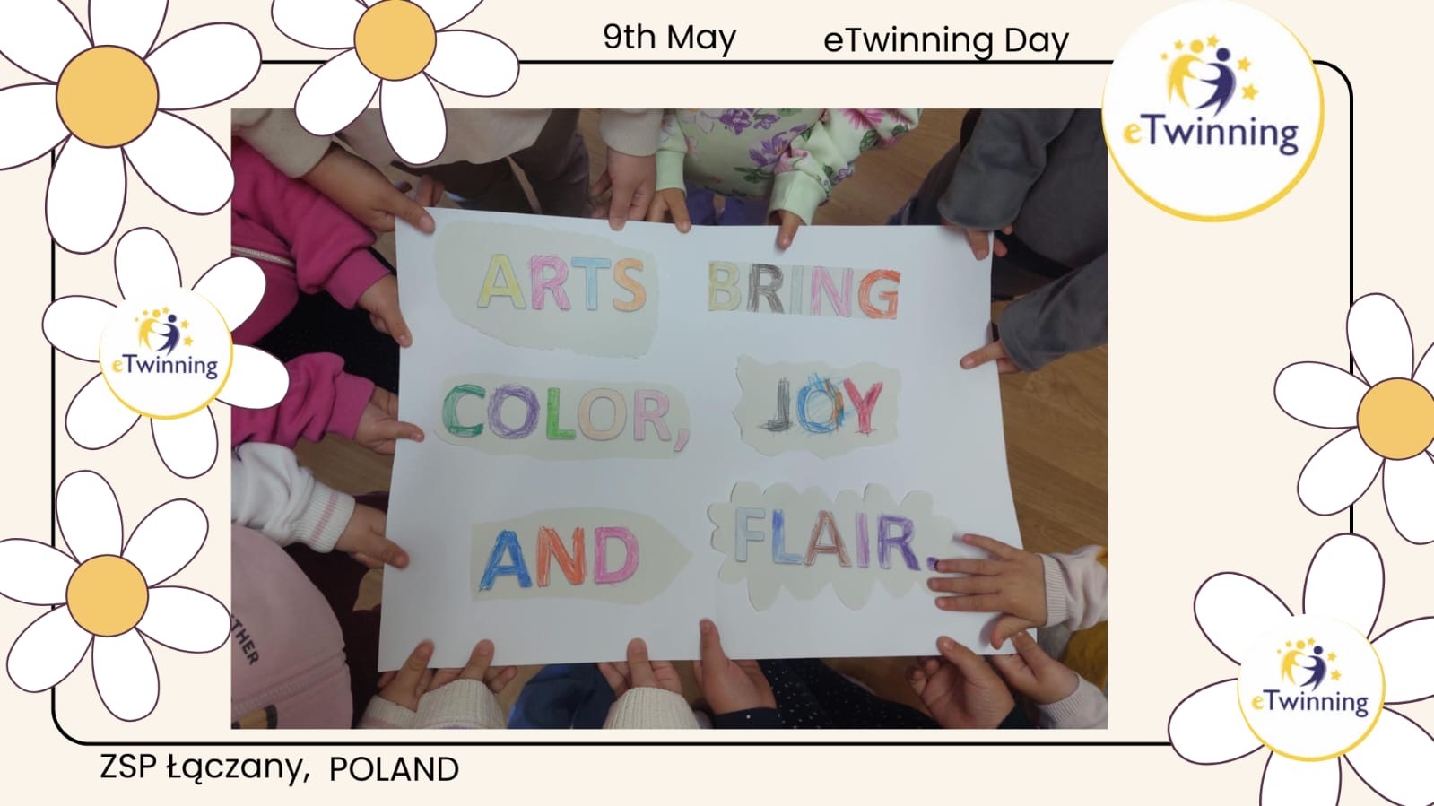 Pour préparer la Journée eTwinning du 9 mai, nous avons réalisé des affiches sur chaque pays partenaire et réfléchi à une phrase qui représente nos valeurs, traduite ensuite avec l’aide de la maîtresse.