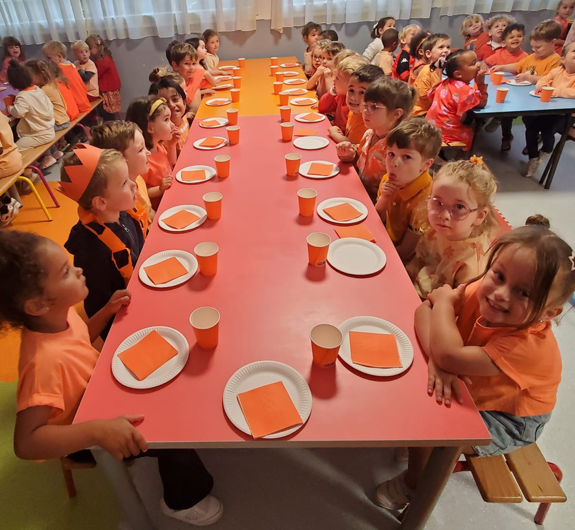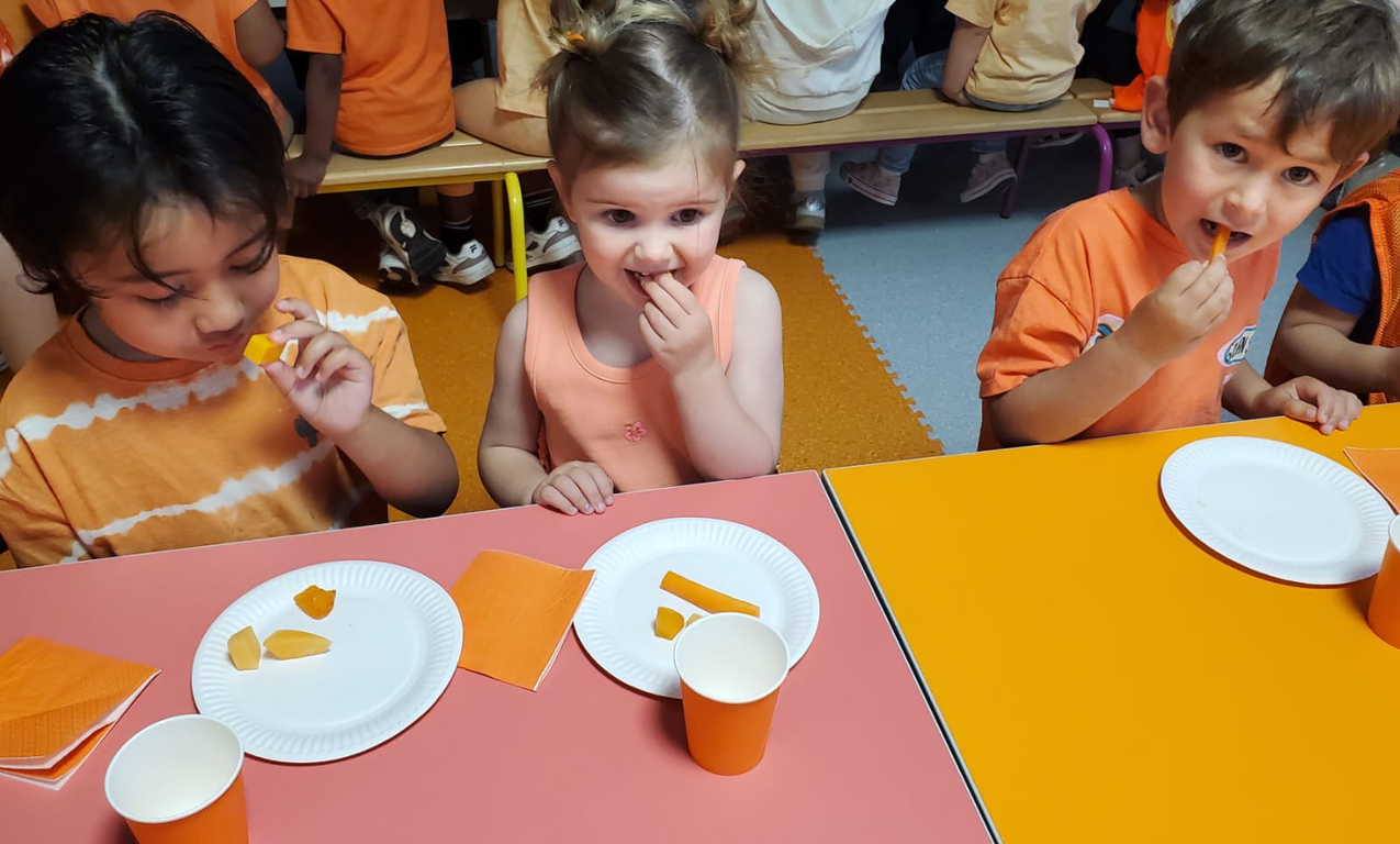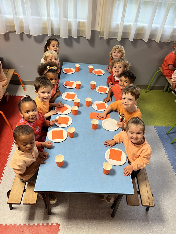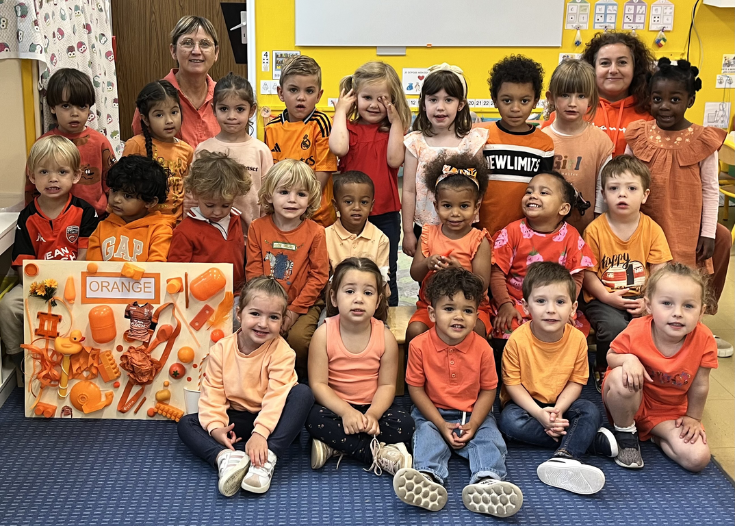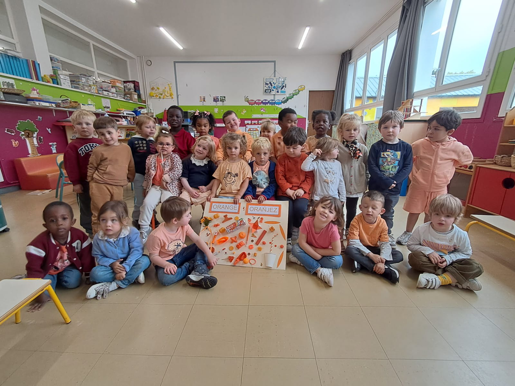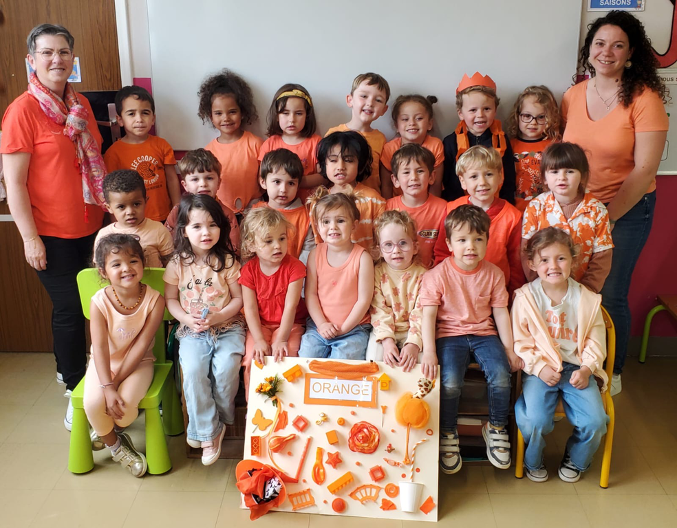 Jeudi dernier 5 juin, les élèves des classes de TPS-PS des classes de Mmes Kerisac, Danet et Guillaume se sont rassemblés pour célébrer la dernière journée d’un projet d’année sur les couleurs. Celle-ci portait sur le orange.