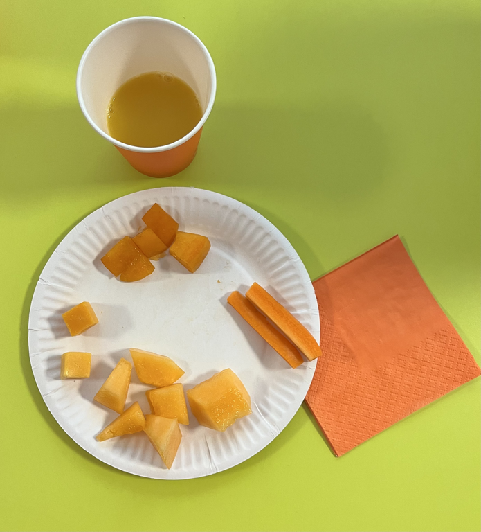 - goûter: du melon, des carottes, de la mimolette, des abricots, du jus d’orange