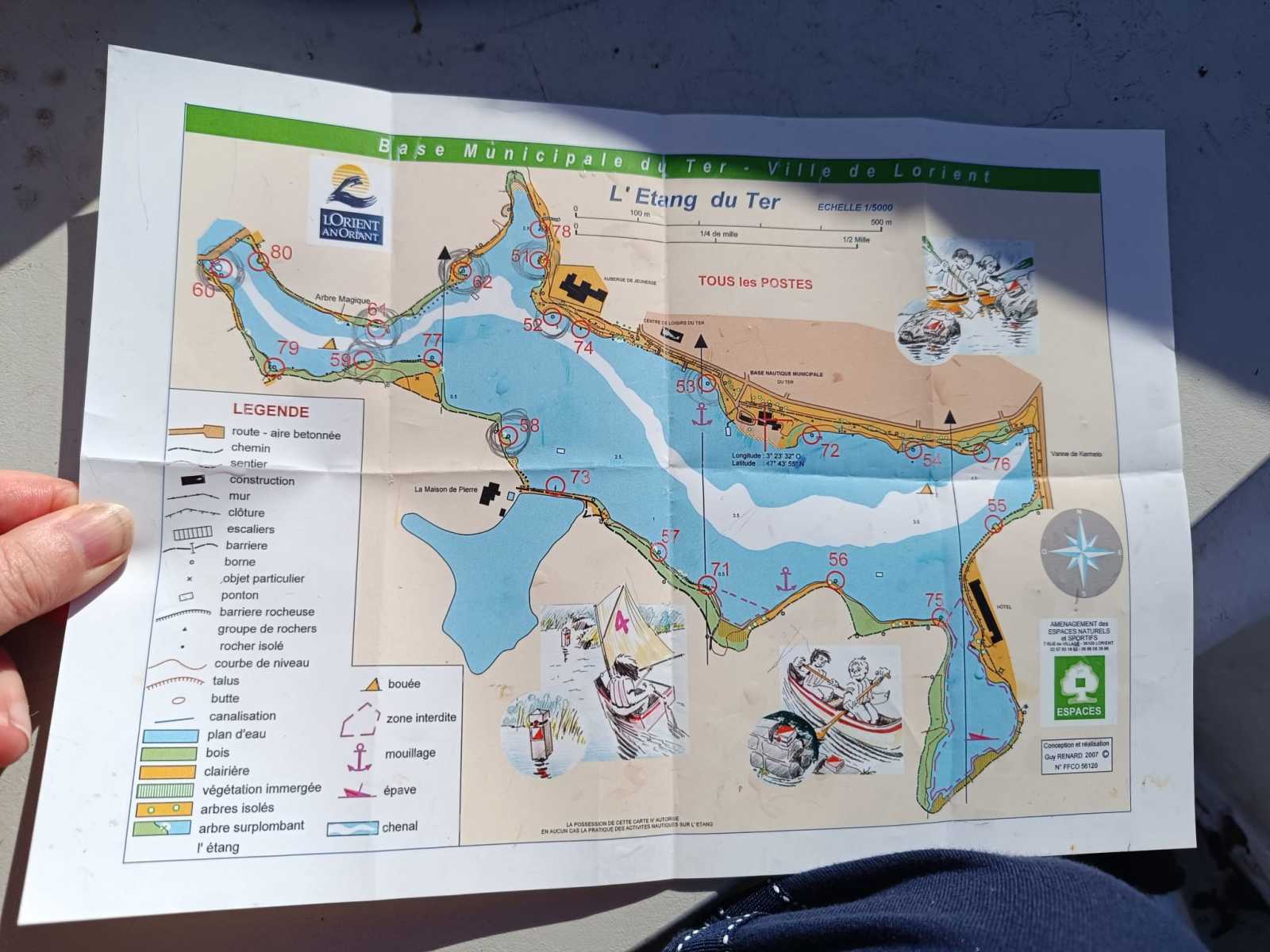 Pour notre dernière séance à la base nautique du Ter, mardi 7 octobre 2025, nous avons dû nous adapter une nouvelle fois à la météo. Toujours pas de vent donc, course d’orientation à la rame. Par équipe de deux ou trois, nous avons repéré des balises disséminées par les moniteurs autour de l’étang. Une fois poinçonnées, nous devions rejoindre le moniteur pour qu’il valide le repérage et nous indique une balise suivante. Parcours réalisé à l’aide d’une carte marine. Pas si simple !