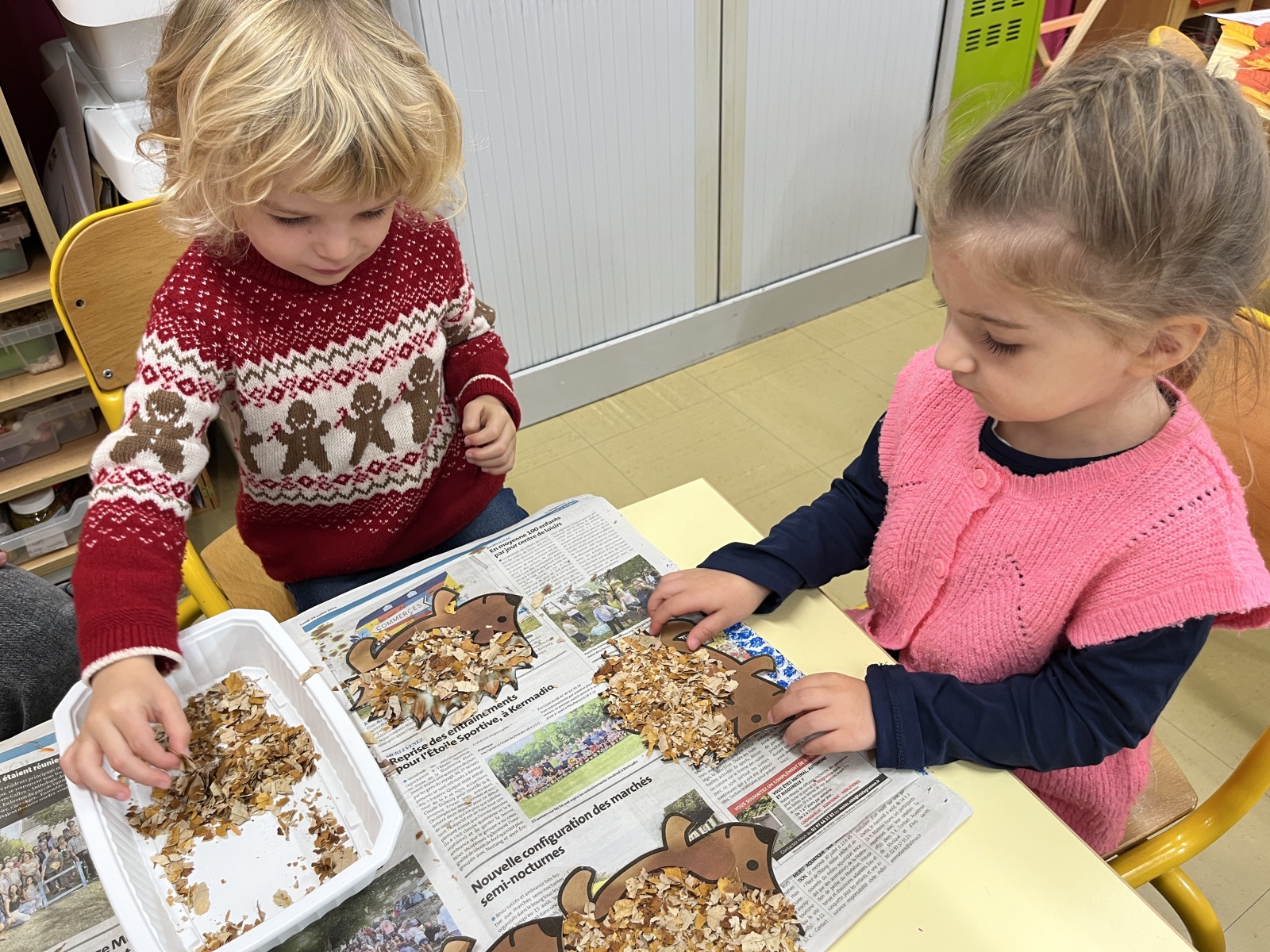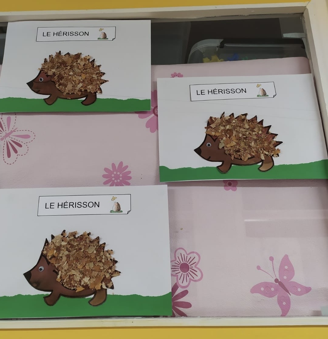 • émietter des feuilles d’arbre pour confectionner un hérisson.