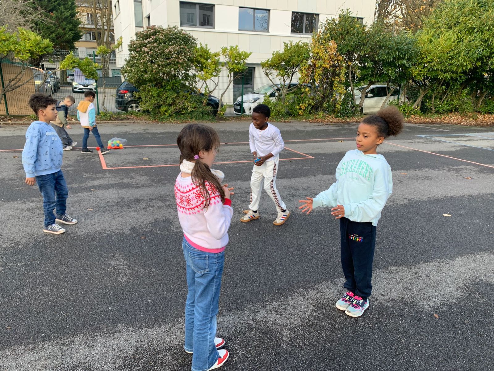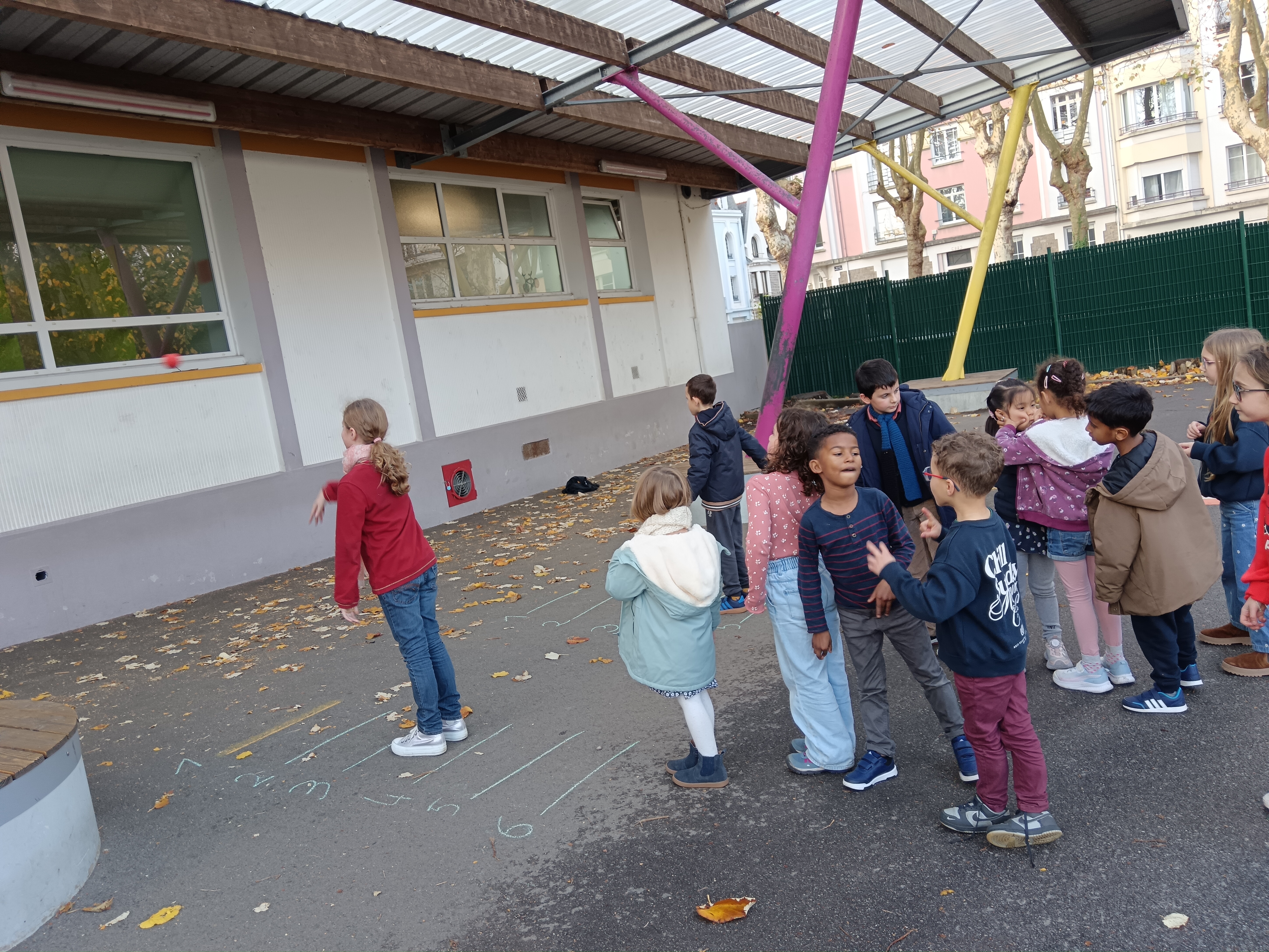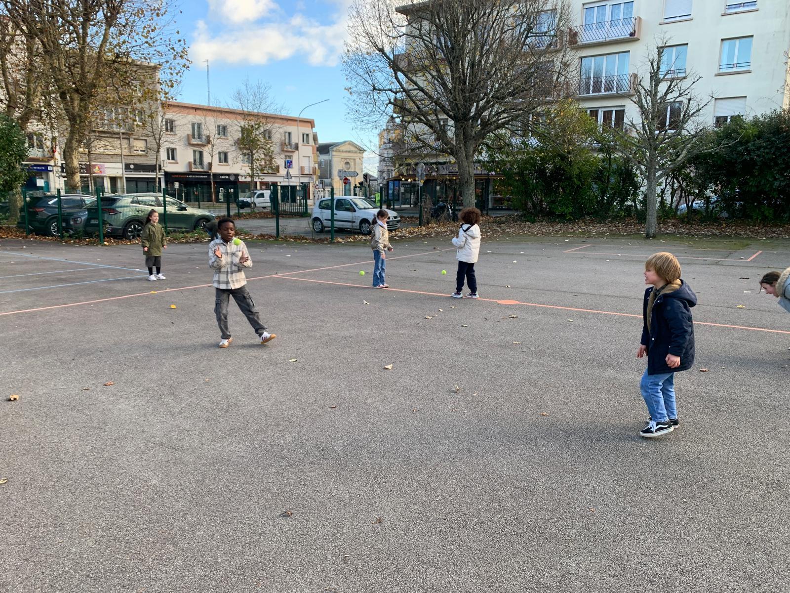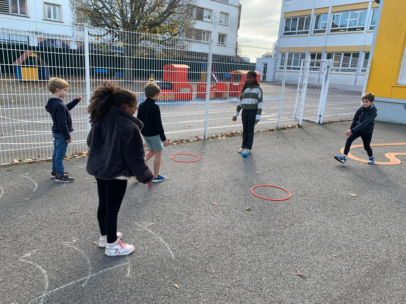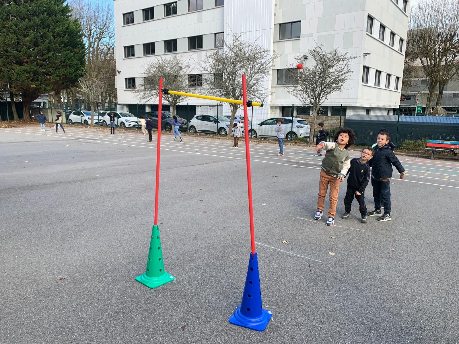 Pour favoriser la coopération et l’entraide, les enfants sont répartis en quatre groupes mixtes, mélangeant les deux classes. À tour de rôle, ils découvrent différents types de lancers adaptés à leur âge : lancer de précision, lancer loin, lancer en hauteur… Chaque atelier permet d’apprendre en s’amusant et de progresser à son rythme.