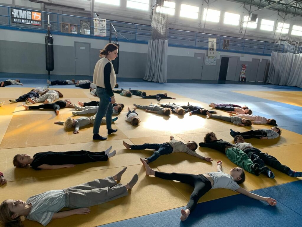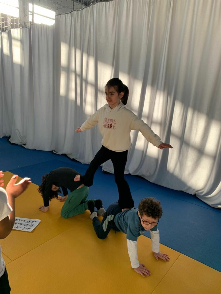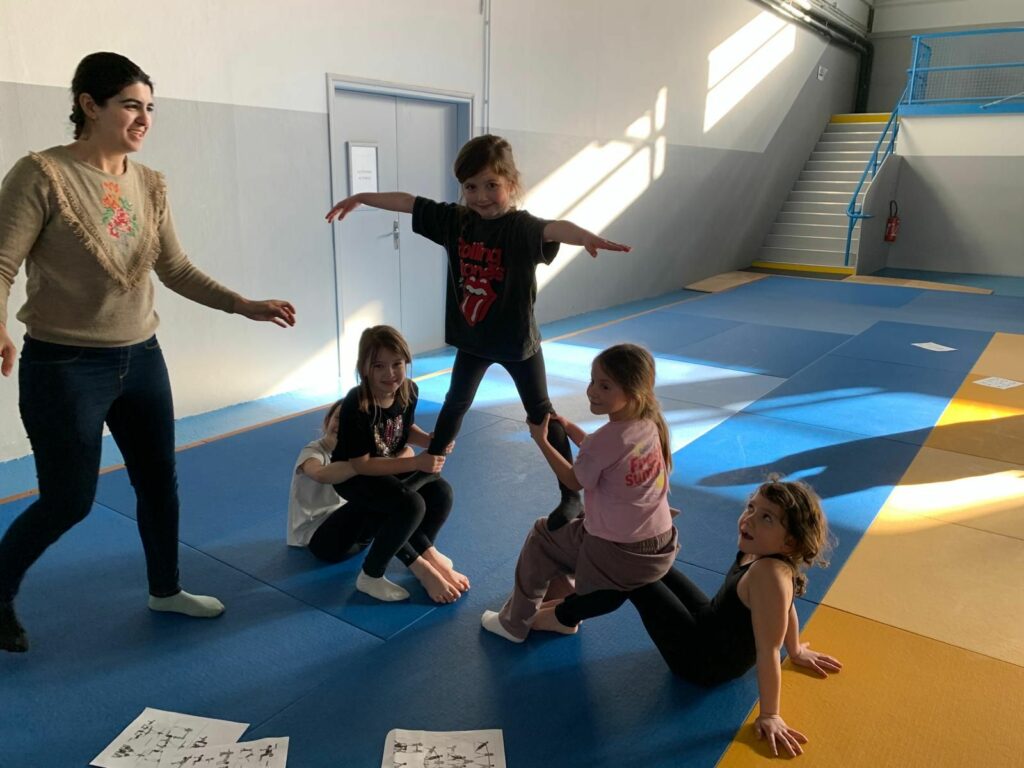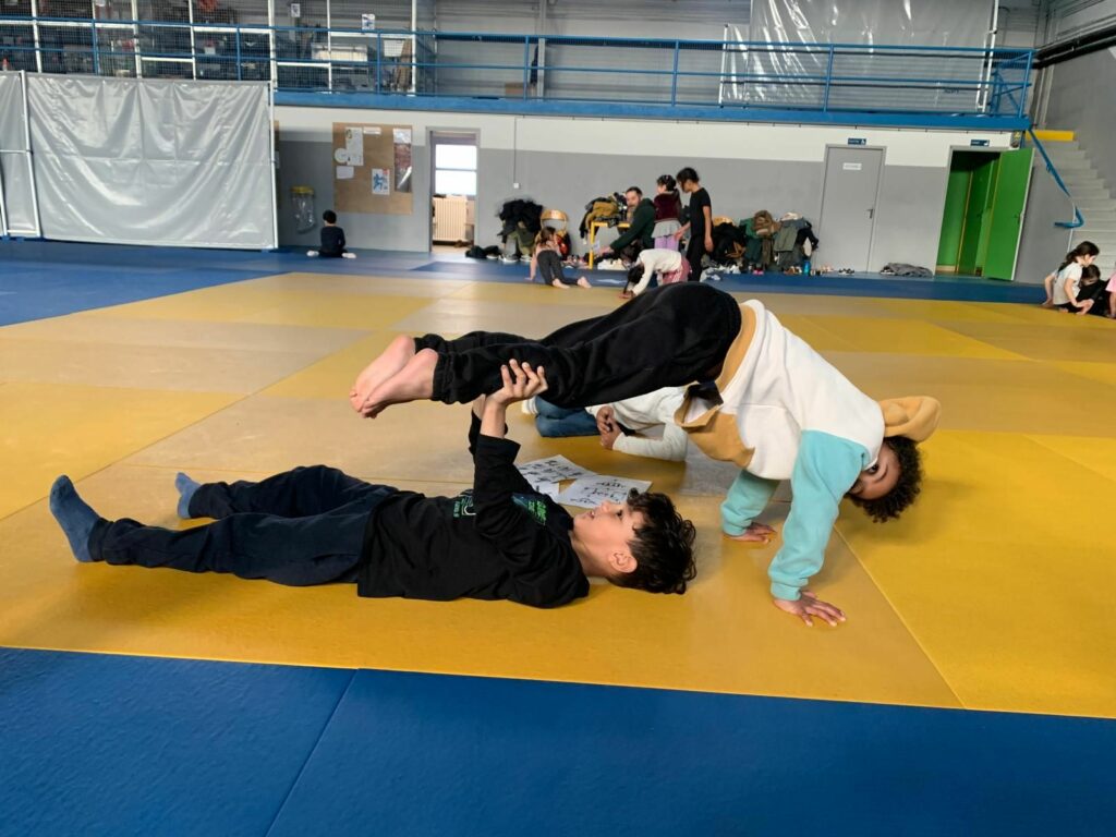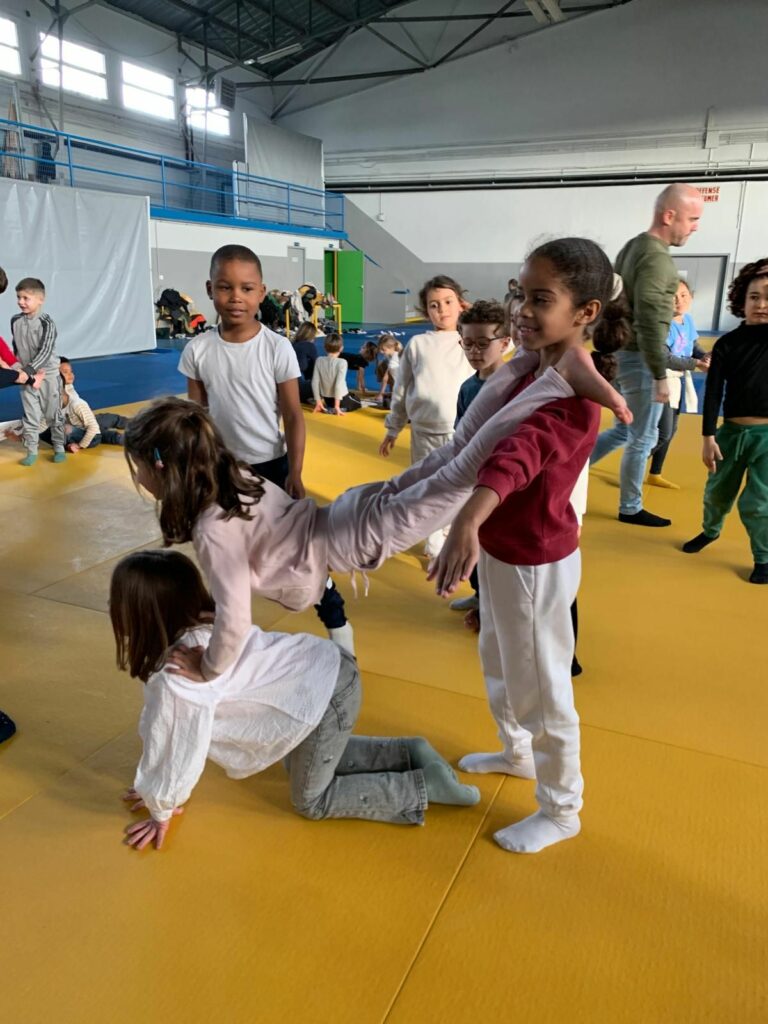 Les classes de CP et de CP-CE1 se sont rendues au dojo de Kersabiec afin de réaliser une séquence d’acrogym, une activité mêlant mouvements doux, respiration et relaxation.