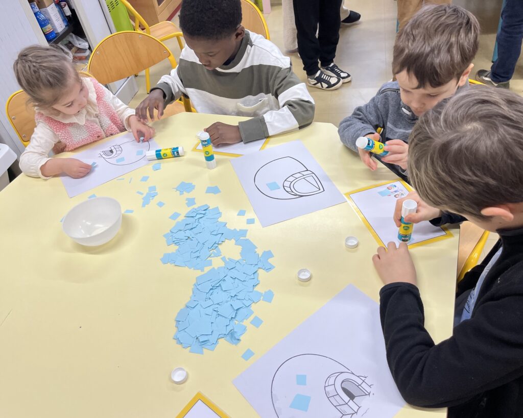 Autour de la fresque, petits et grands ont collaboré avec enthousiasme : peinture, découpage, collage, coloriage… Les élèves ont même fabriqué des icebergs en volume pour donner du relief à leur création ! Les plus âgés ont accompagné les plus jeunes avec attention, les aidant à manipuler le matériel et à exprimer leurs idées.