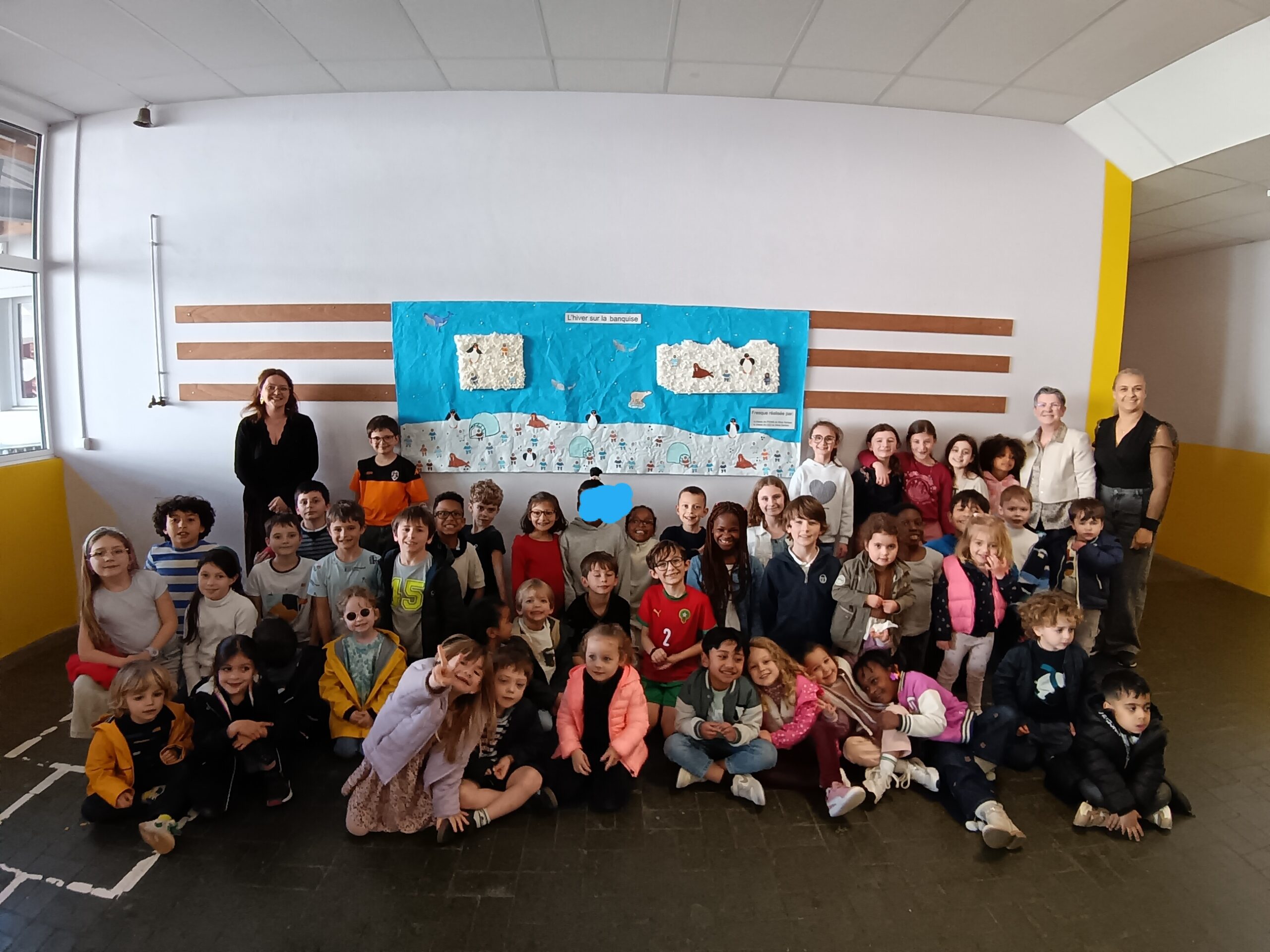 Les élèves de CE2 de Mme Derrien et les élèves de PS‑MS de Mme Kérisac ont uni leurs talents pour créer une magnifique fresque collective sur le thème de l’hiver.