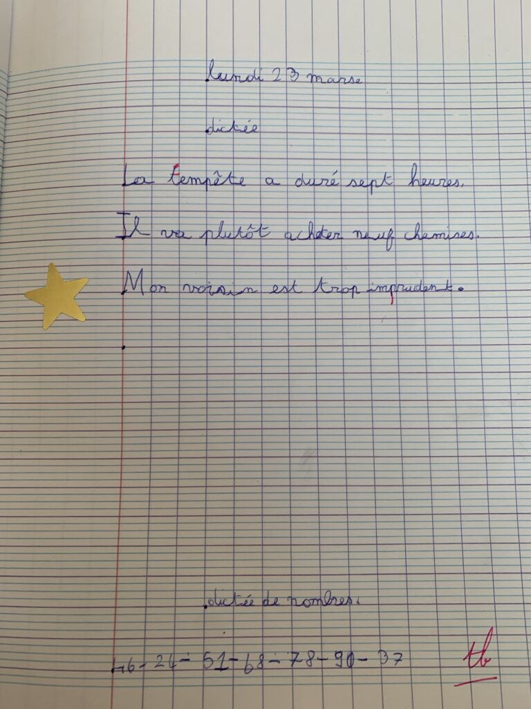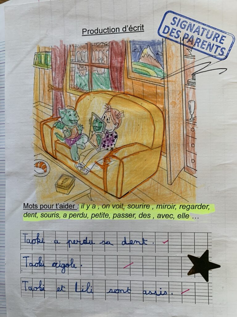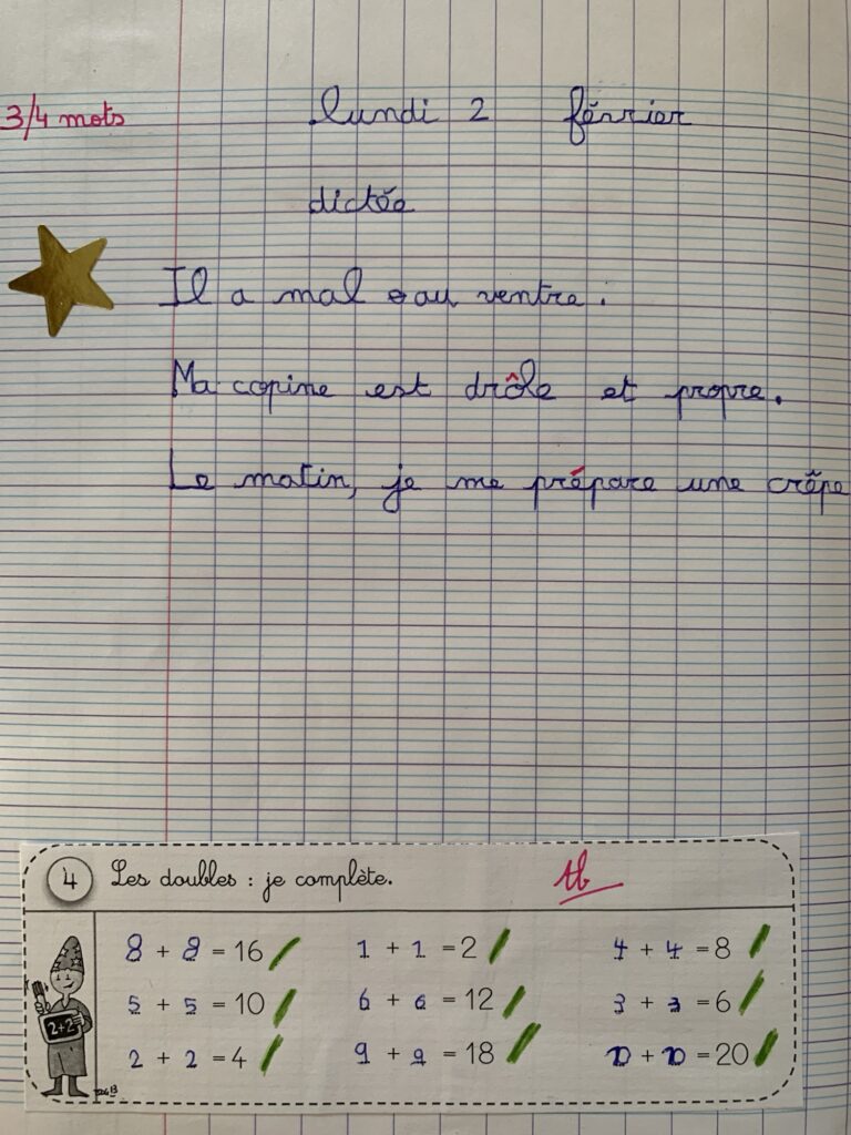 En lecture, nous utilisons une méthode syllabique, permettant à chaque enfant de construire pas à pas des bases solides. Cette rigueur se retrouve également dans les activités de copie et de dictée, où les élèves apprennent à écrire avec soin, à respecter l’orthographe et à produire des phrases correctes.