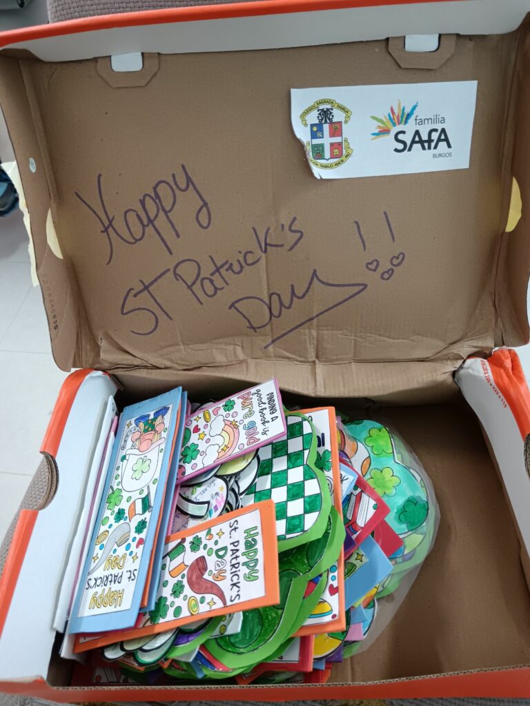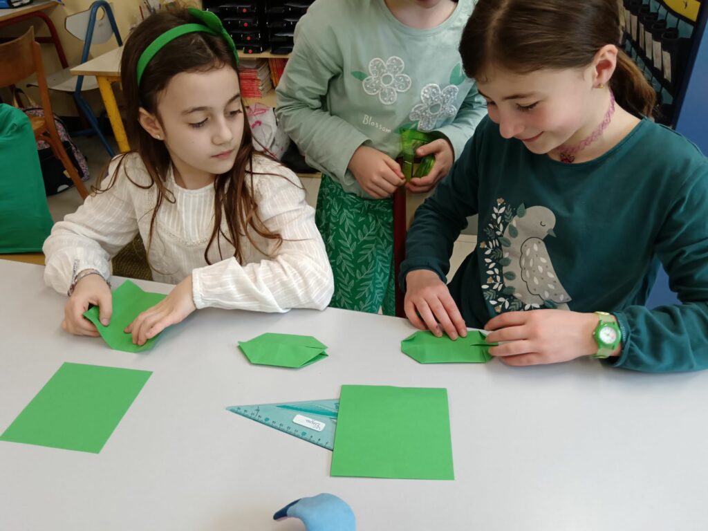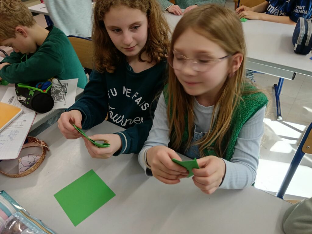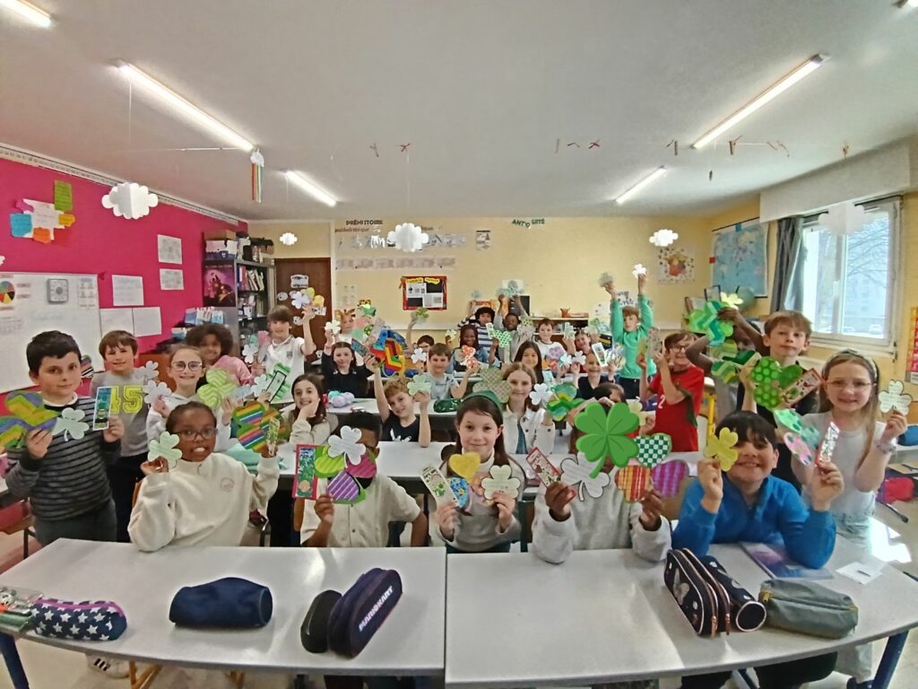 Ils ont réalisé avec enthousiasme des trèfles en origami ainsi que des marque-pages décorés, avant de les envoyer à nos correspondants espagnols et polonais.