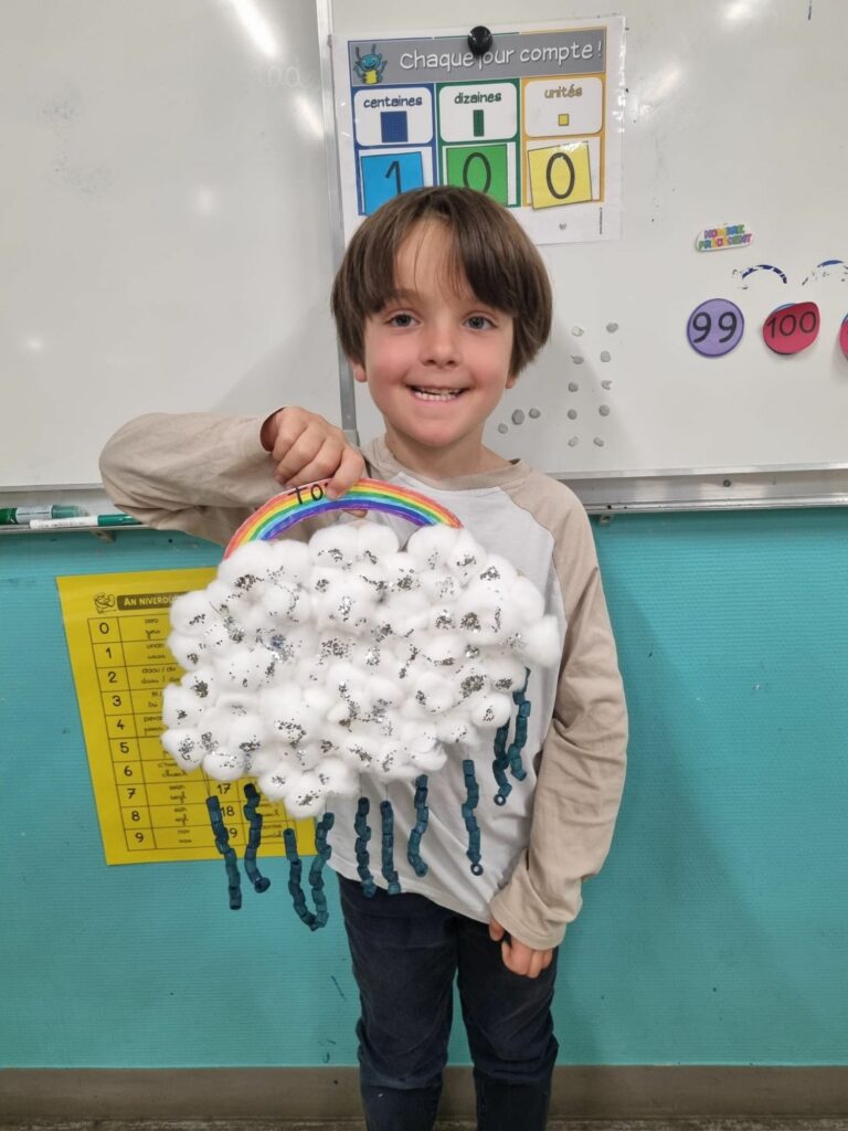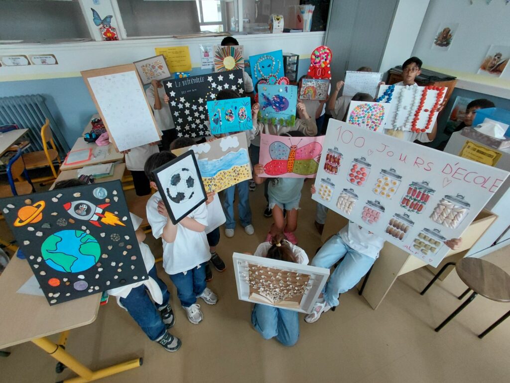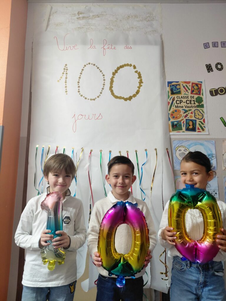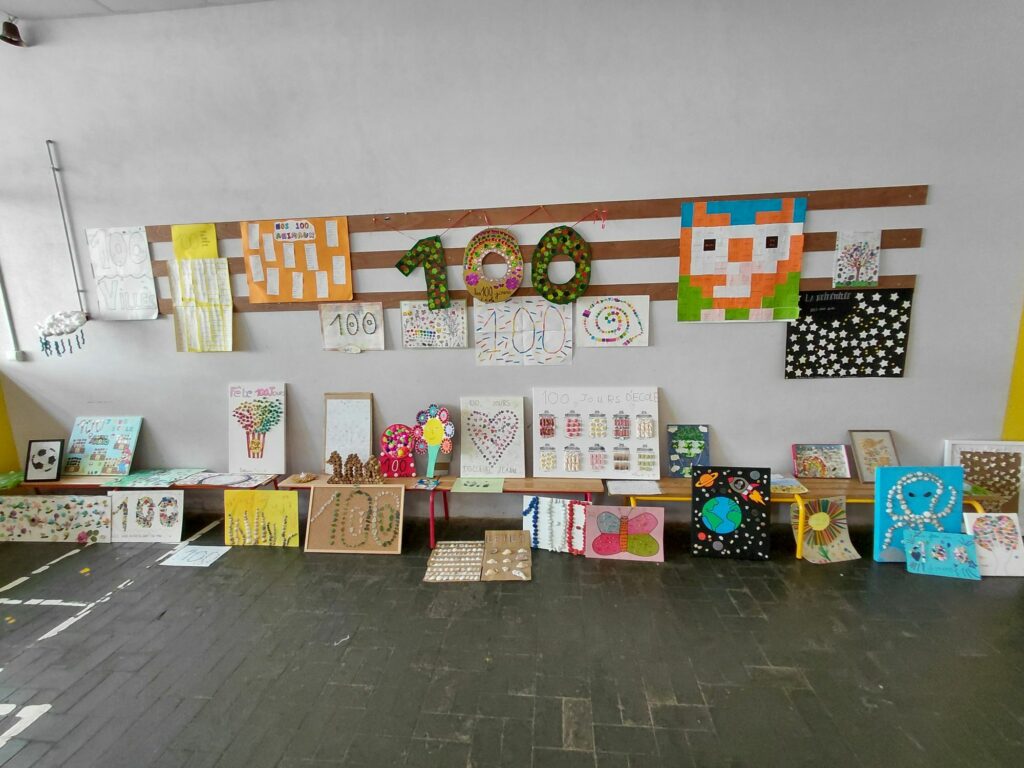 Les élèves de GS-CP-CE1 de Mme Bouin, Mme Dangy et Mme Vautrin ont célébré le 100ᵉ jour d’école lors d’une journée spéciale. Chacun avait apporté une collection ou une réalisation composée de 100 objets, exposée en classe.