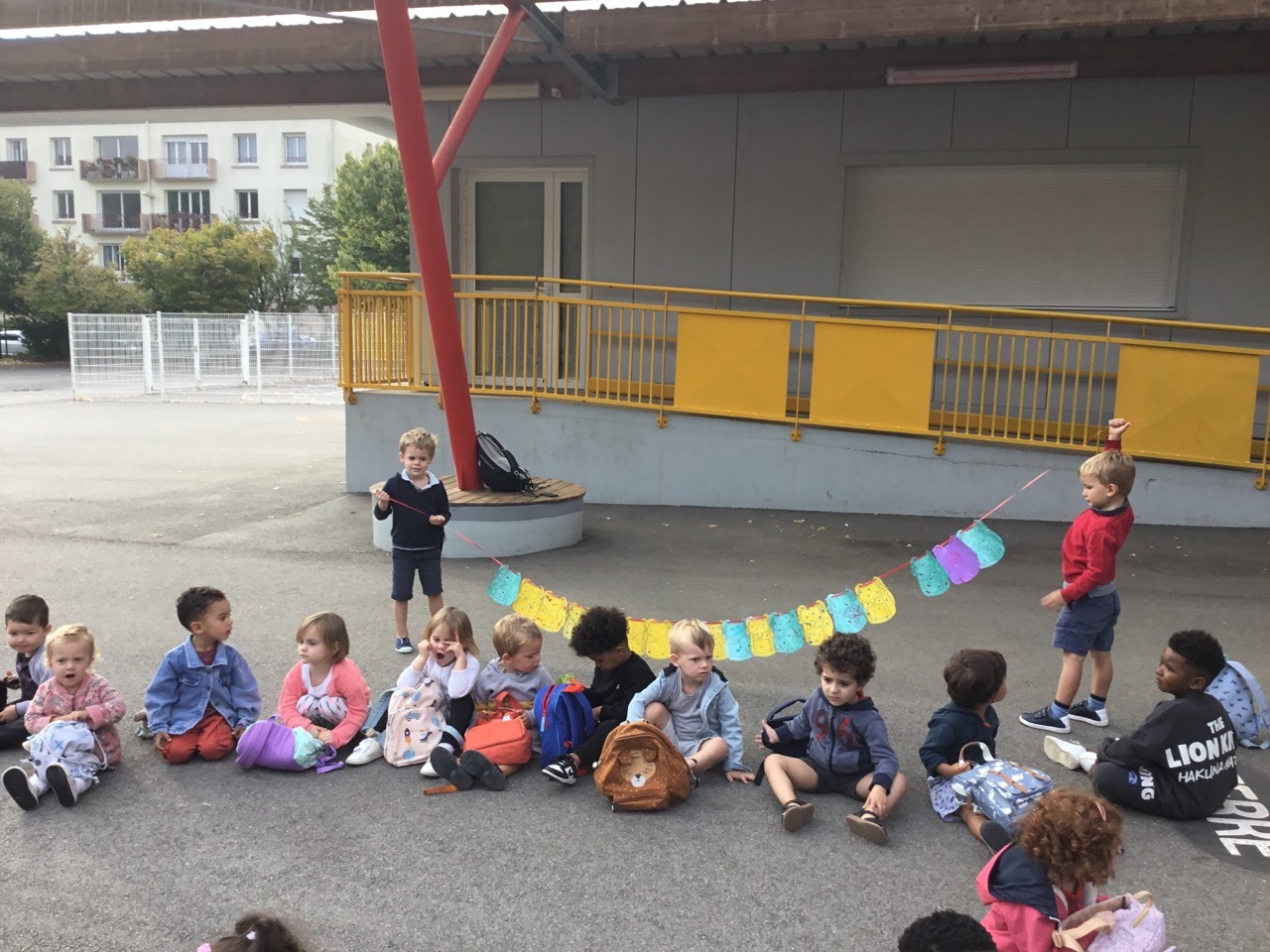 Les touts-petits et petits de la classe bilingue ont décoré leur guirlande de cartables pour assister à la bénédiction qui